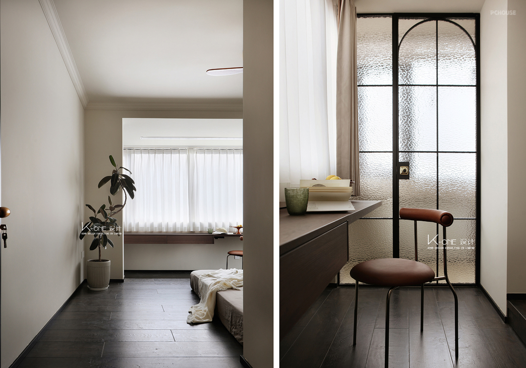 柔和的自然光透过窗帘洒落,营造出温馨的氛围。绿植的点缀不仅增添了生机,也让人感受到大自然的气息。玻璃门的细致纹理与木质家具的温暖相结合,体现出独特的现代感与品质感。干净利落的线条让空间显得更为开阔,适合工作和思考的理想环境。在这里,每一个细节都仿佛在传达着生活的宁静与优雅,让人沉浸于其中,享受惬意的时光。
