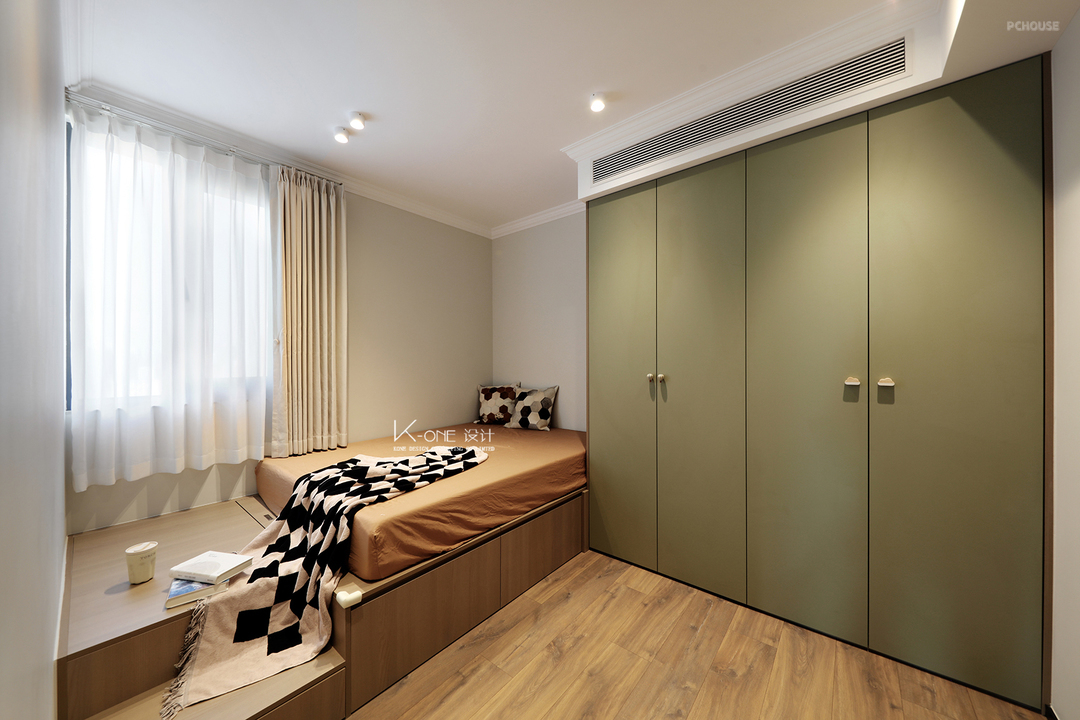 次卧,浅色调与自然光共同构建了宁静的氛围。宽敞的榻榻米床让人倍感放松,搭配精致的黑白格纹毛毯,瞬间提升了空间的层次感。绿色的大衣柜则为房间增添了一抹生机,同时提供了绝佳的收纳空间。窗帘轻柔透光,使空间充满自然光线,令人感到愉悦而舒适。