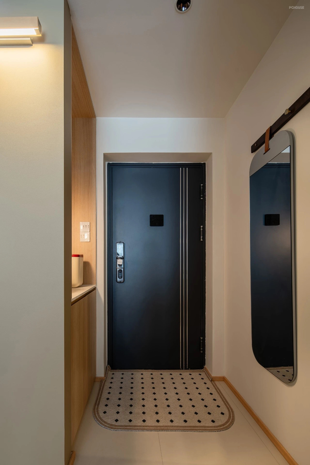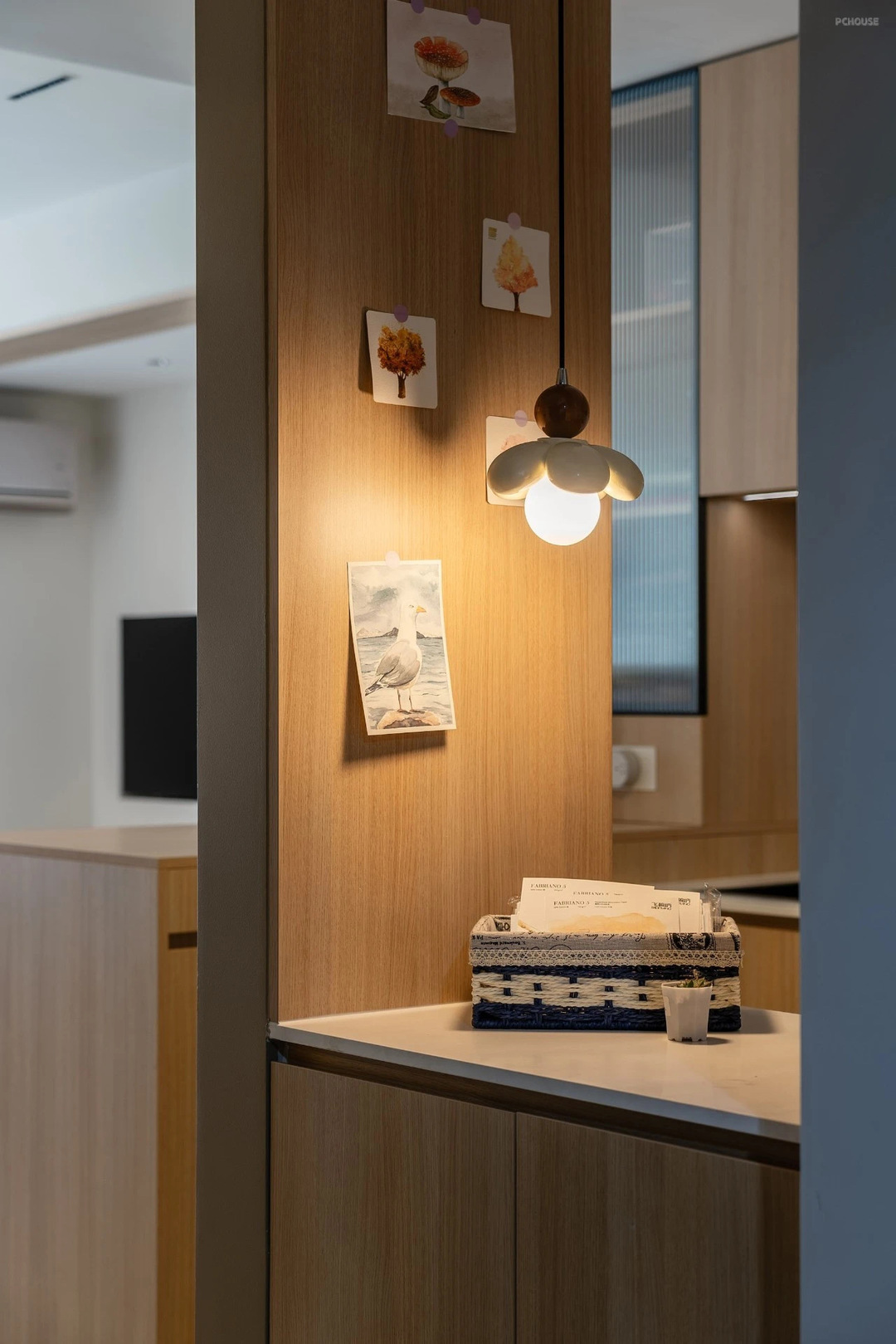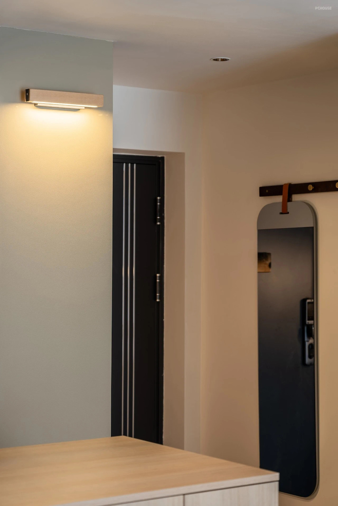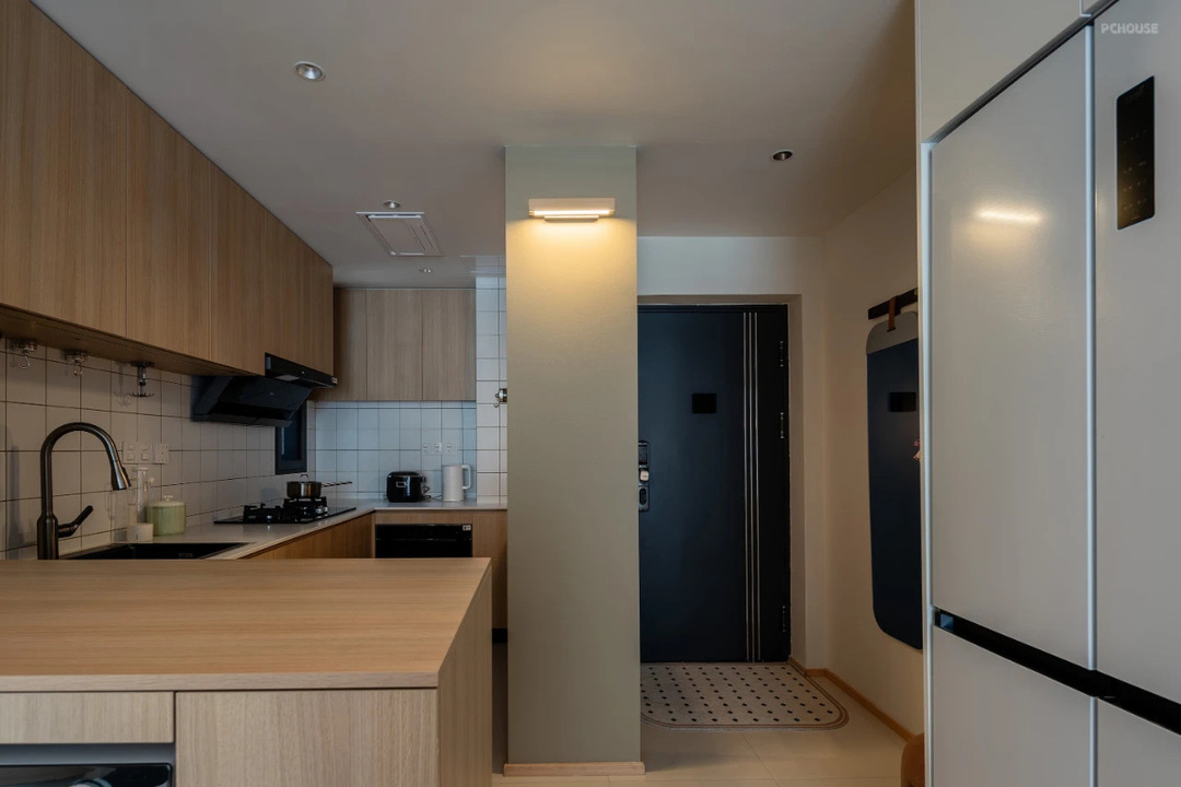 从厨房另一侧看整个入户空间,在墙面设置小壁灯,规避了此处采光不足的问题。