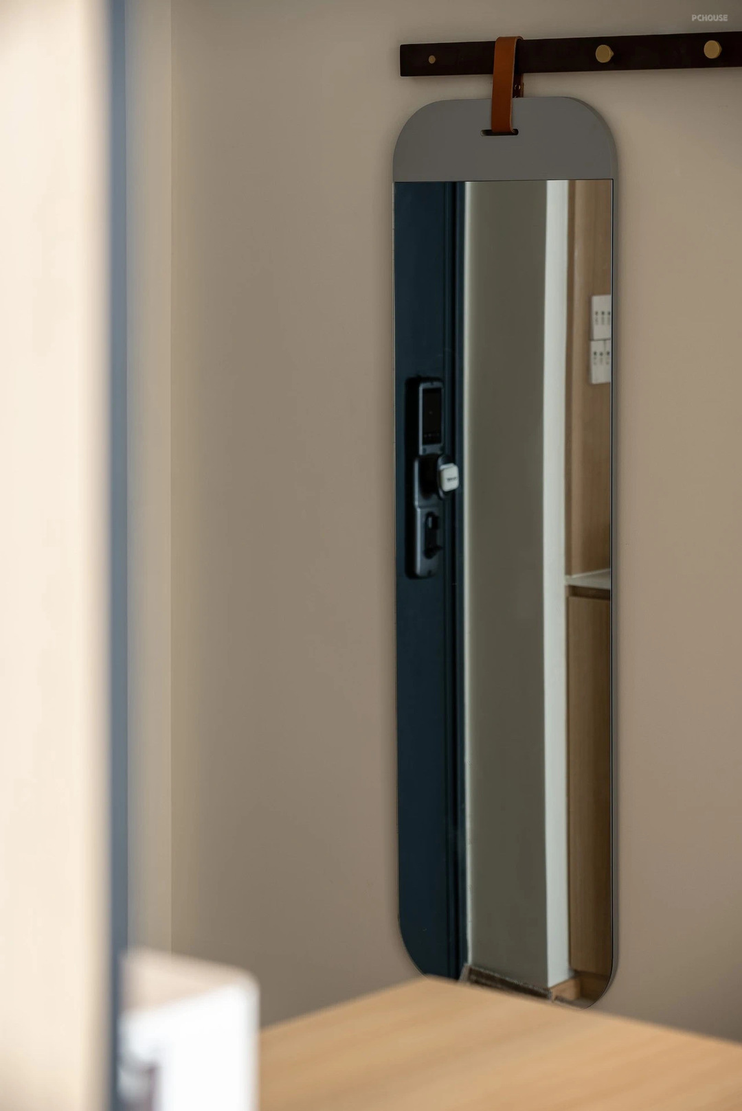 左侧设置了挂壁式置物架,将穿衣镜挂起来,同时也可以随手挂置些衣服钥匙串等等。
