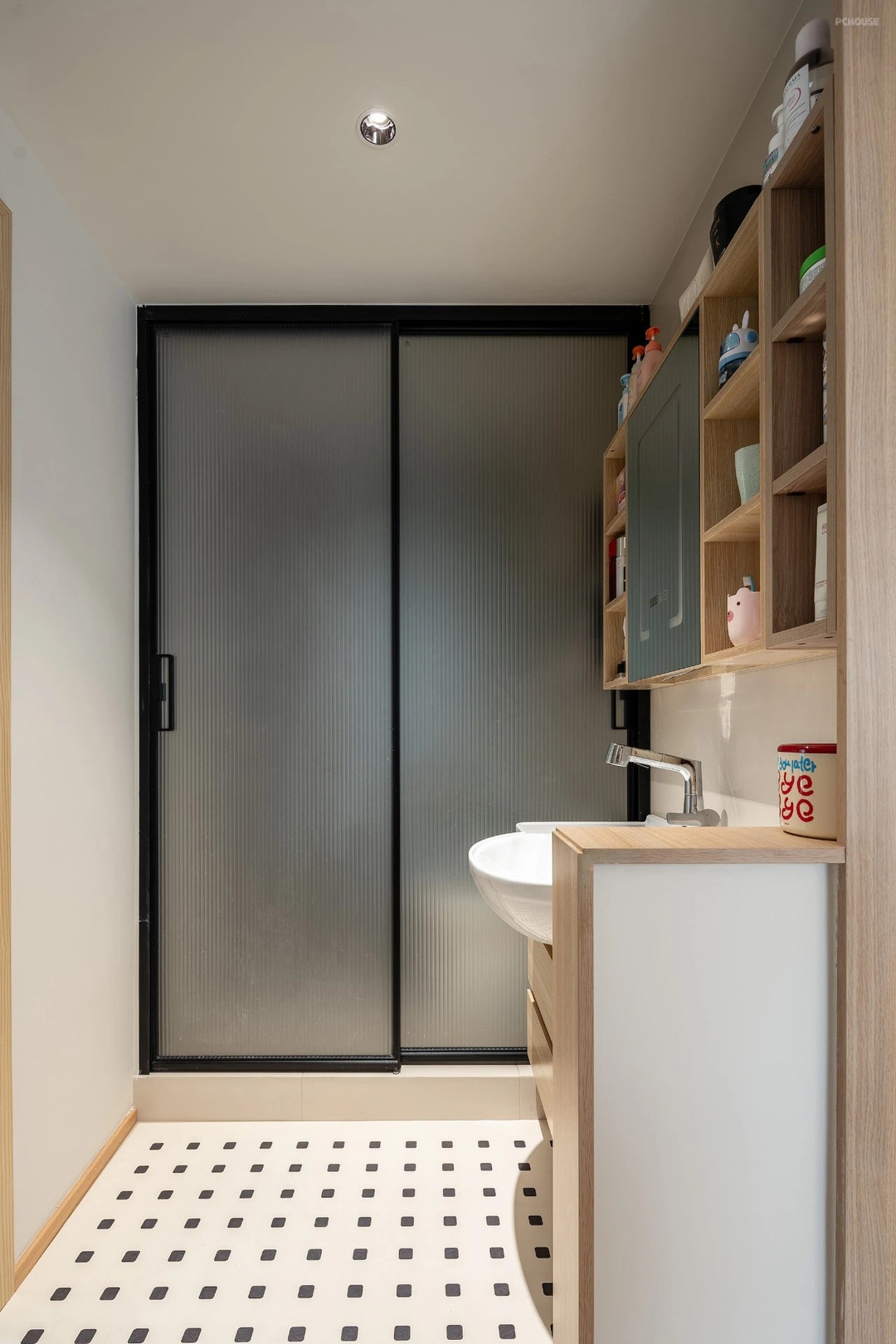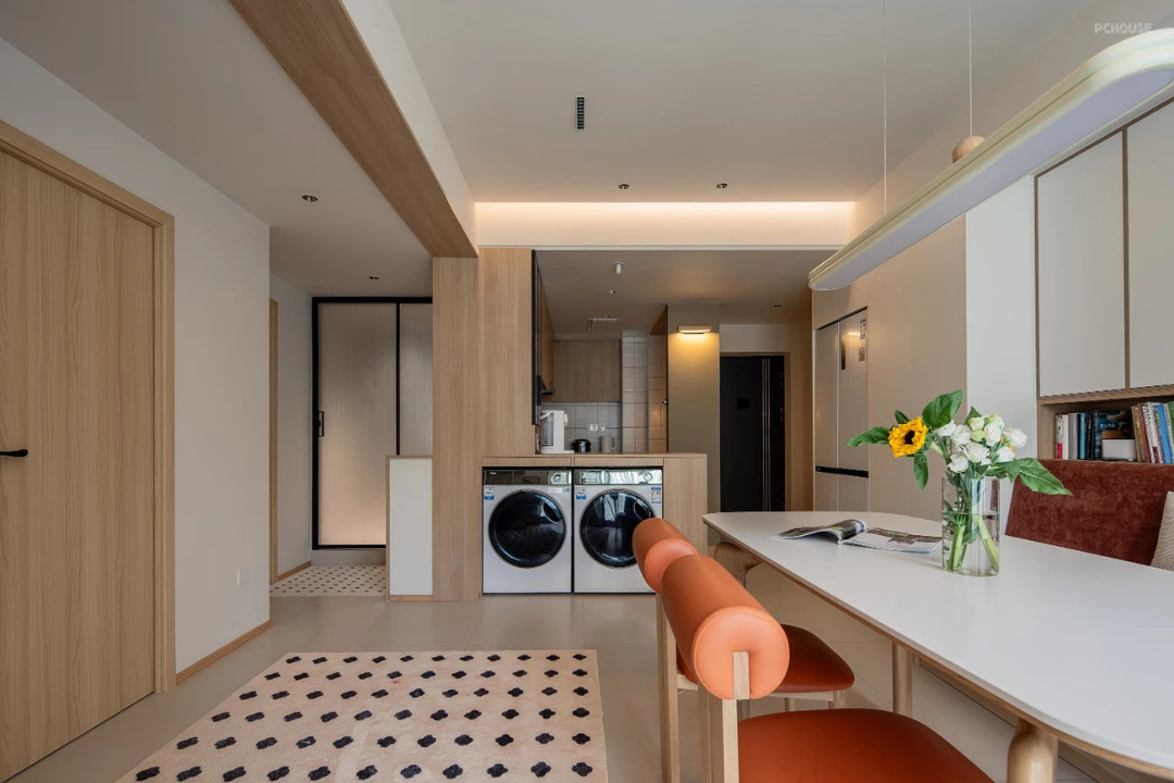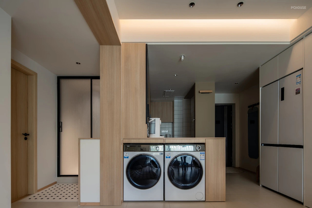 入户、厨房、卫生间三个空间的位置关系。由于户型限制,我们将洗衣房与厨房结合,把洗衣机放置于此也作为厨房空间的软隔断,日常也可在台面上简餐二人食等等。