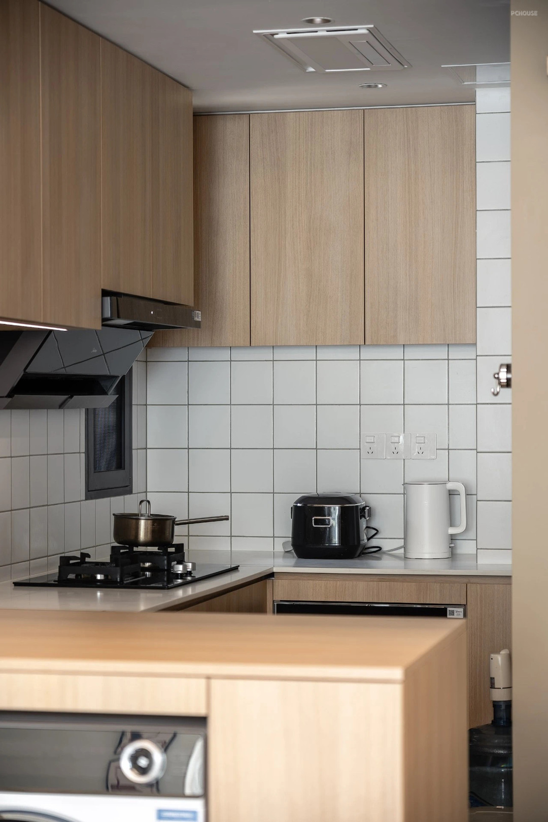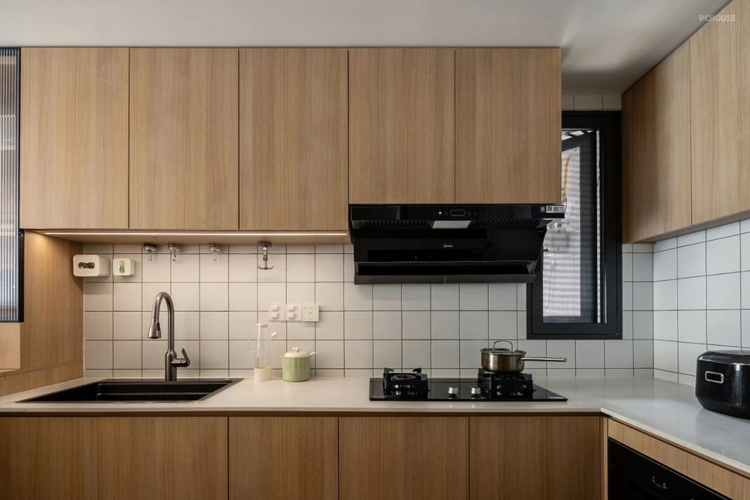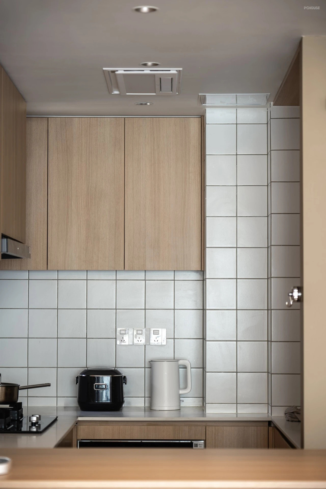 整个厨房以原木色系为主,搭配白色小方砖,营造温暖舒适的氛围。