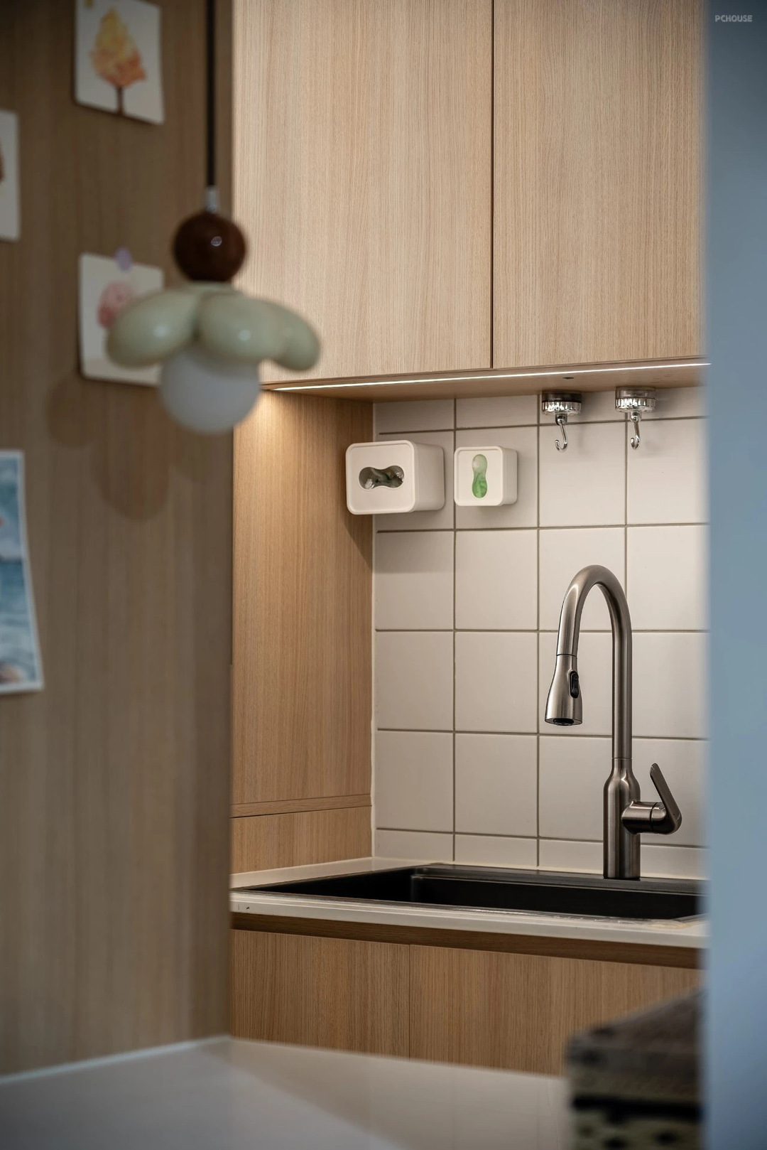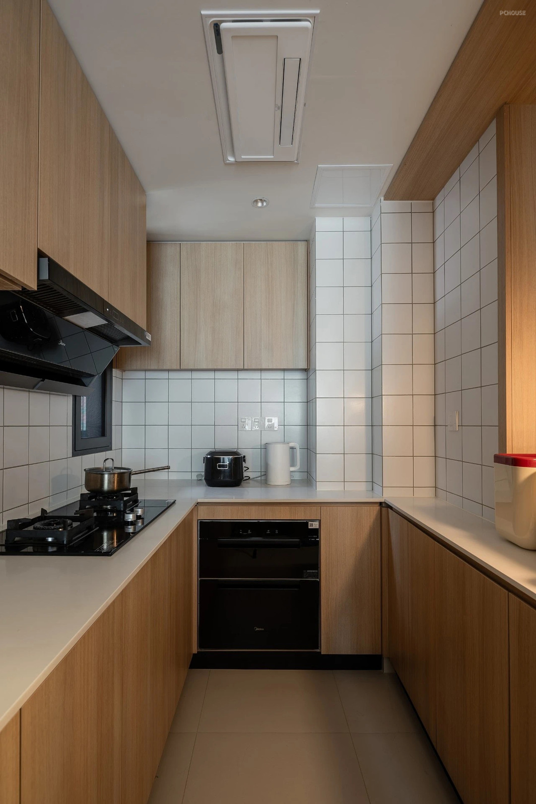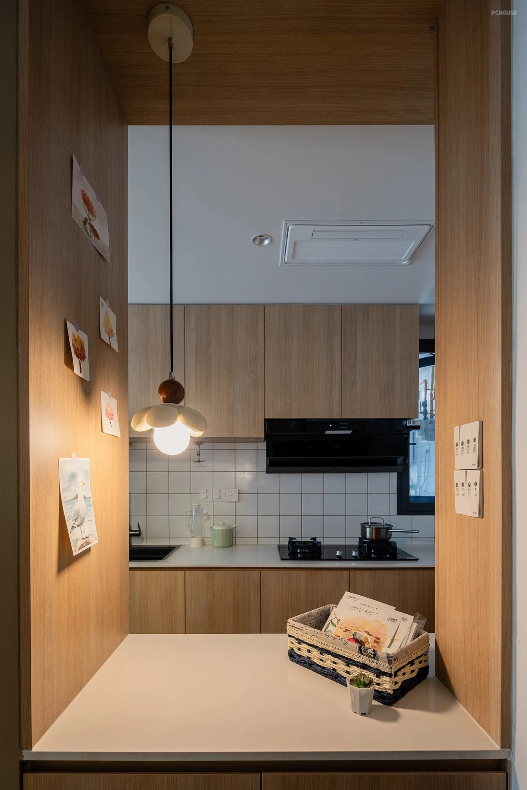 整个厨房以原木色系为主,搭配白色小方砖,营造温暖舒适的氛围。