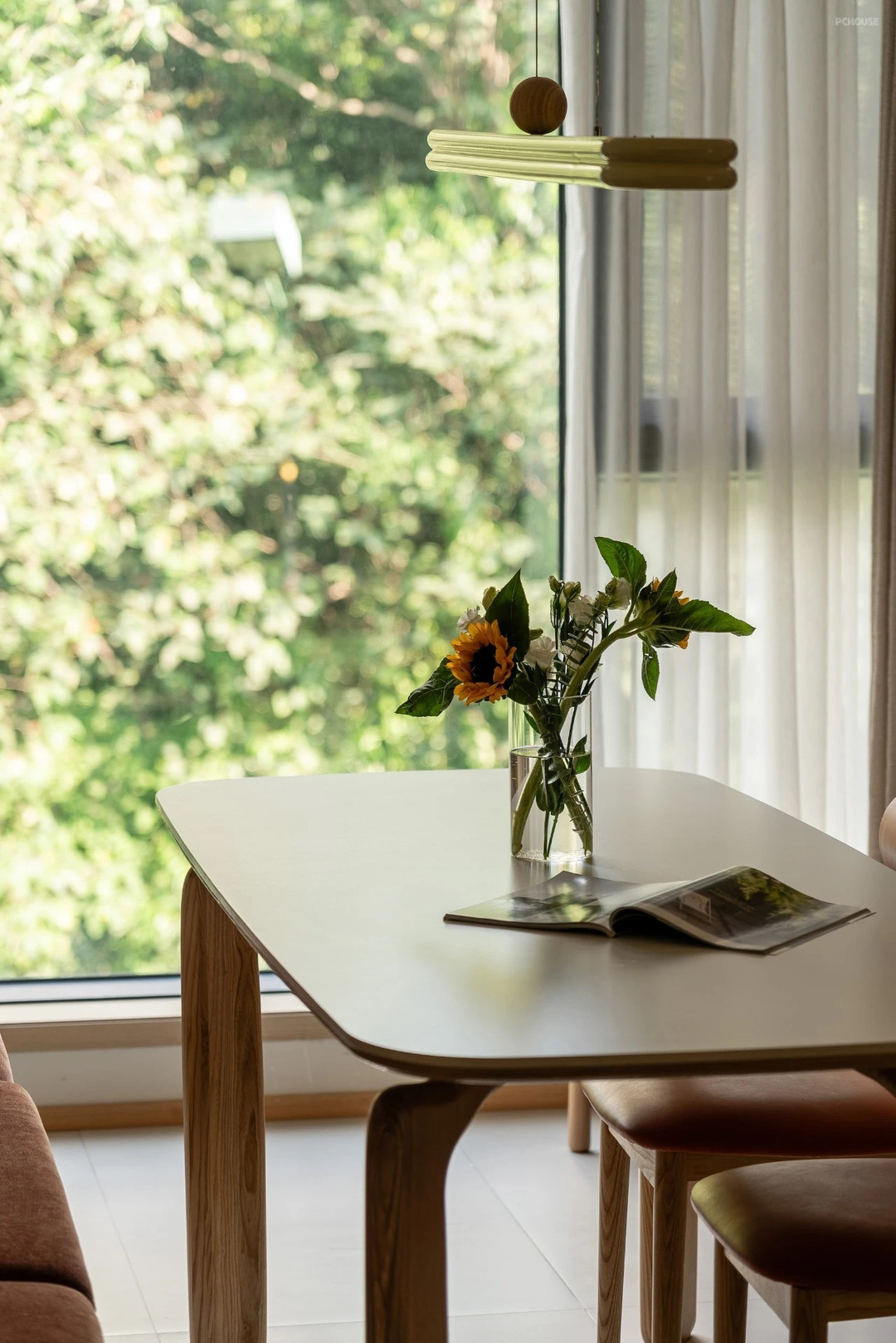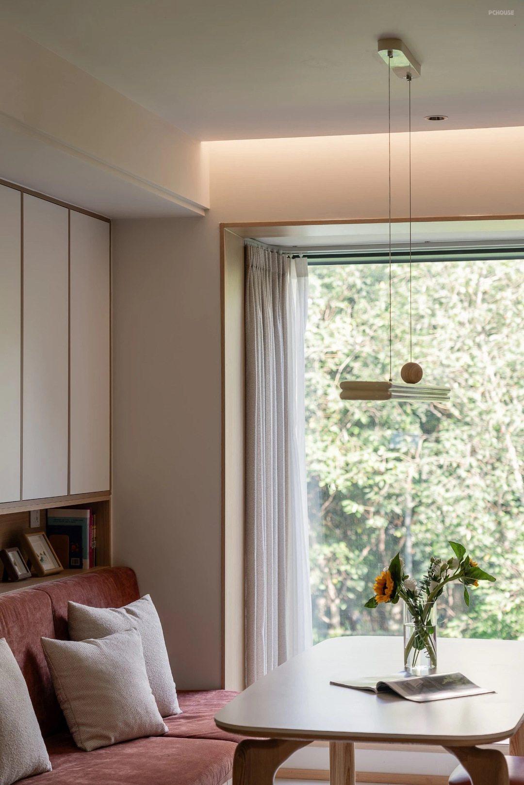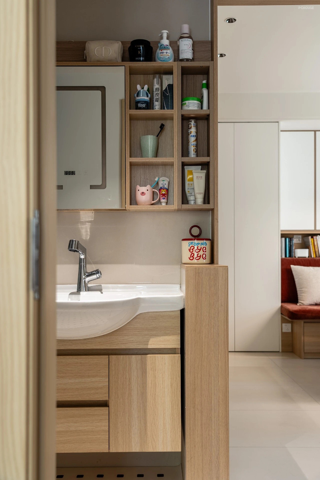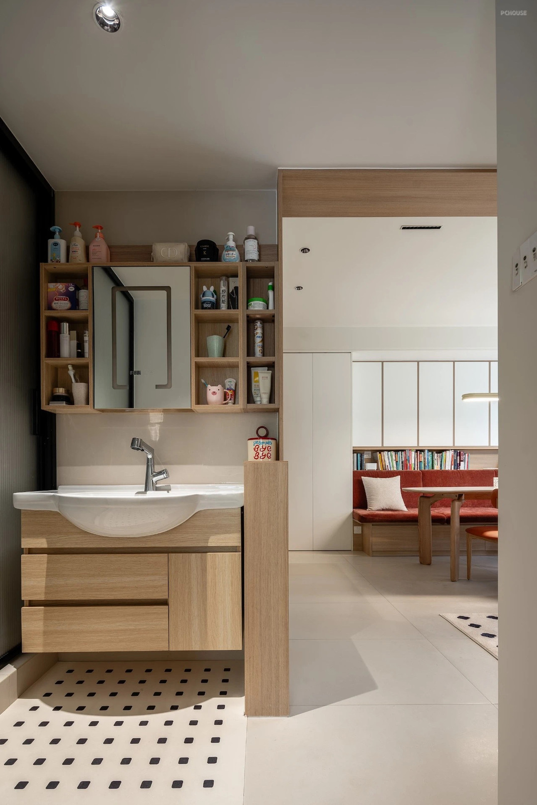 之前提到入户右侧的小窗台,利用鞋柜和厨房储物柜的宽度在上方搭出一个台面,用于放置一些出入常用的小物件,同时透过窗口也可以看到厨房内的场景。