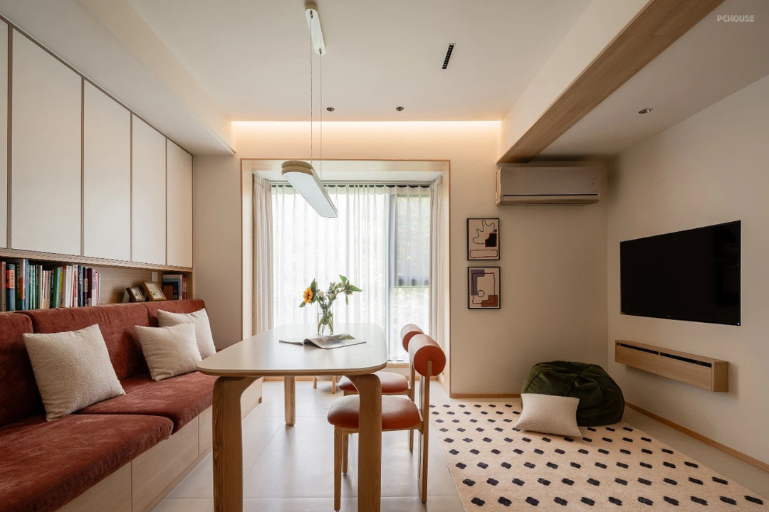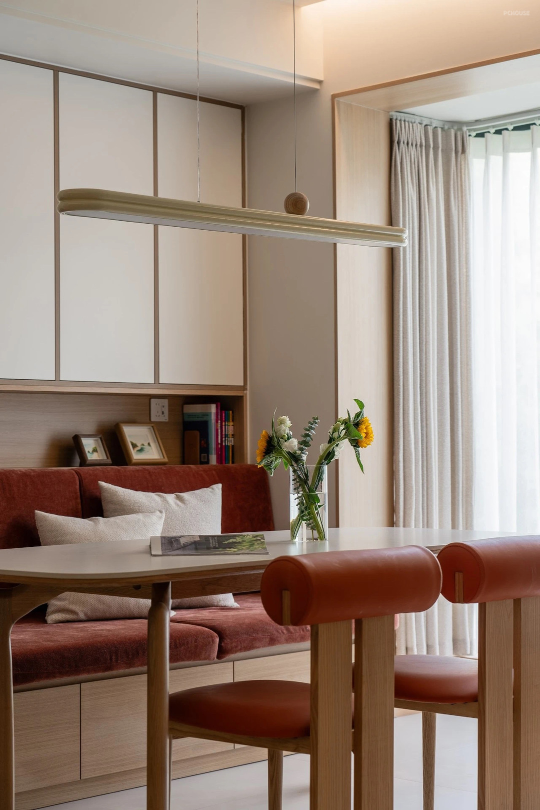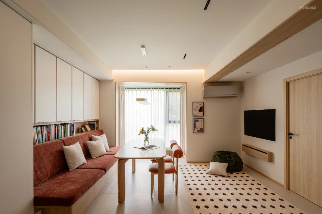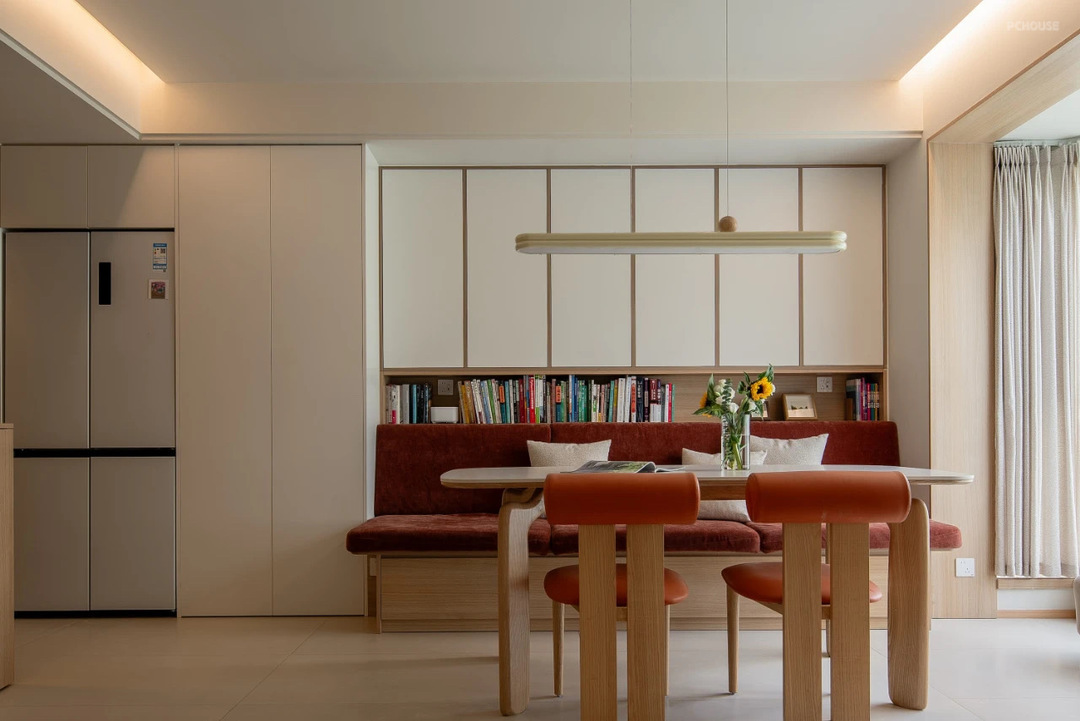 4️⃣ 客厅空间增加后,将整个空间打造为“客厅+书房”一体,在图书墙的一侧设置软包卡座作为读书学习区,前方又留有足够空间作为客厅休闲放松区。