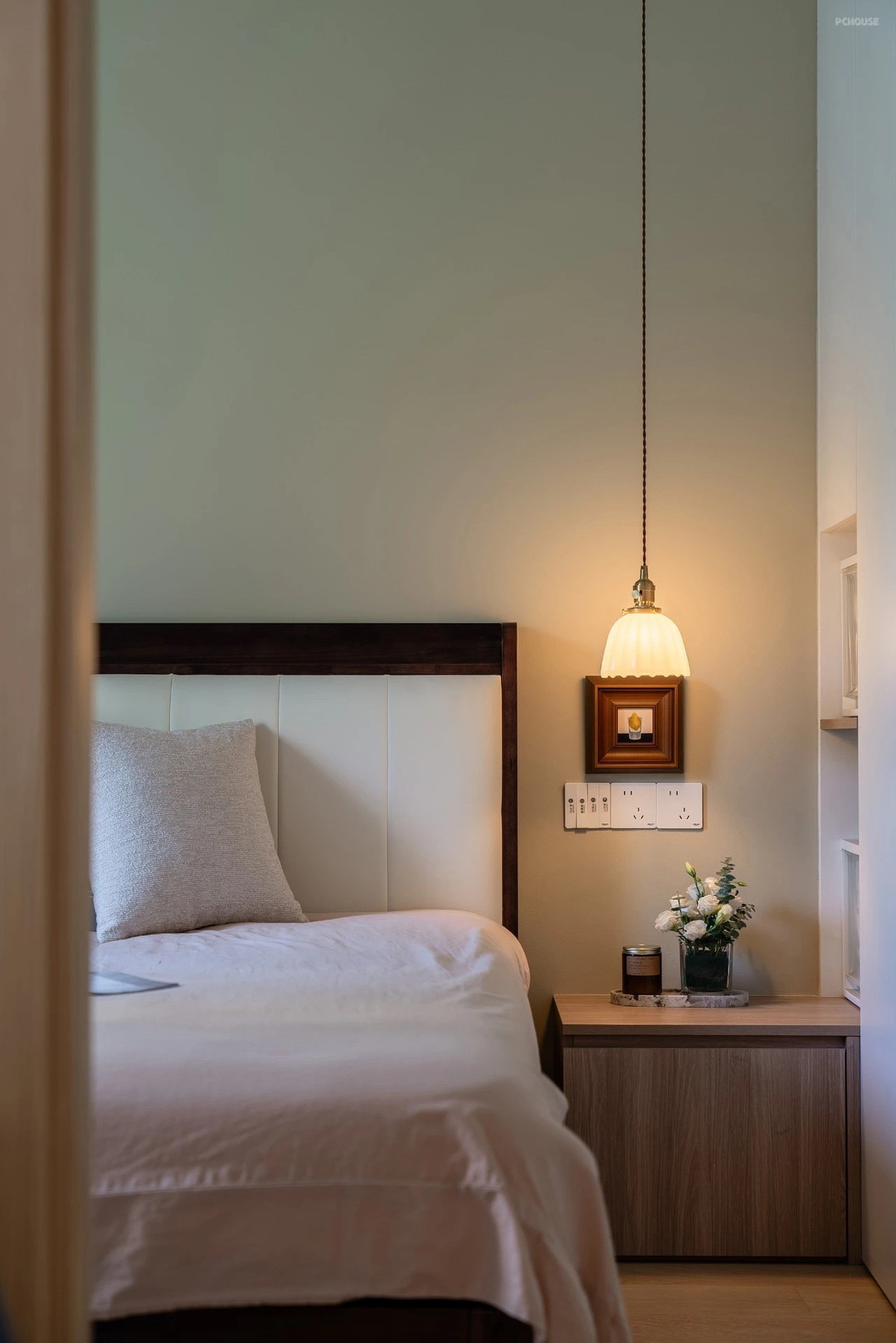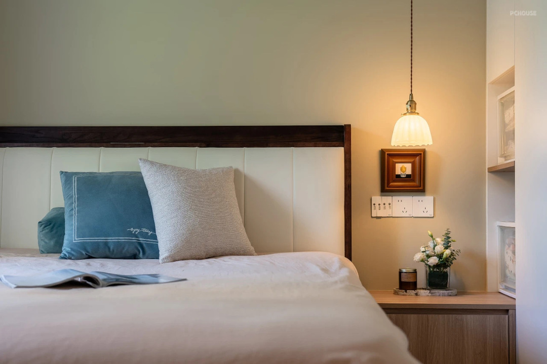 衣柜设计了两个开放格与床头柜联动,方便一些衣物的拿取,暖黄的床头灯复古又可爱。