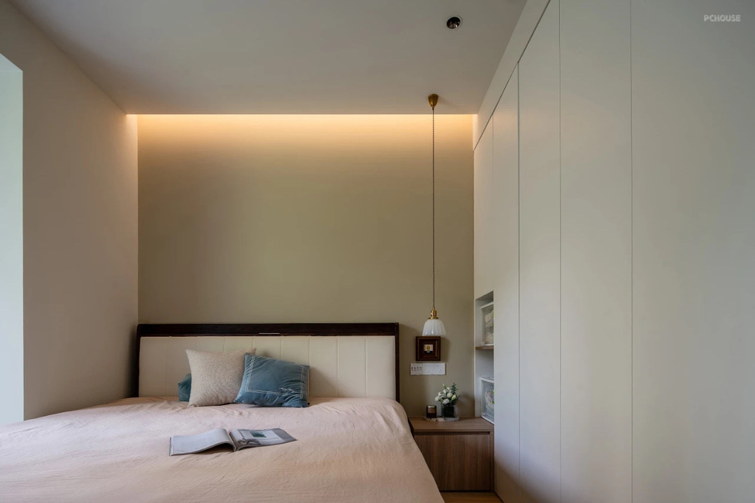 主卧即是简单的休息空间,在床头顶部安排灯带,打造舒适的休息氛围。