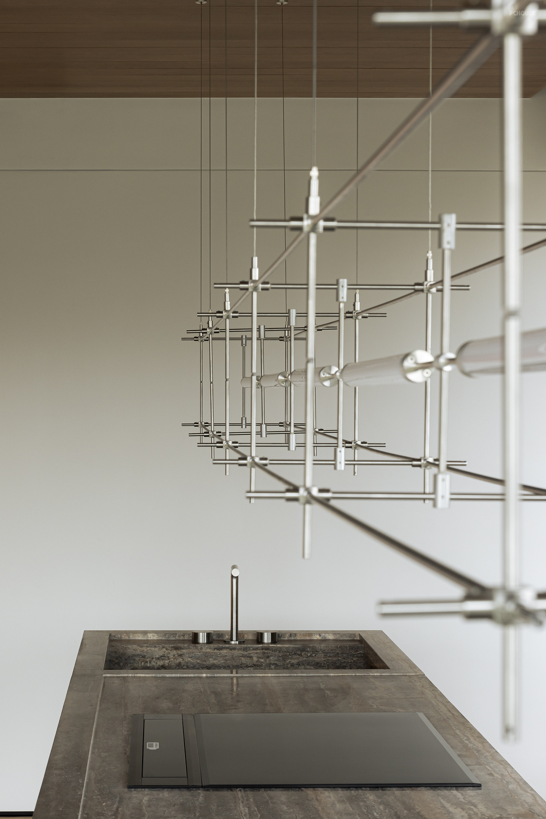 岛台作为极具体量的空间元素,灰洞石的材质在这个干净至简的空间里是醒目的存在,但又不过于刻意,与悬于上方不锈钢灯具的现代工业感相互碰撞,在细微处催生出理性与感性的烟火气。