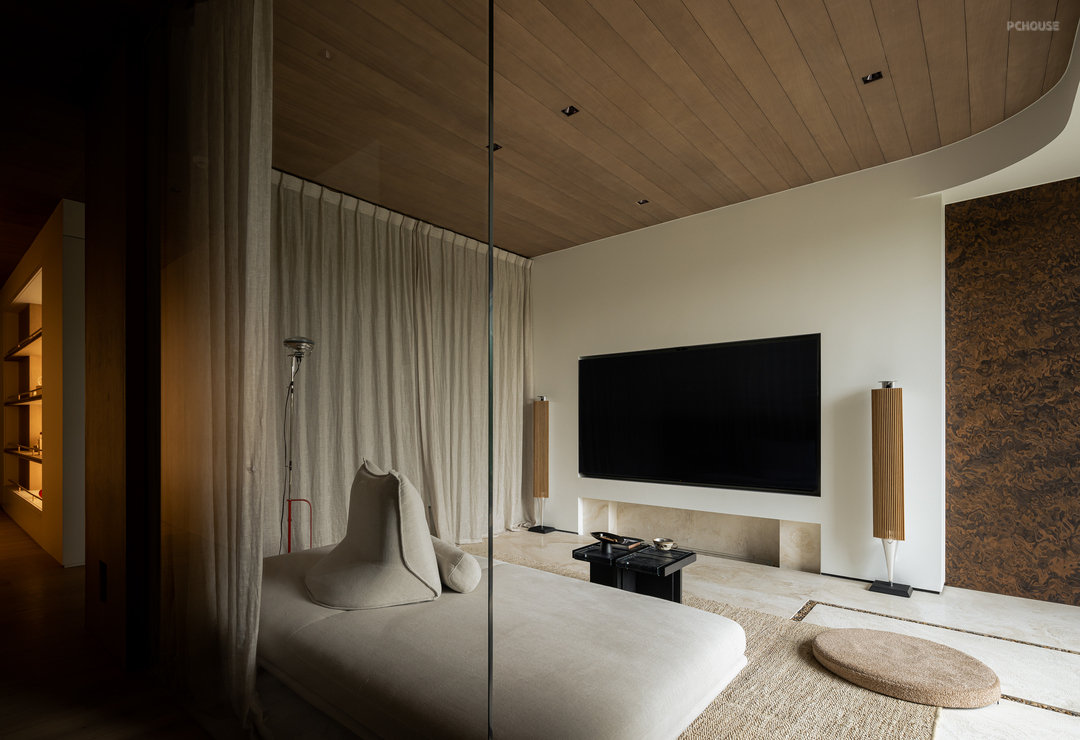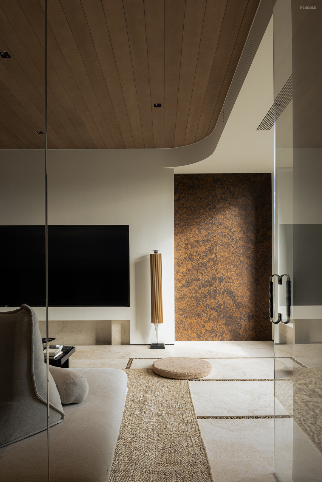 这个空间作为茶室兼影音室,我们将其中两侧实体墙拆除,再以玻璃作为隔断,空间不再逼仄,得以从容感、呼吸感。其中一面正对着玄关位置,在入户瞬间,打破以往的格局经验,巧妙嵌入锁定视觉,若隐若现的纱帘朦胧之中,温润氛围弥散而开,心绪就静了下来。