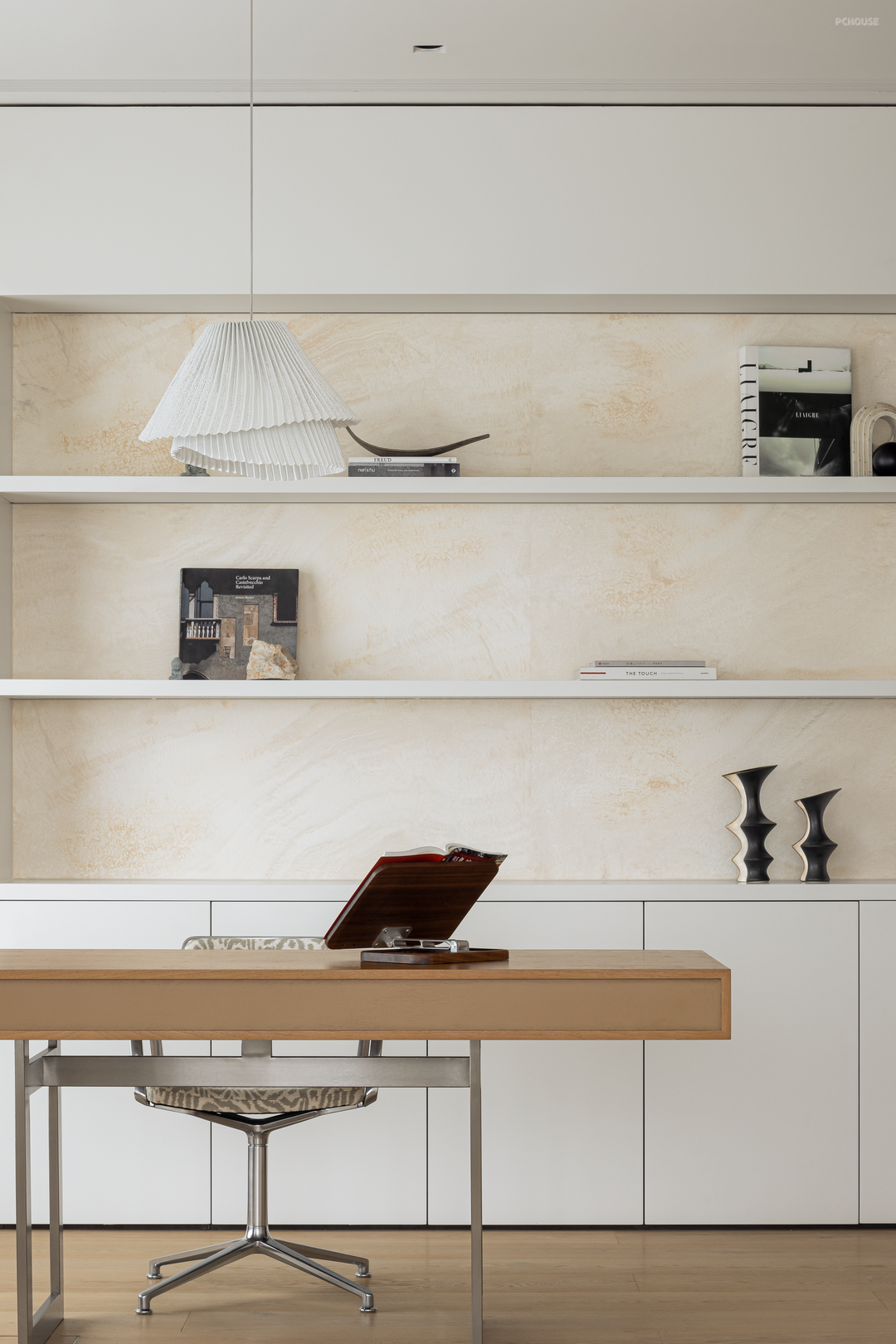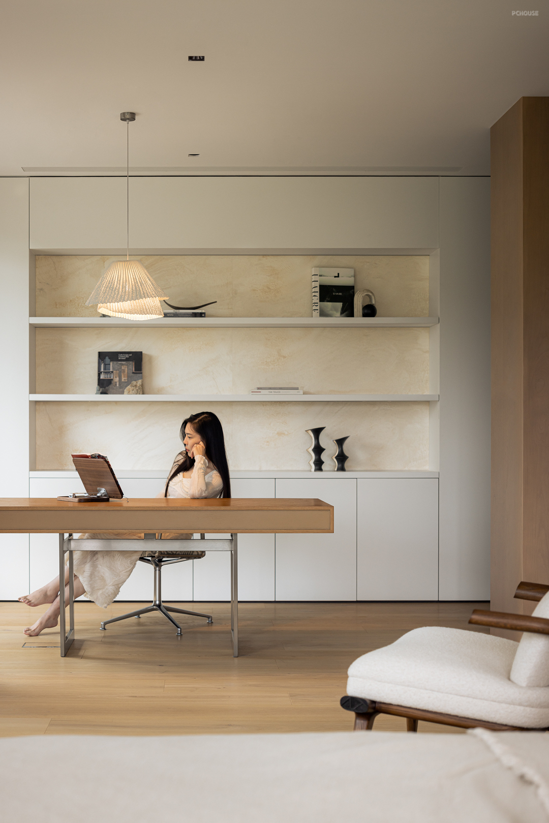 宽阔的尺度将书房功能也轻松容纳,开放格与储物收纳并存,收藏的器物陈列于空间各处,在藏品与书籍里构建自由维度。