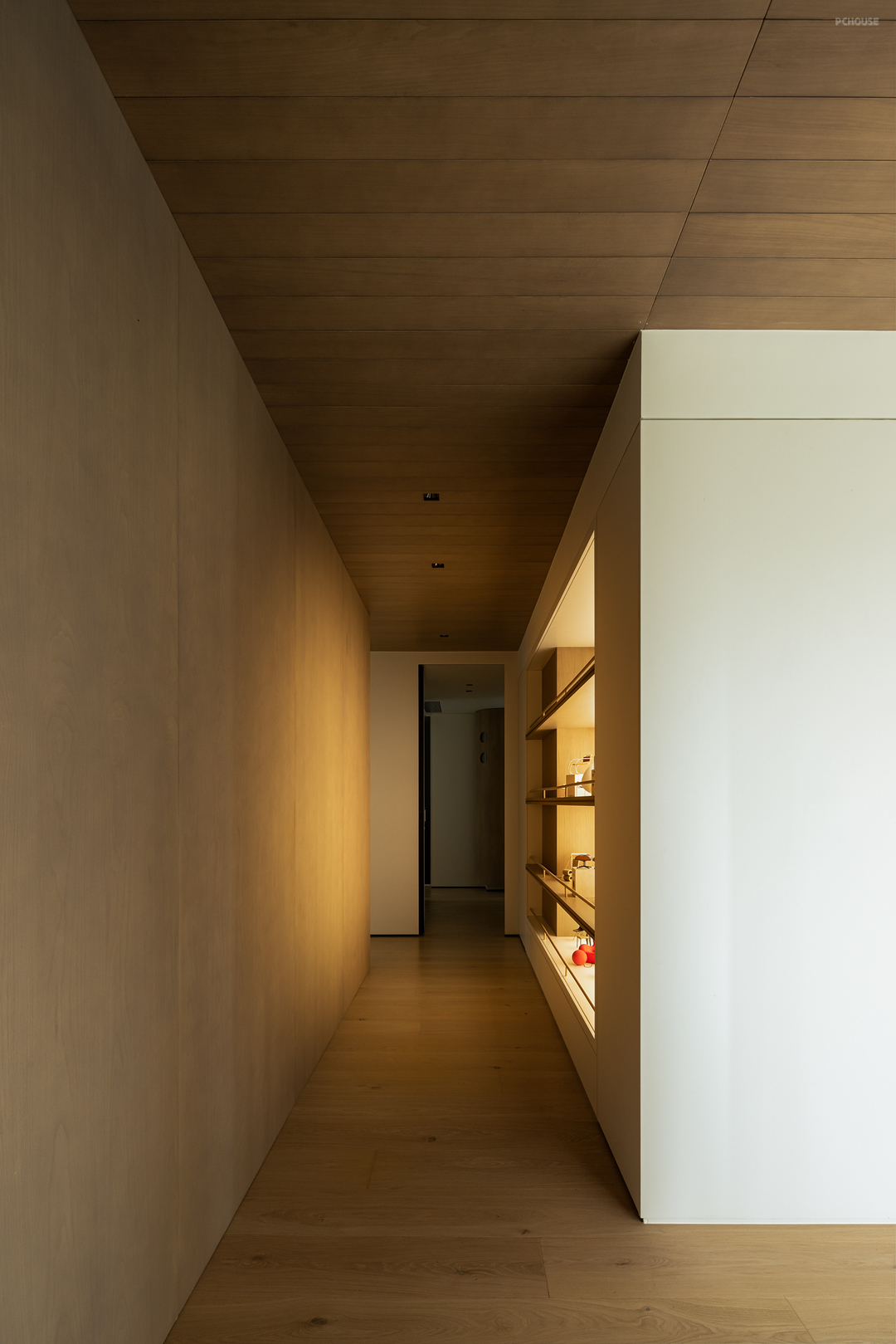 木色包裹下的过道空间,循着光影生发处温润流动的形态,构建着叙事铺陈中的呼应关系。拉长的过渡纵深感和仪式感,共同营造出一个精神与意志均有所归属的场地。