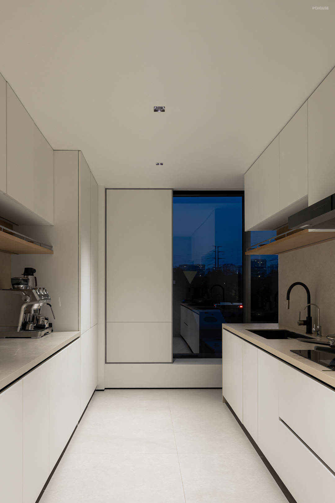 西厨的超长岛台是这个大空间里的“承重点”,近6米的长度轻松落坐在大横厅,无限延伸的设计理念融合在稳然的氛围里。以日常生活的视角,打破分区的界限,互通随心而动。