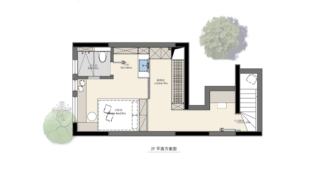 3、主卧1.5米地台式床+屏风+矮柜组合,满足主卧多种功能及隐私性;