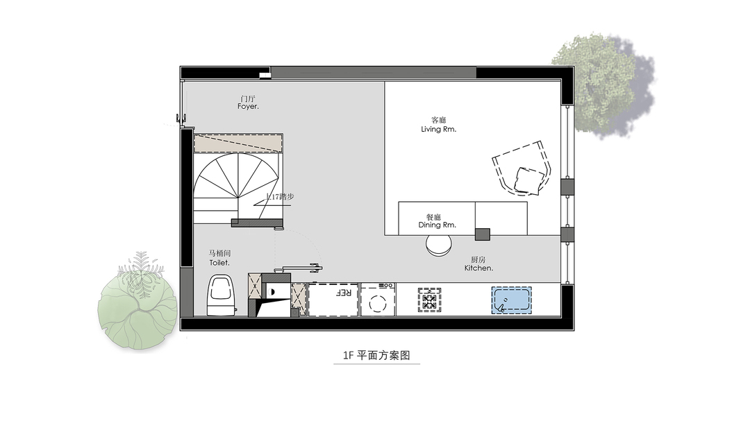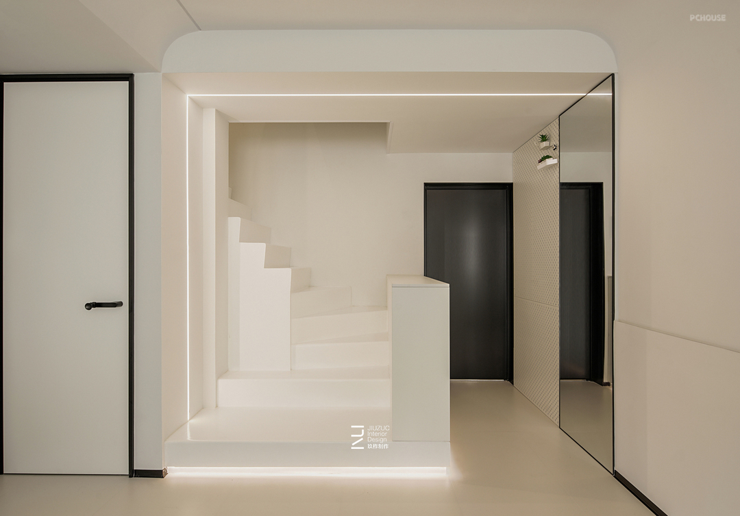 1、入户改变楼梯方向,玄关增加储物+换鞋凳,弧形楼梯解决原楼梯踏步深度问题;