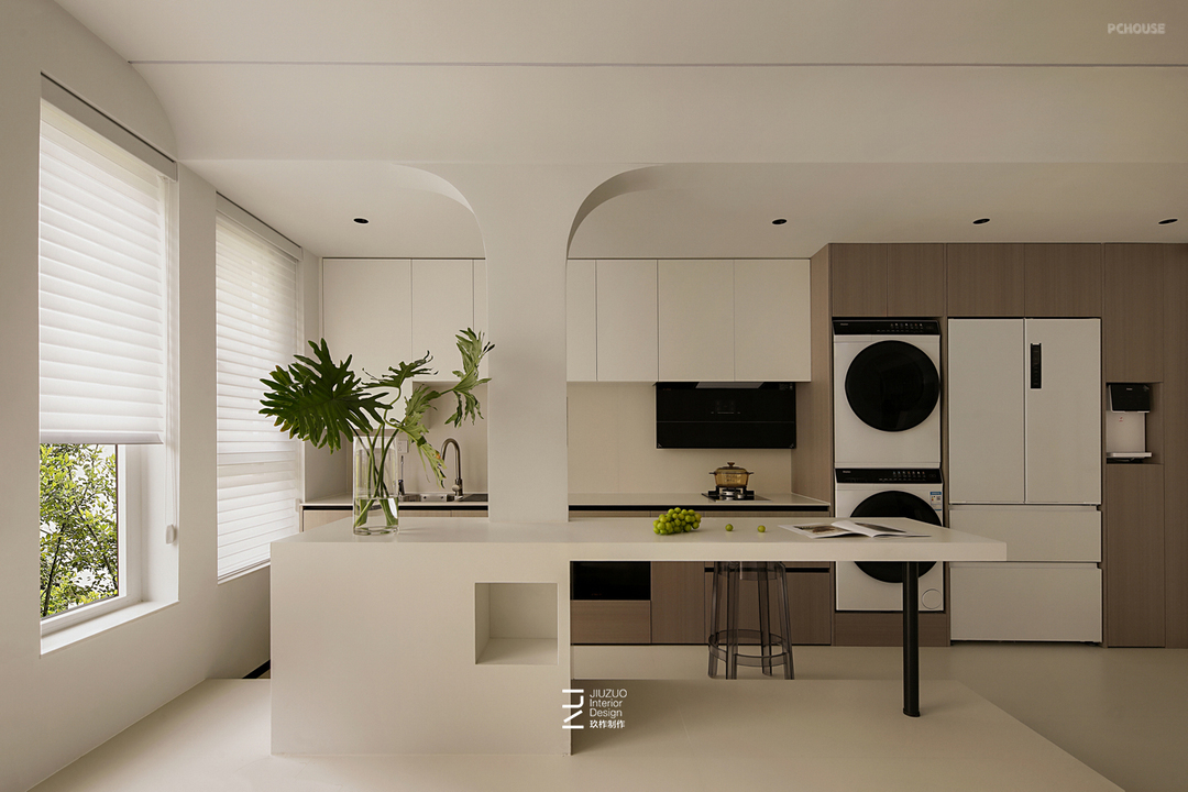 厨房采用开放式一字型上下柜的橱柜布局,同时把冰箱、洗衣机烘干机组合在一起,结合橱柜+家政区做一体化设计;