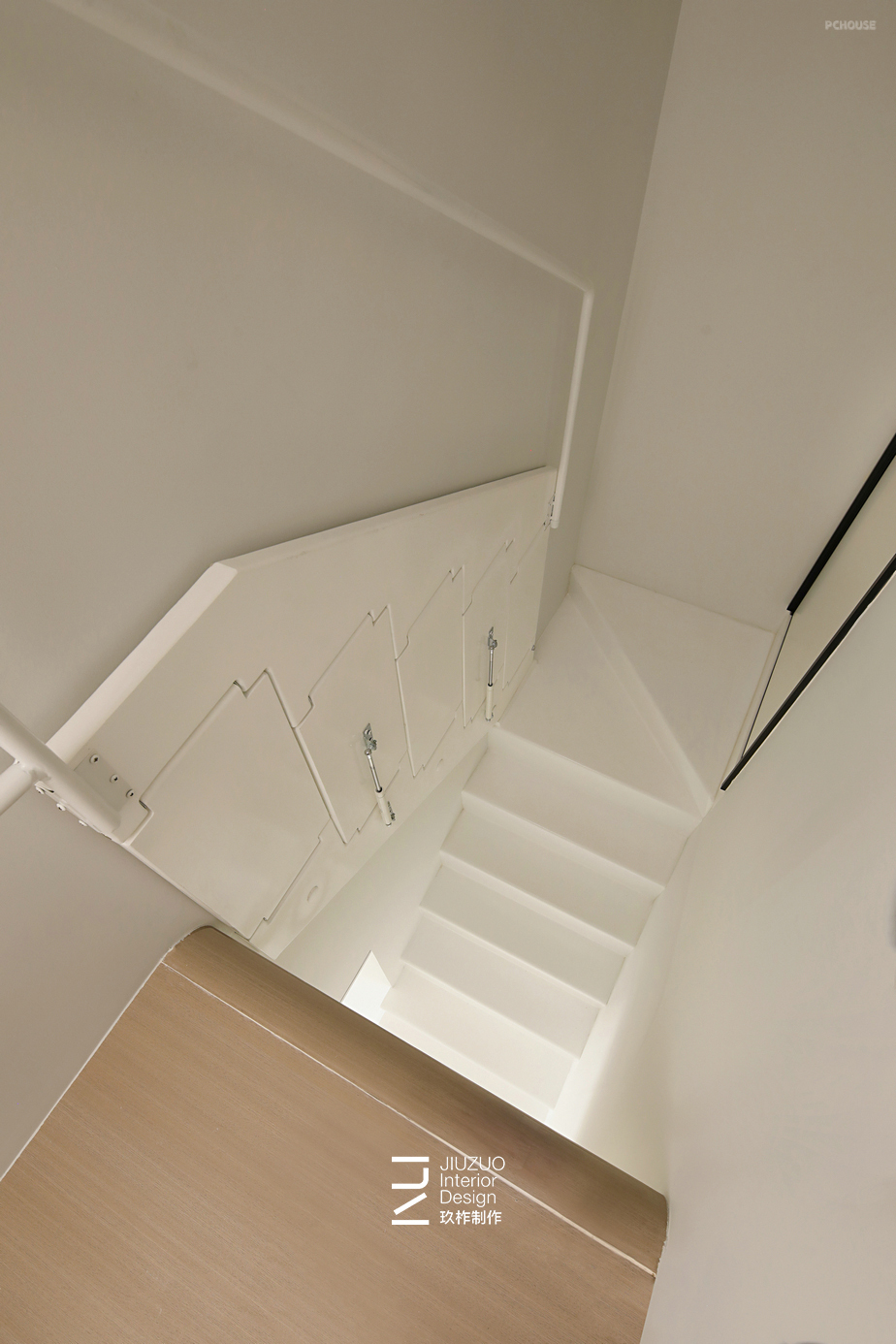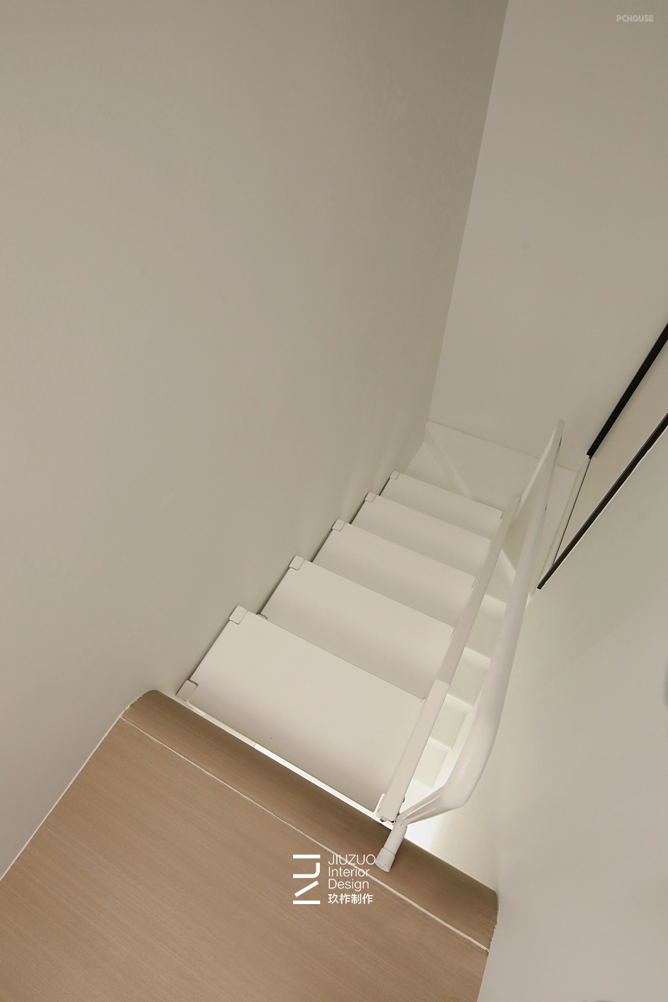 楼梯选用了微水泥与墙面涂料、鞋柜调色打样达到同色效果,线条与色调的统一让极简空间更凸显现代感的整洁和大气;