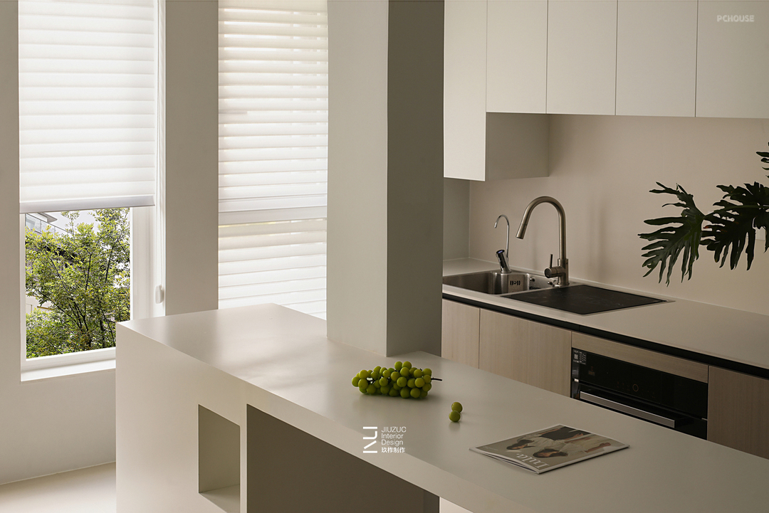 3、开放式厨房一字型台面,打通原来小阳台,增加操作台面,与客餐形成社交平台;