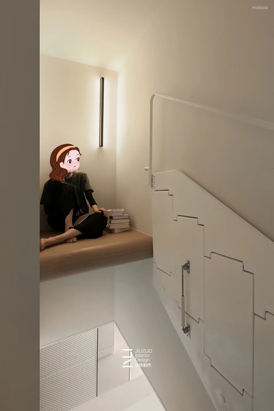 楼梯洞口上面则是用钢架+木饰面设计了隔板层,提高了原来楼梯洞的利用率,加上折叠楼梯的设计,在这里做了个可以冥想的休闲区;