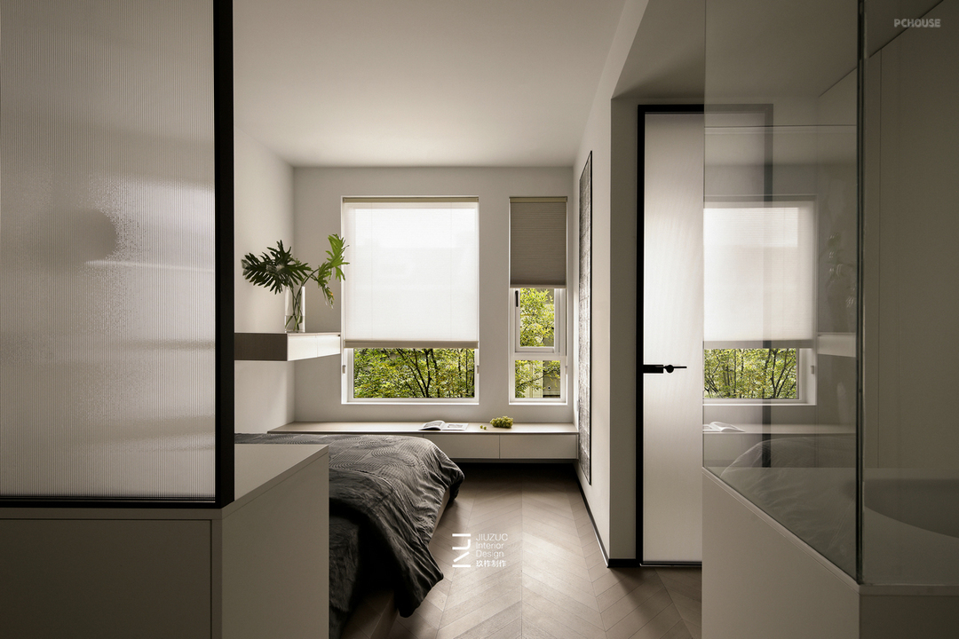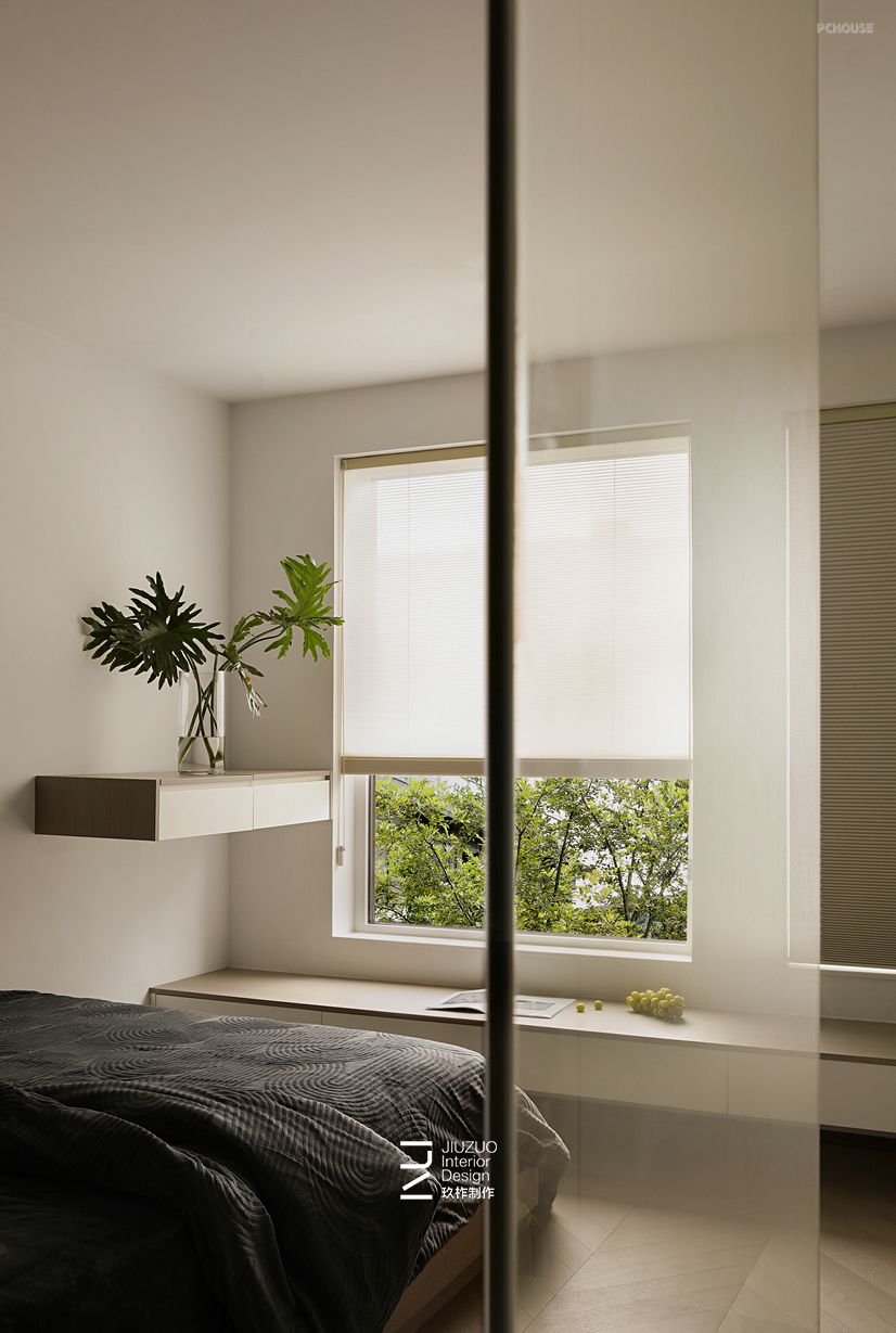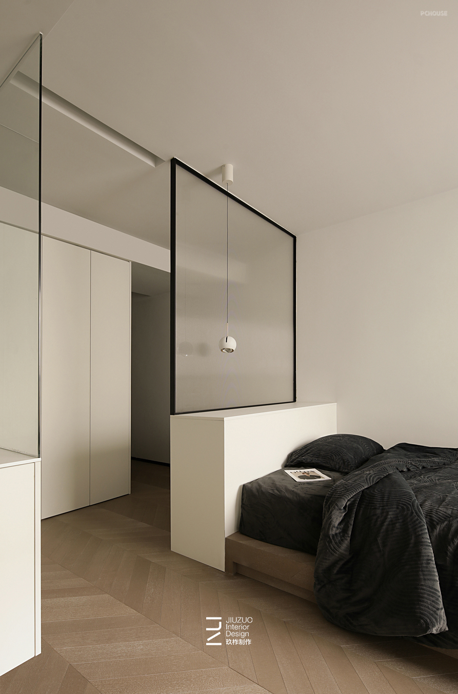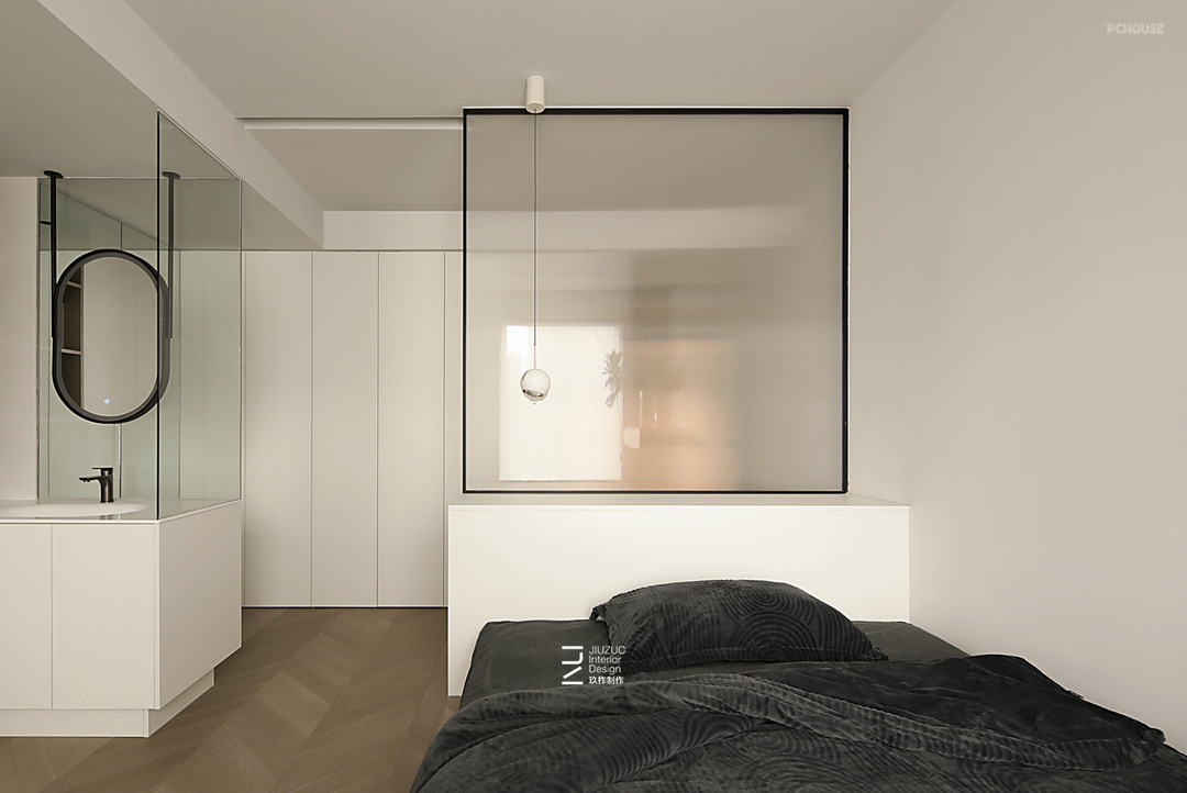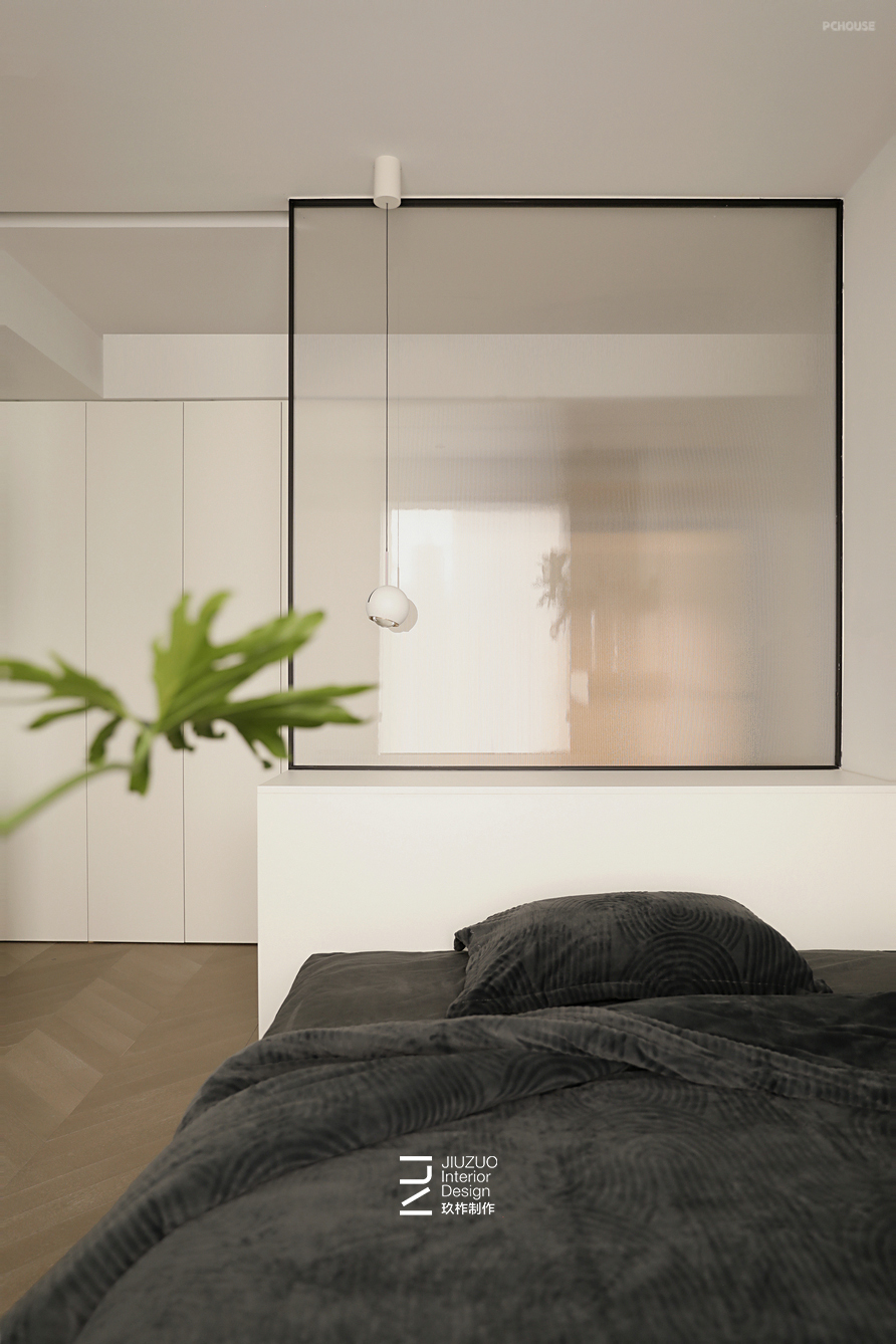 卧室采用悬浮地台床设计,搭配感应灯带照明方便晚上起夜使用;床头以矮柜+整面玻璃做隔断,矮柜可以两面利用,卧室一侧做为床头木饰面靠背,过道一侧则用来储物;