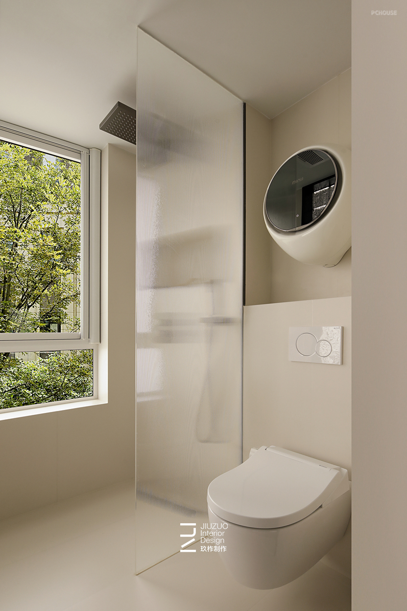 卫生间采用墙地统一颜色及型号的瓷砖,保证了空间的整洁性;选用了壁挂马桶,即简洁又方便打扫卫生,同时在上面空闲区加了壁挂洗衣机,用于贴身衣物的清洗;