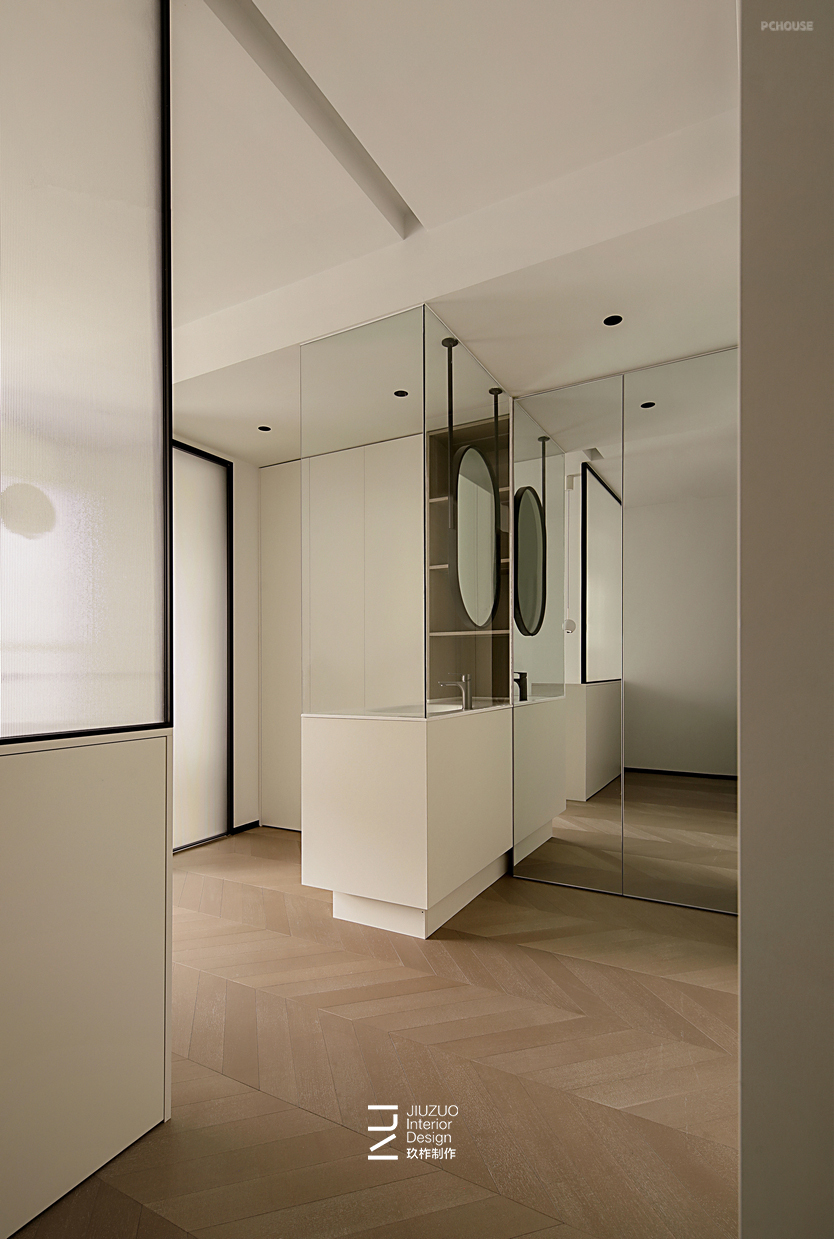 主卫采用酒店式干湿分离设计,干区台盆选用亚克力一体式,即美观又方便清理;台盆柜上面做了透明的玻璃+吊镜,与衣帽间做了遮挡同时不影响采光; 因为没有传统的镜柜增加收纳,在台面左手边做了木色开放格加灯带;