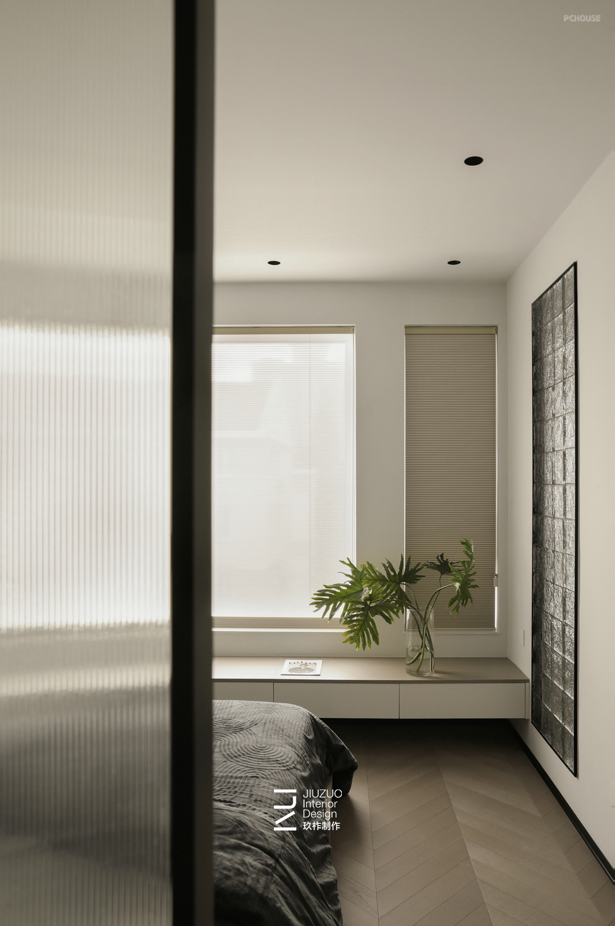 过道里的衣帽间改成了开放式办公区,空间的氛围感得到了提升;通过斗柜和屏风结合划分了过道与卧室的功能区,也保证了卧室的隐私性;