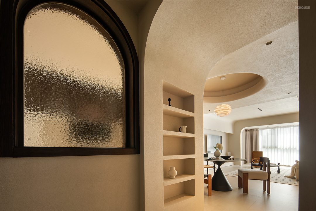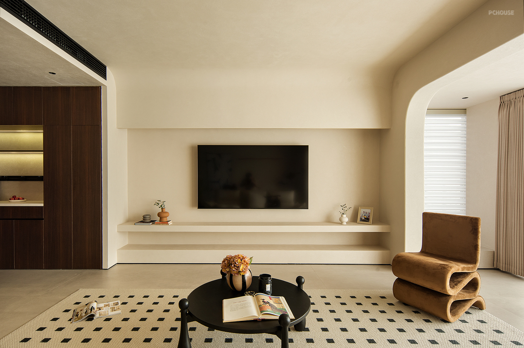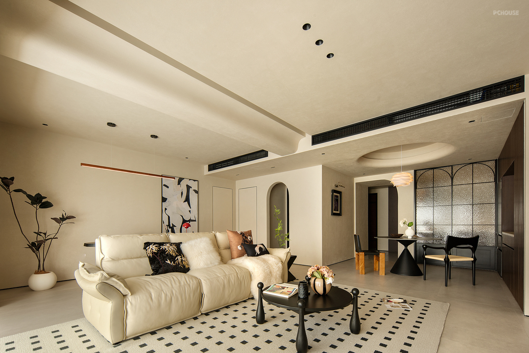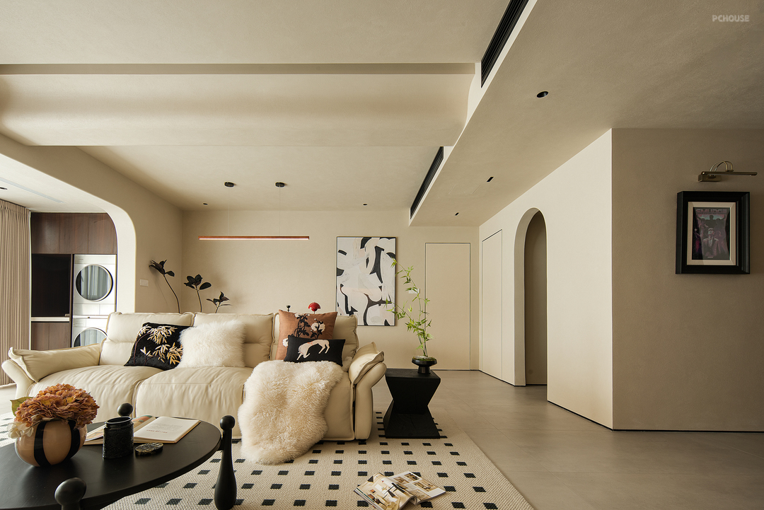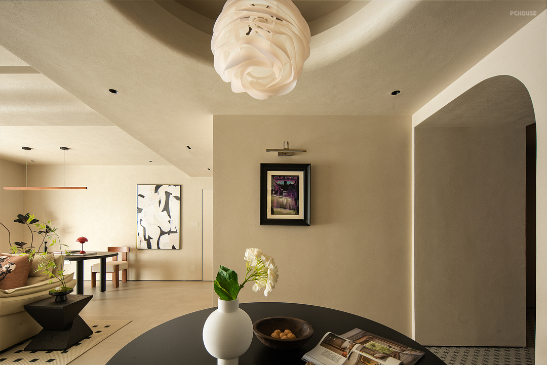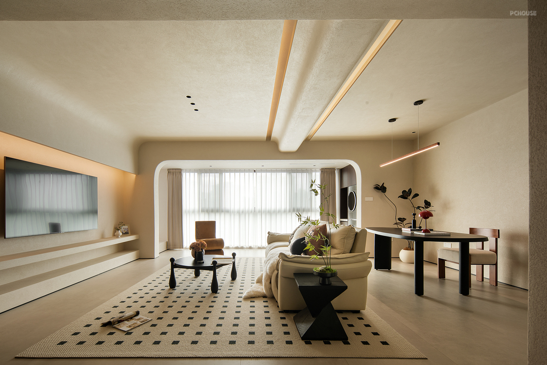 客厅空间保留了简单的色调,整体采用了干净的色调和木色自然纹理。客餐厅之间无缝链接,使整个空间凝聚成一个完整且温暖舒服的场域。有质感且中性的调色板始终贯穿着柔和而平静的主题。吊顶没有太复杂,越简单越耐看,但也注重层次感,这样才能将无主灯的氛围感拉满。