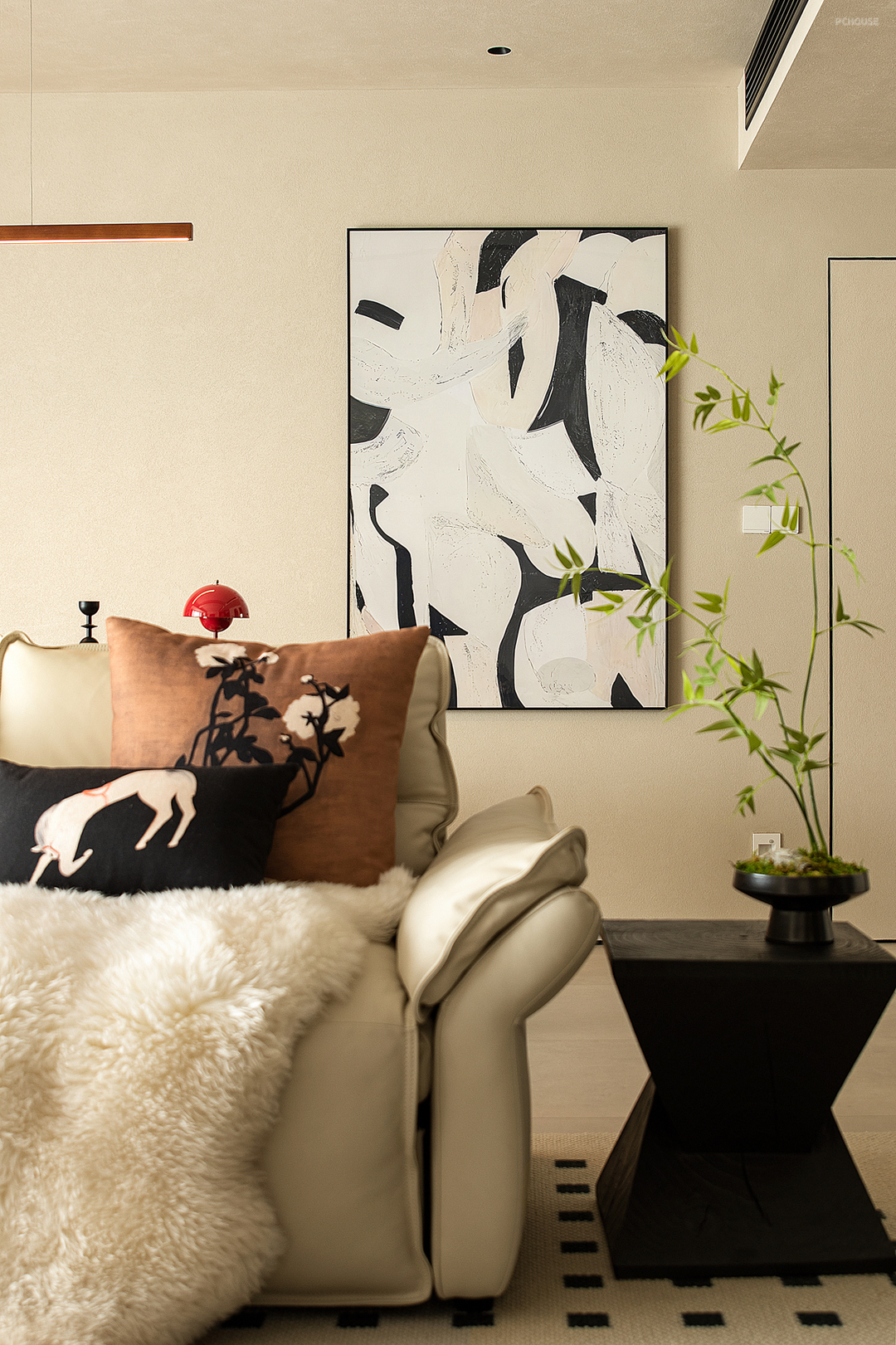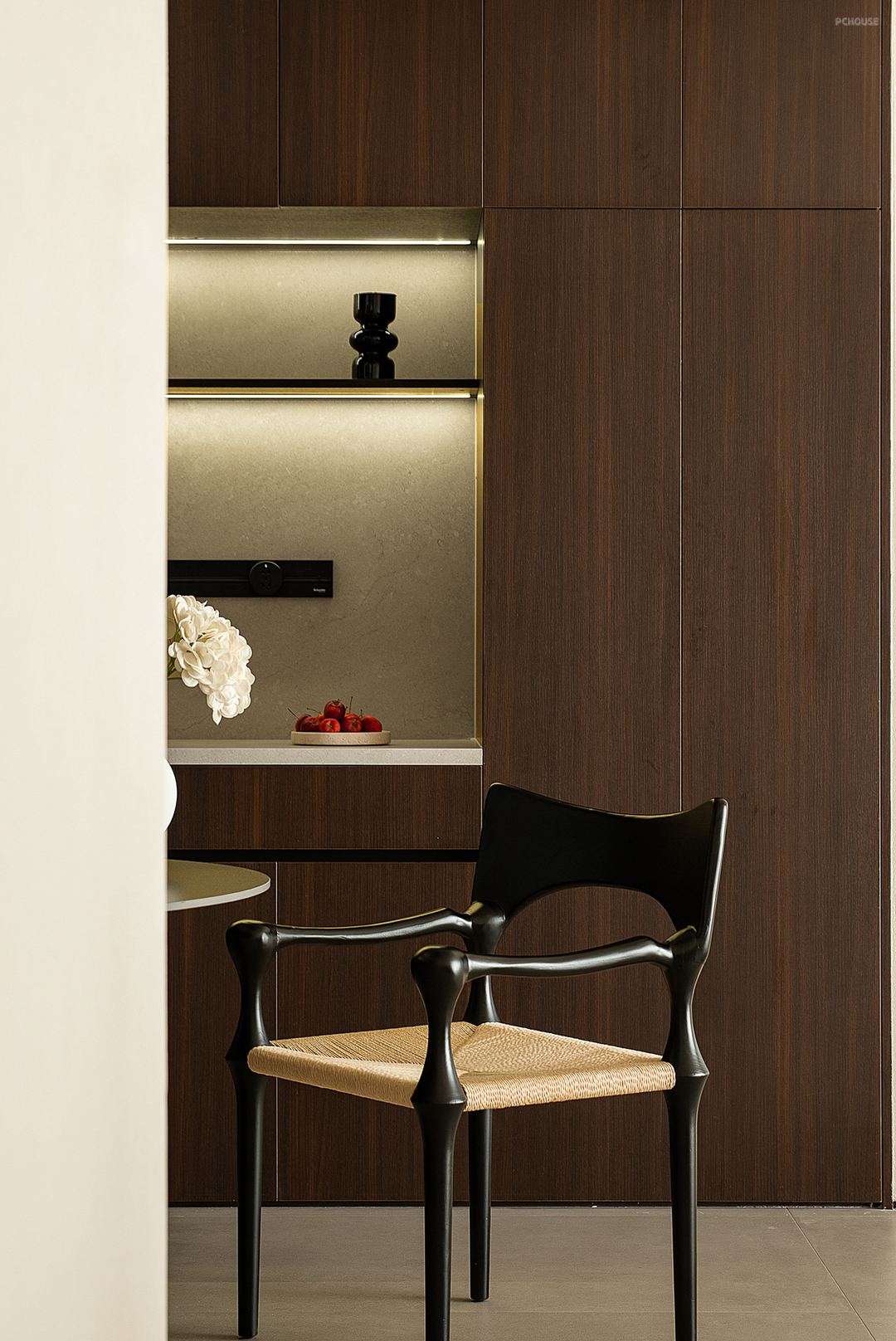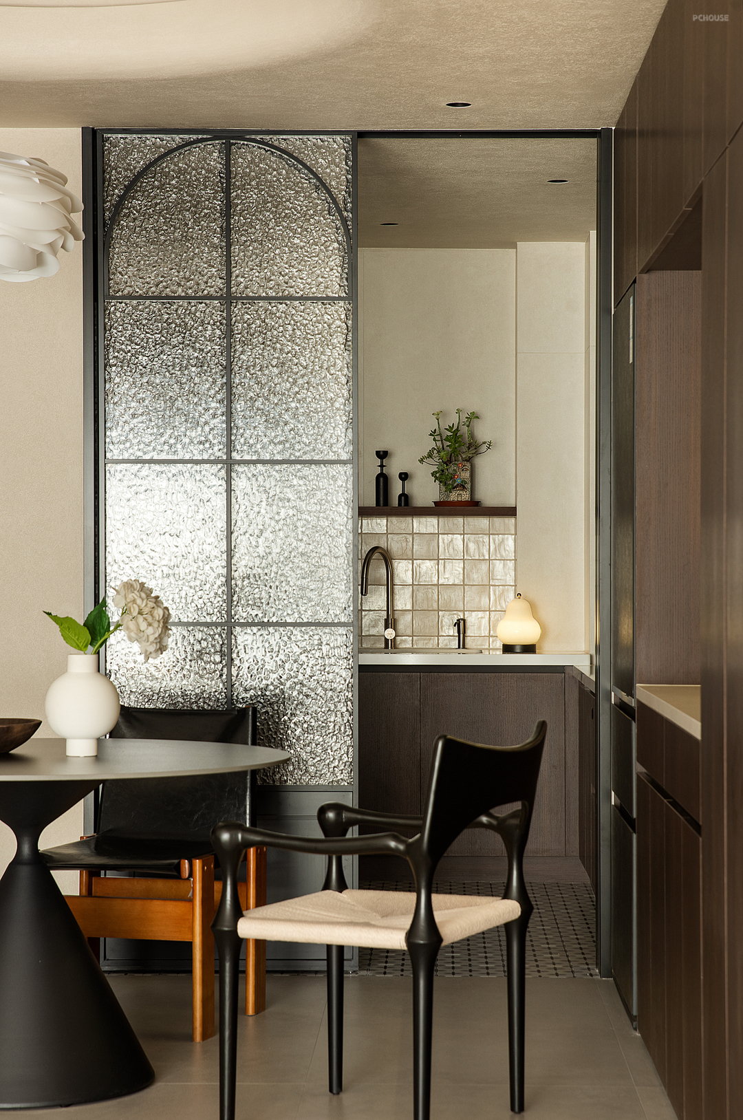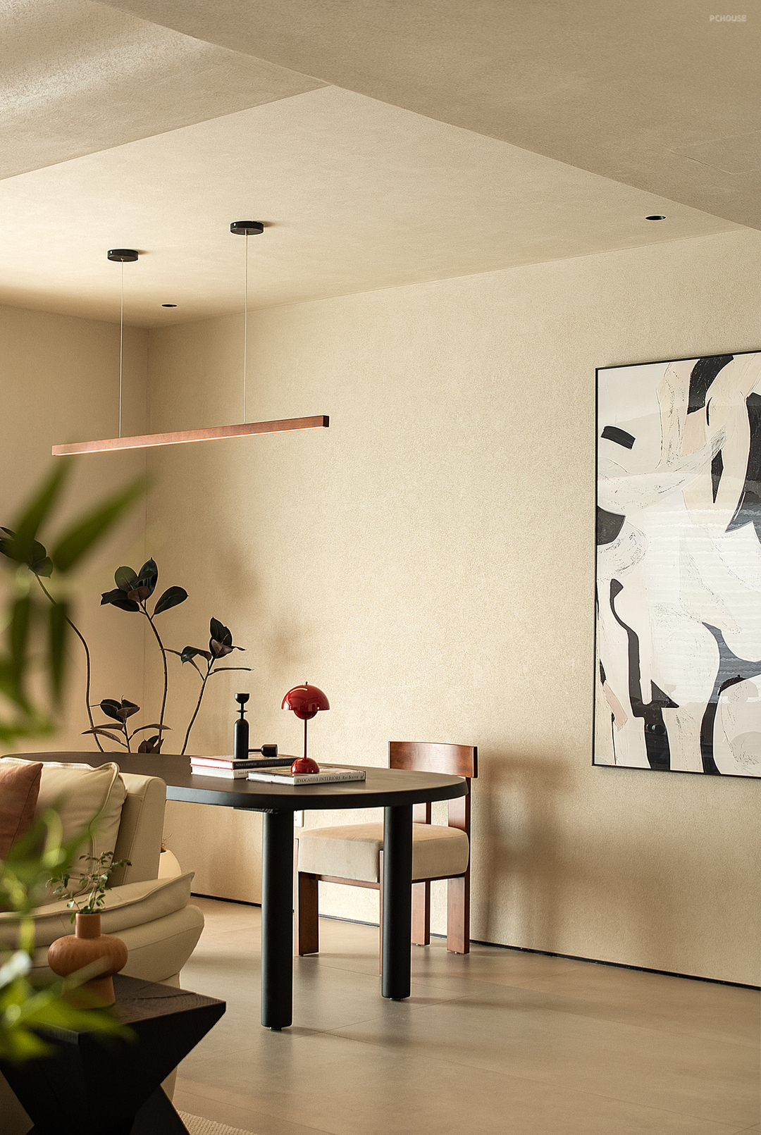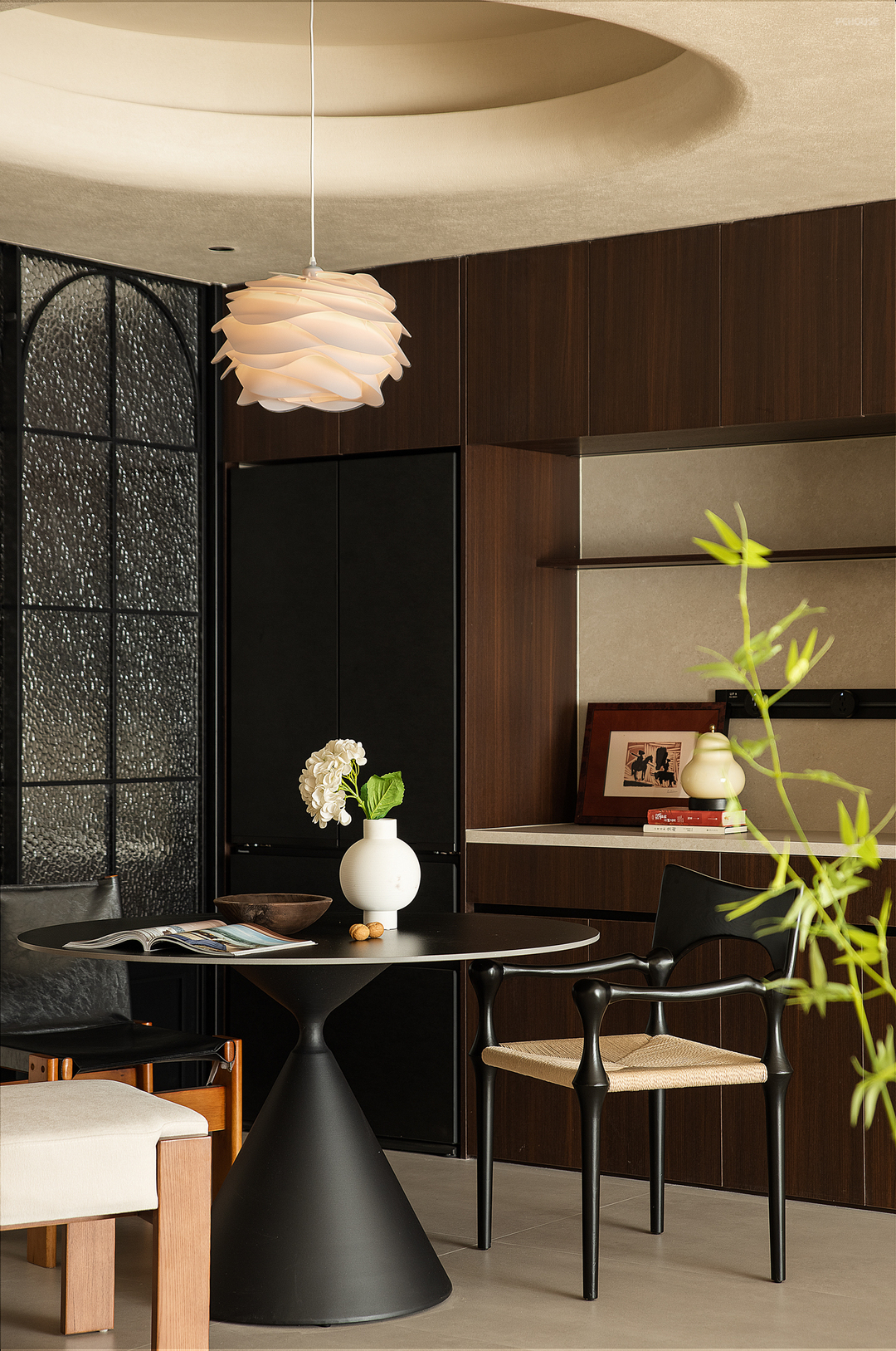 于一片米灰色的背景之中,依墙而设,餐厅处定制的深色一字形柜体兼具西厨、收纳、展示之用,为餐厨区提供必要的功能补充。三人用餐区居于中央,四周的环形动线有利于生成最近的到达路径,形式各异的餐椅则表达着业主不与众人同的喜好,一组吊灯之下,即便寻常的一日三餐,也变得意义深刻。