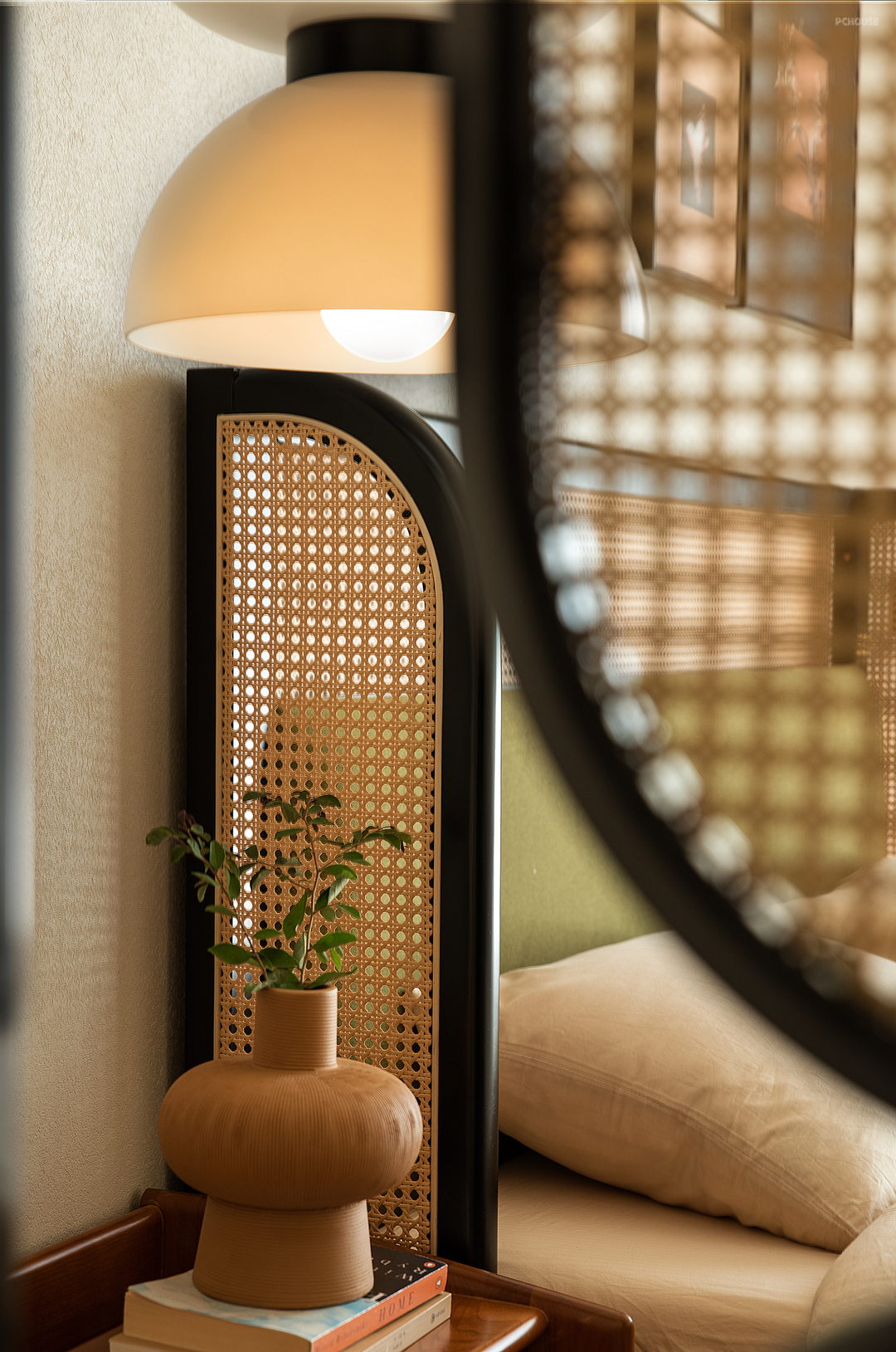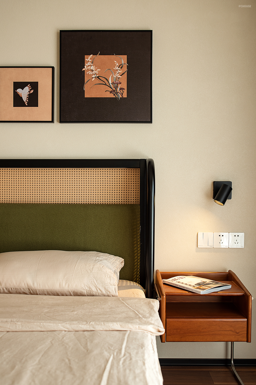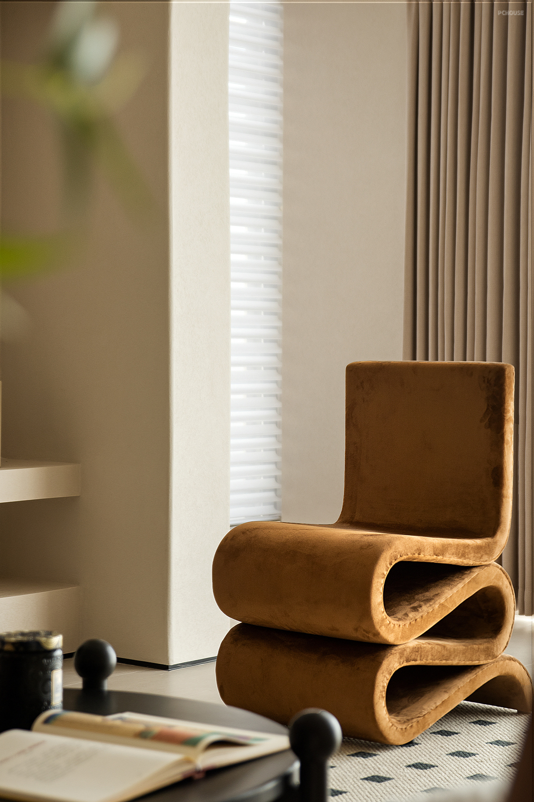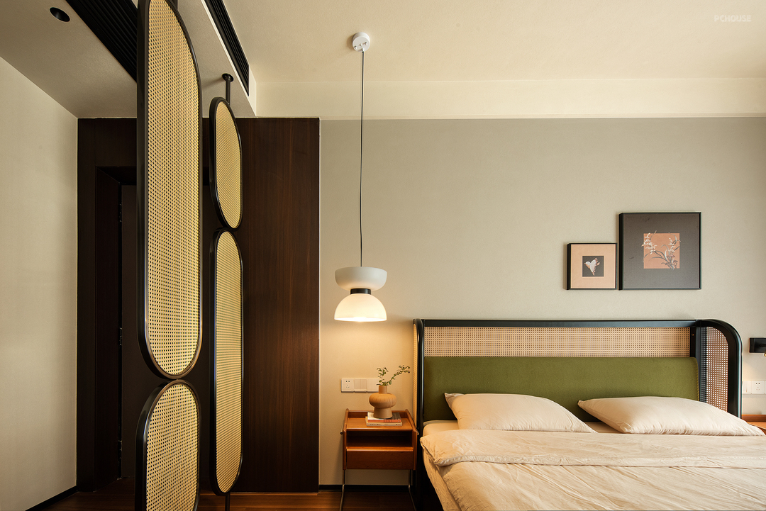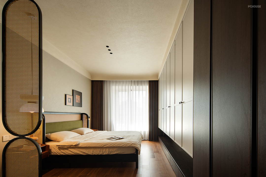 主卧延续整体氛围质感,卧室是娓娓道来的自由舒适,用巧思把收纳与空间尺度感融入细枝末节,光线穿过纱帘有层次地进入空间,松弛感油然而生,让人随心沉浸到自我的空间当中。