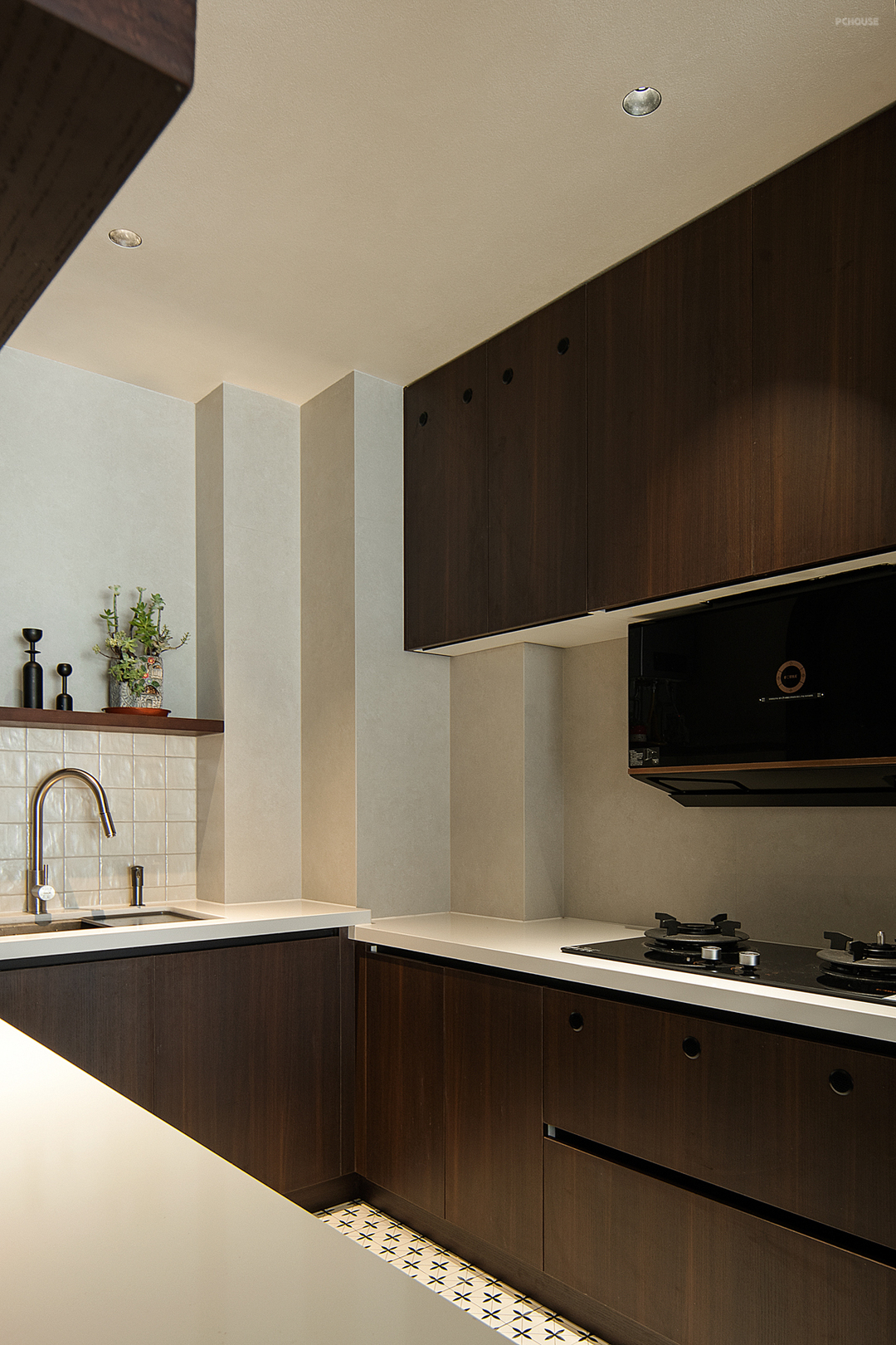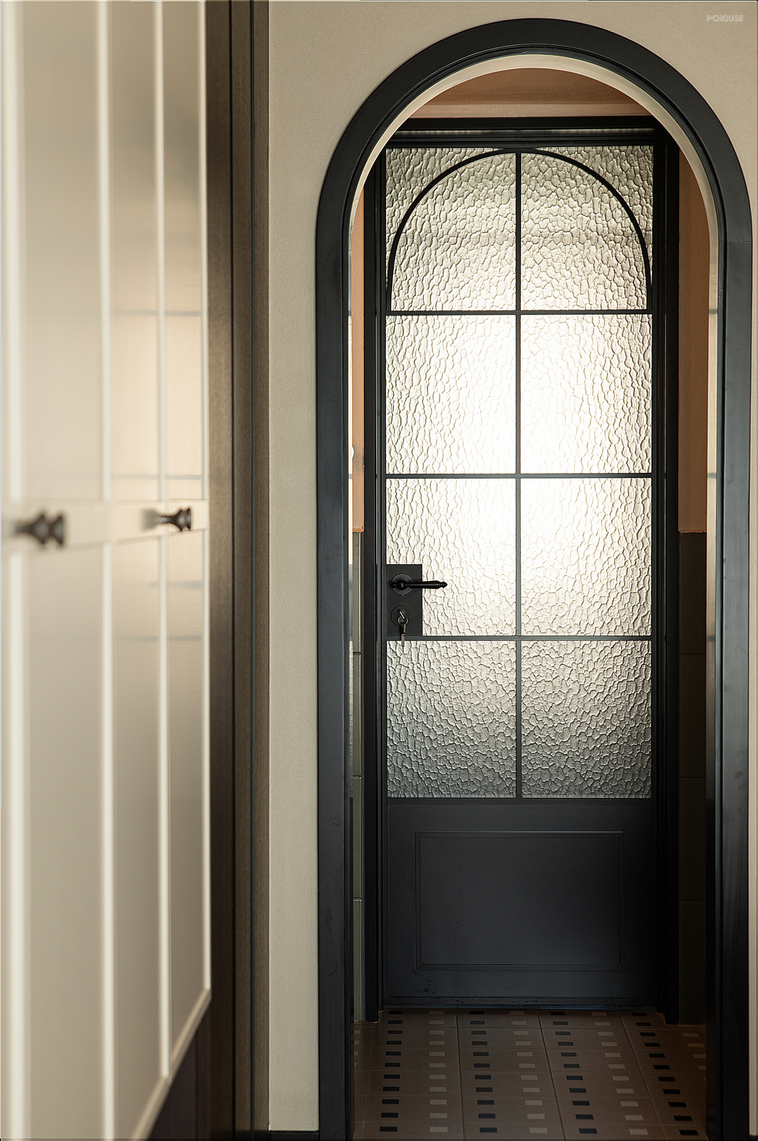 本案中用设计打破原始沉闷的户型,消除传统物理边界,以简笔串联材质与色彩的流畅度,纵横结构之势舒展留白姿态,释放更多样的当代生活方式。入户部分,集强大收纳功能的柜子和厨房玻璃窗户组成墙体,极具纵深感。隐去多余装饰,简洁且实用,让生活转场规整、有序。
