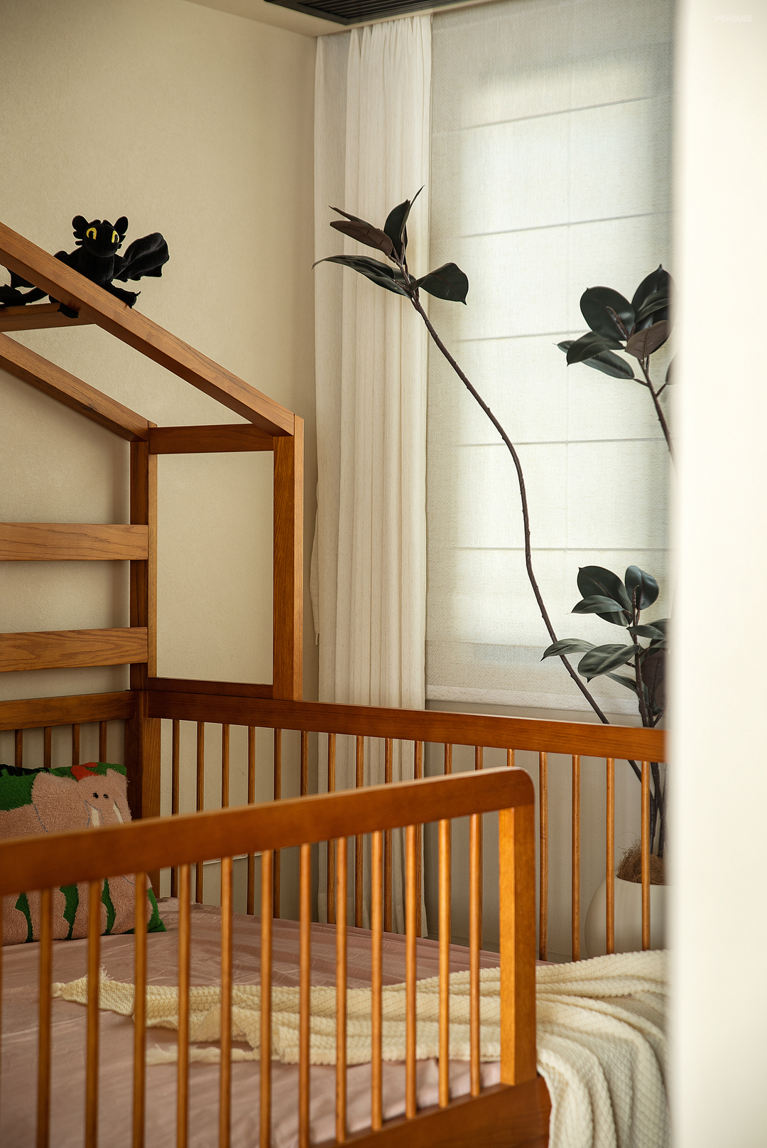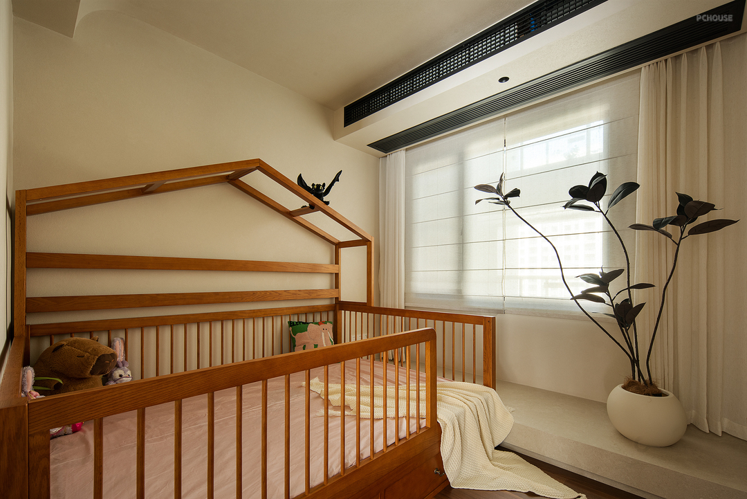 空间并非独立存在,它往往需要与使用者或居住者相契合,所以每个家都是独一无二的,反映了业主的个性、审美趣味以及精神面貌。次卧贯彻当代语态,运用自然的木色适量配入,塑造柔和宁静的睡眠空间,以自然的色彩讲述空间故事。并以带有法式氛围的罗马帘纱帘组合,赋予空间光影层次提升居住愉悦感。