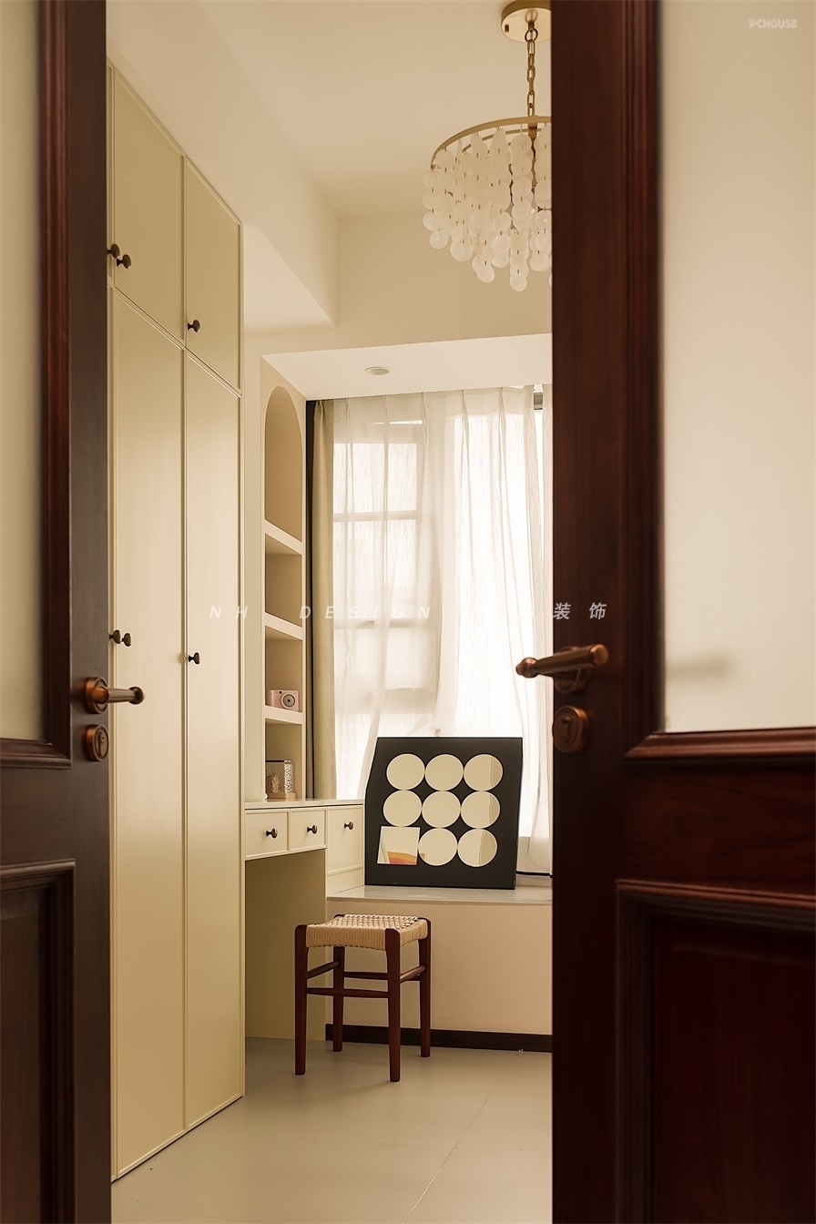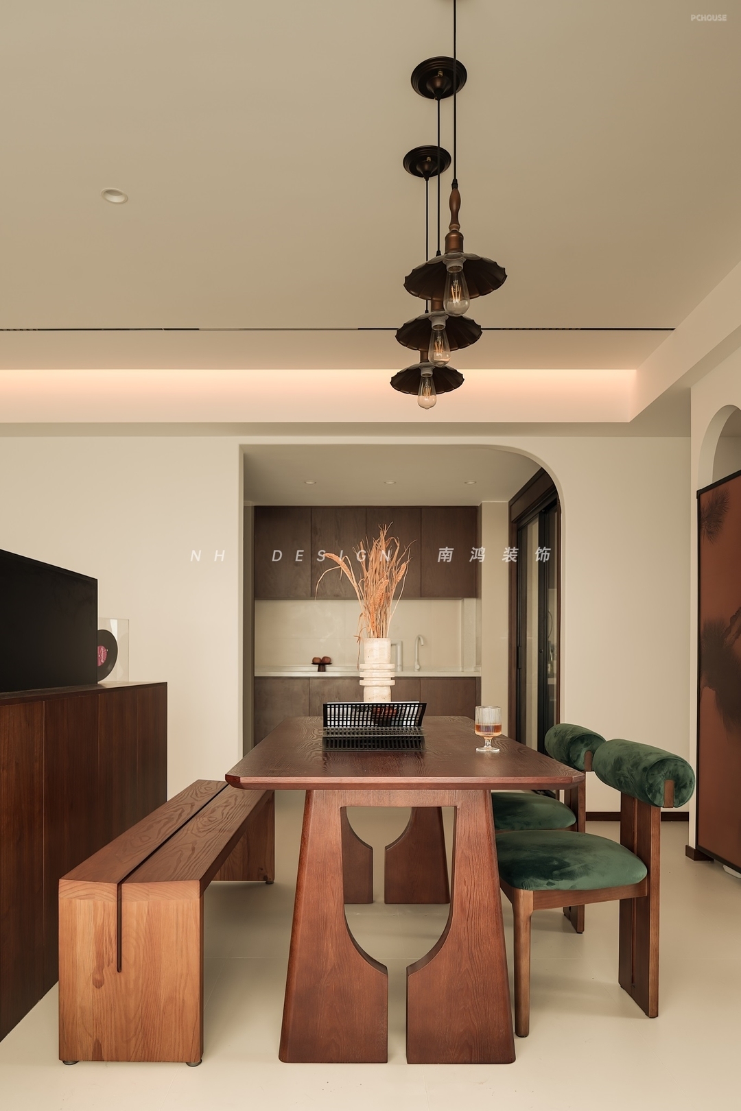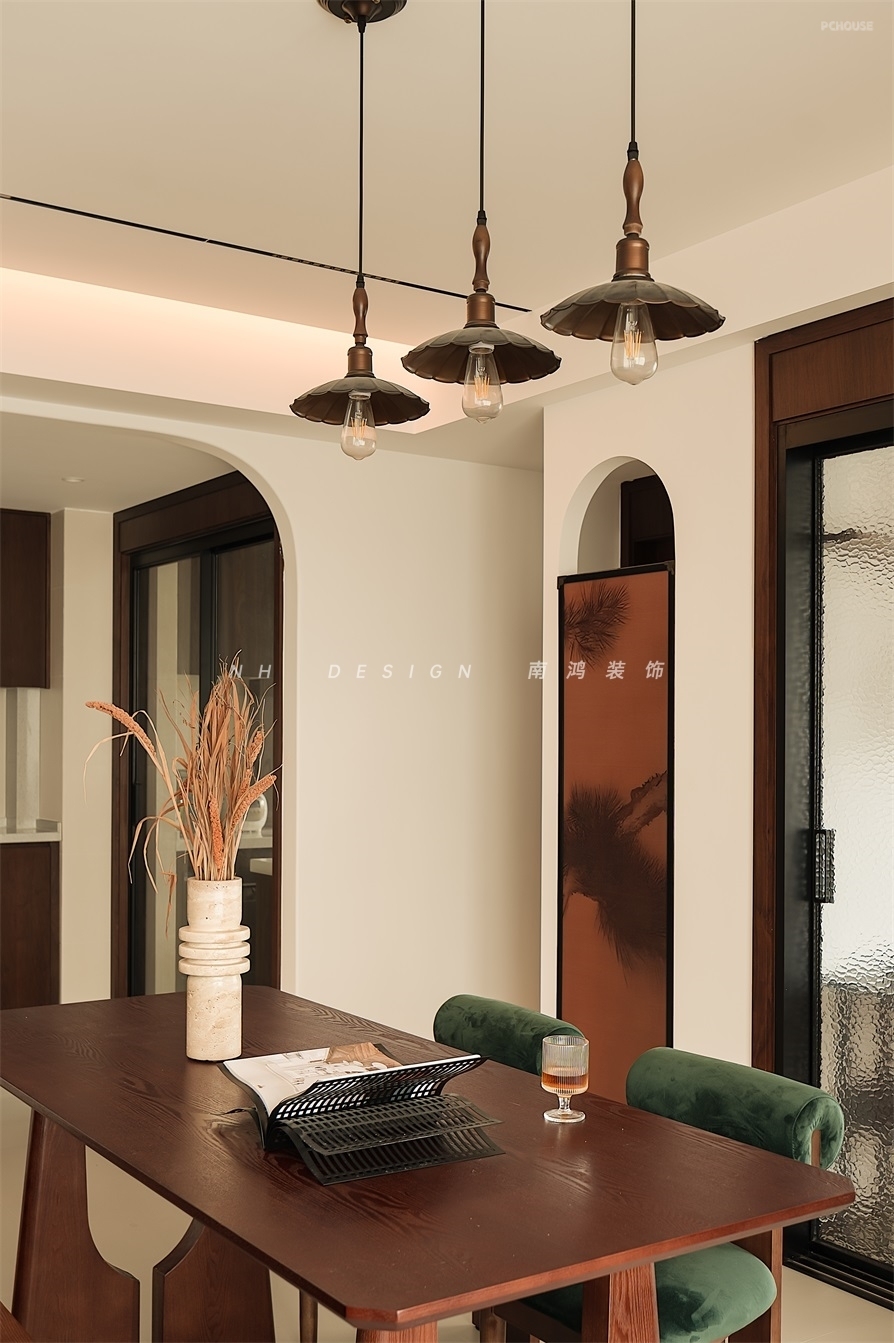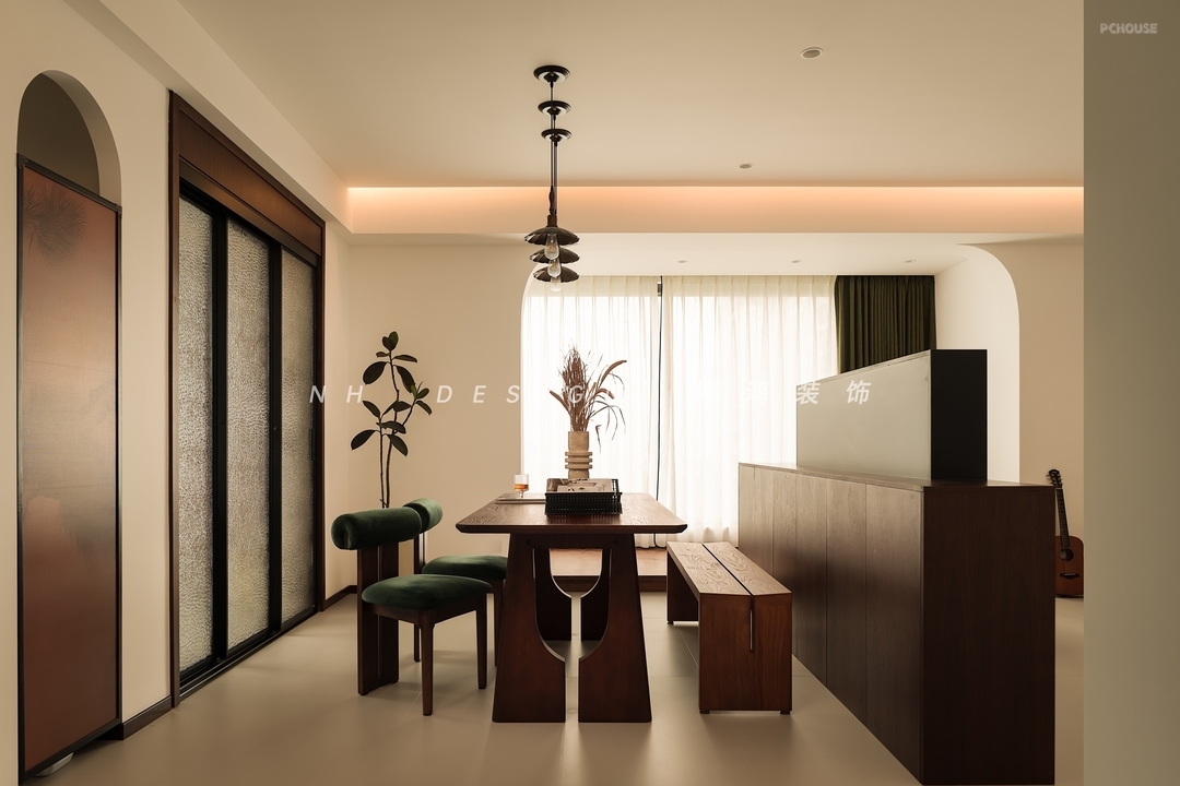 餐厅使用餐椅与长凳的组合,搭配造型感木桌与中古风吊灯,萦绕在空间中的皆是闲适之味。与书房间的压花玻璃隔断,成为餐区一面文艺气质背景,光线透过玻璃折射而出朦胧变幻,视线随之流动,心绪便也自在漂浮。