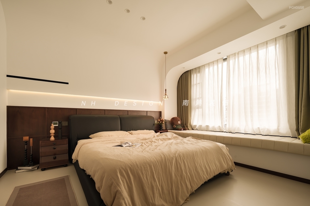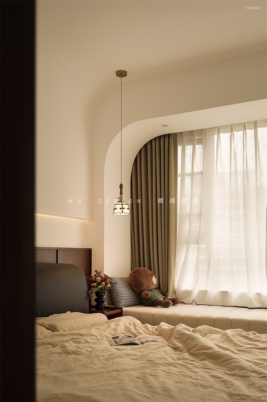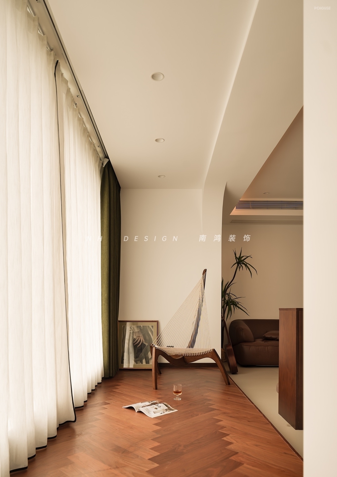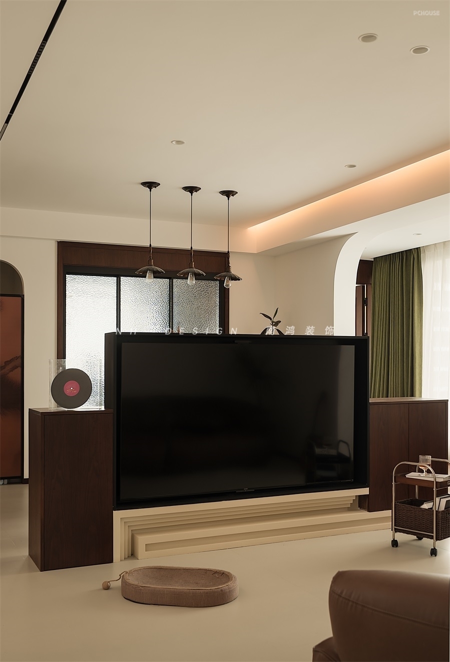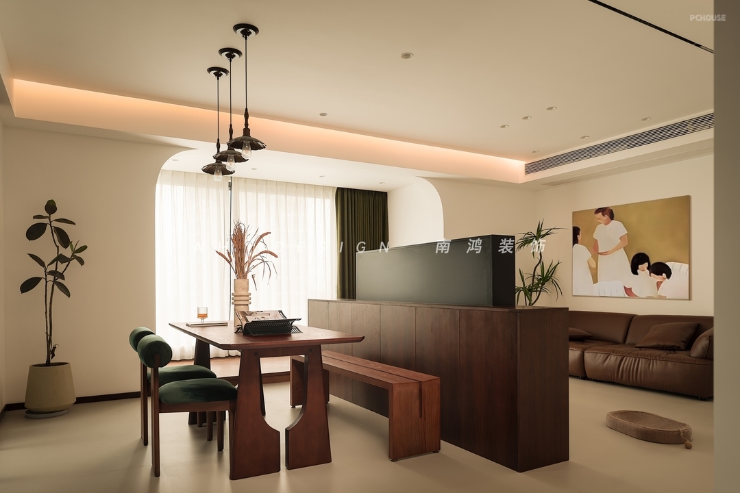 本案横厅的格局,做了客餐厅一体式结合,并以电视矮墙作为轻隔断。空间铺暖白色柔和感基底,满载自然气息的美拉德配色填补画面,带来闲适、温暖、安然的居家感受。