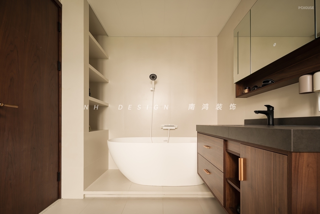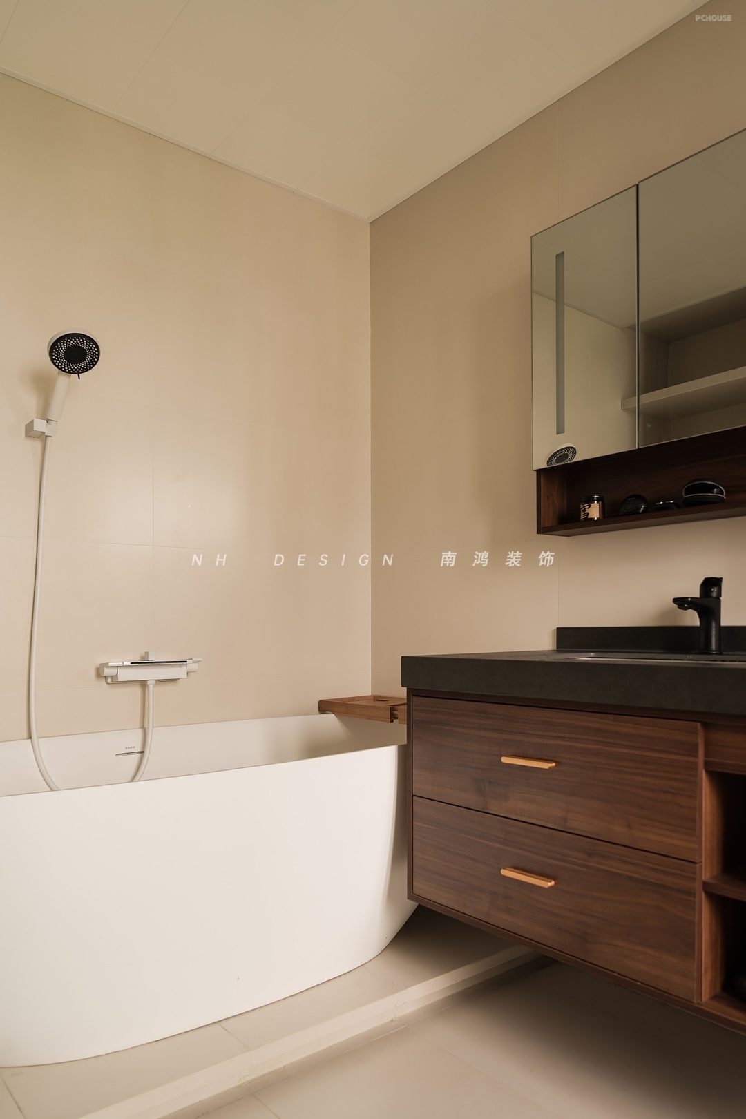 主卫包覆浅色哑光砖扩大空间感,台盆柜+镜柜解决大部分收纳,浴缸区的地面则做了约十公分的抬升,为沐浴营造仪式感。立面以壁龛为形,轻巧扩充储物容量,帮助维持卫浴间的干净整洁。