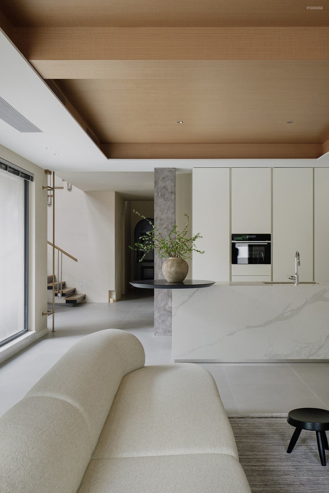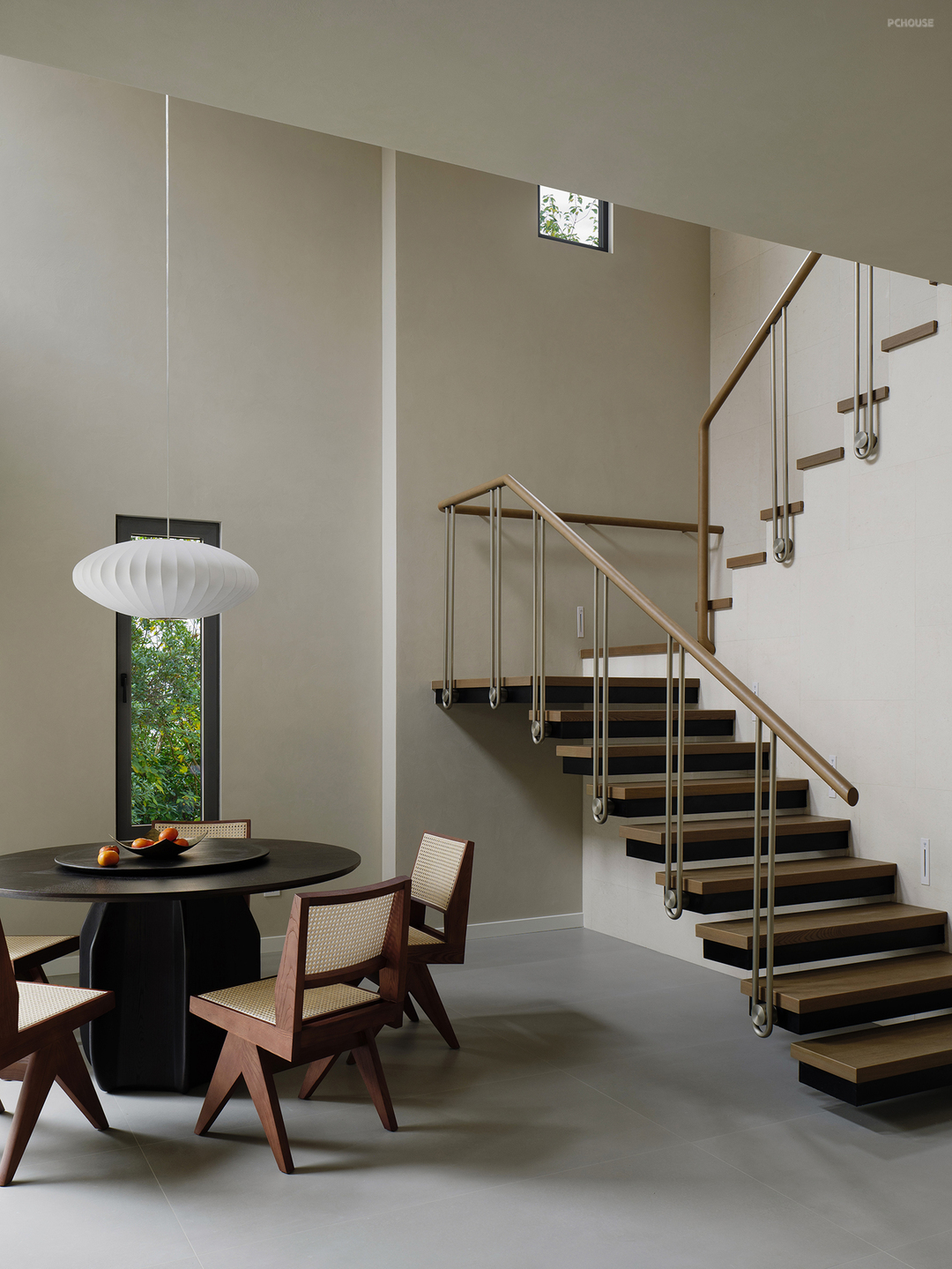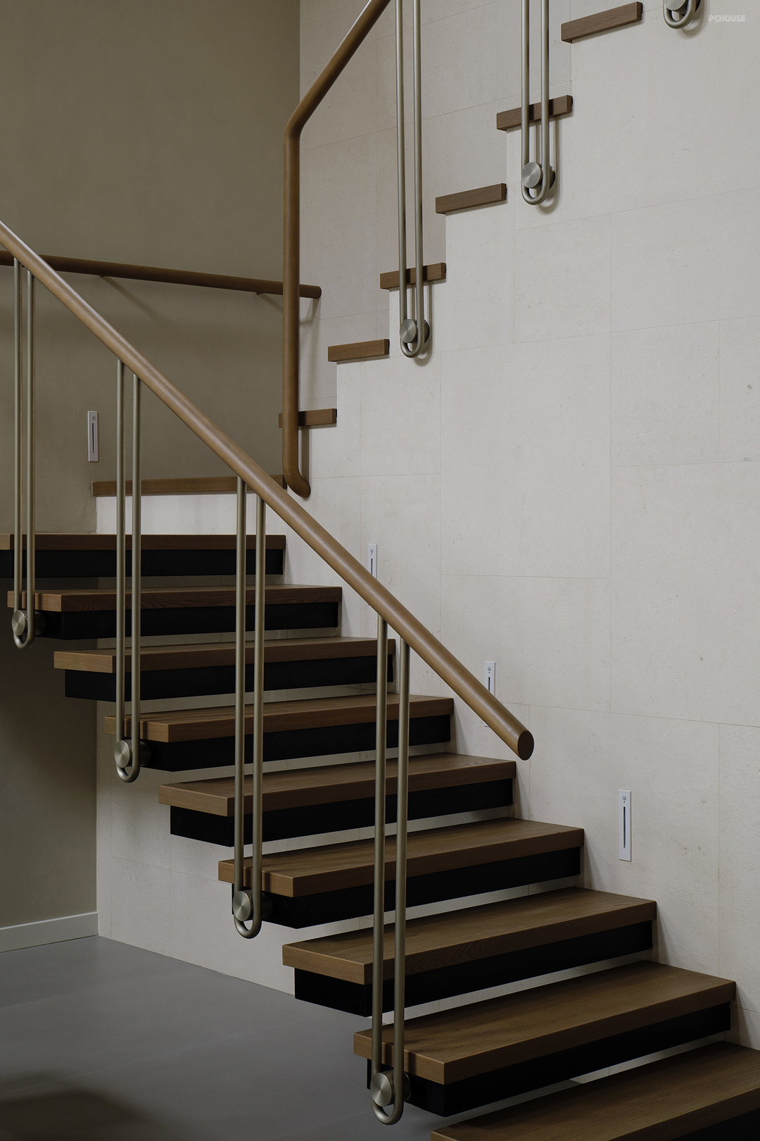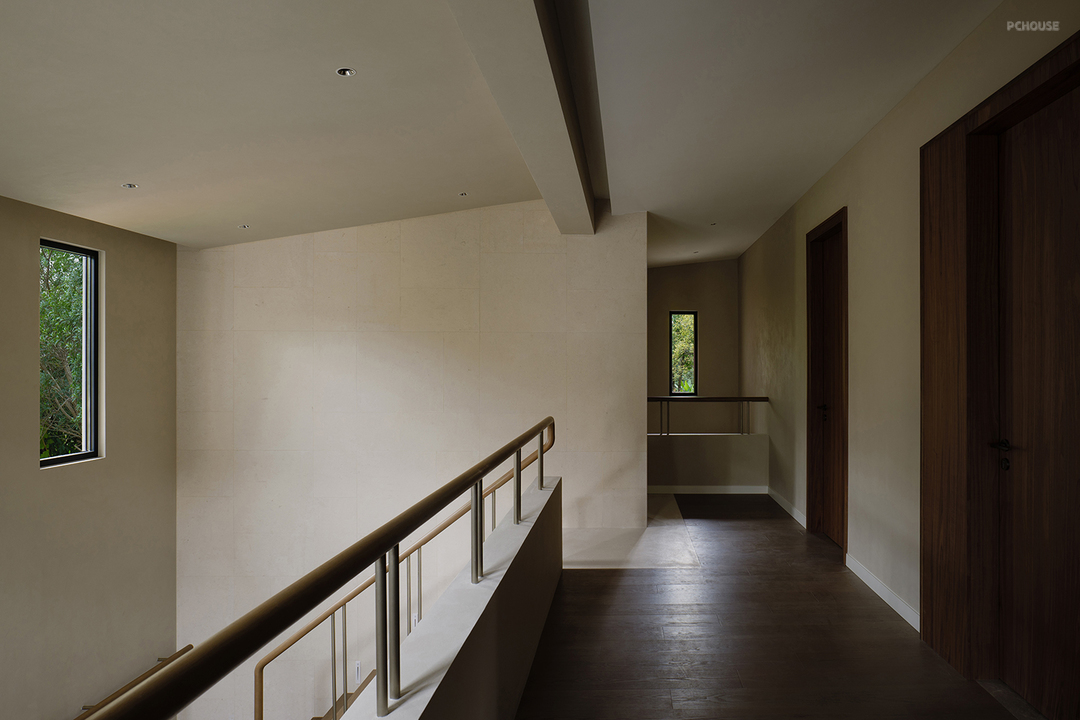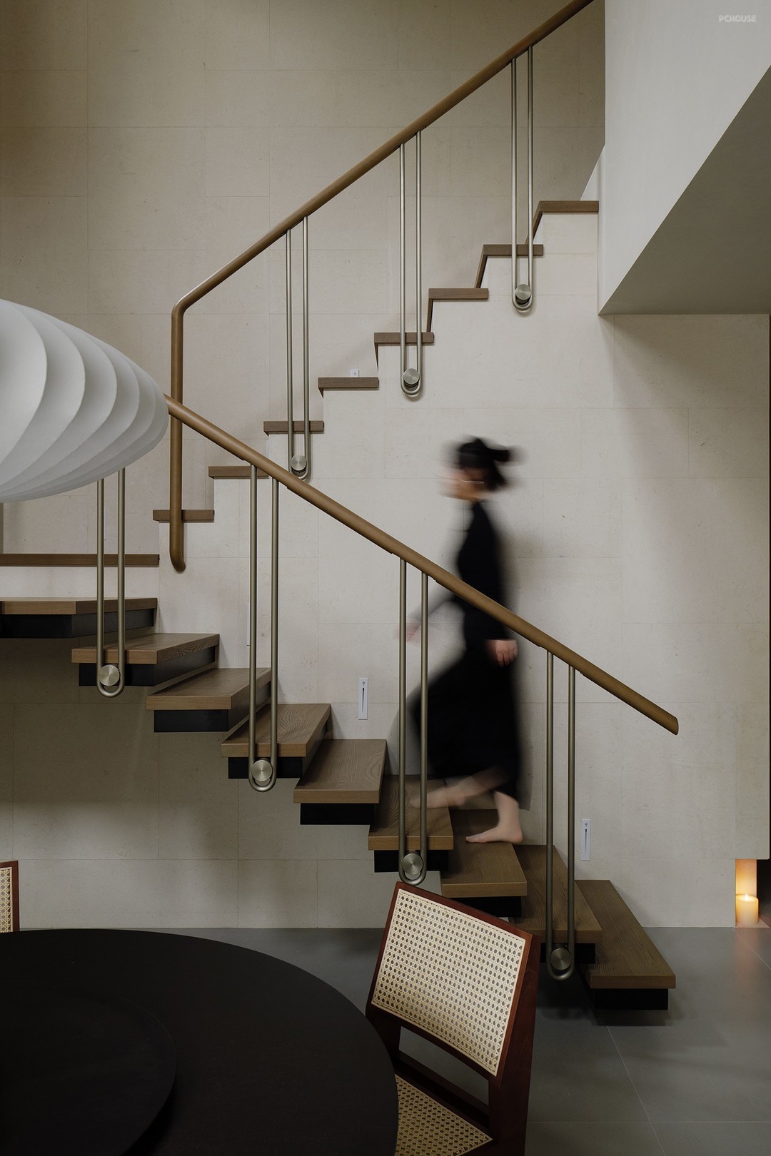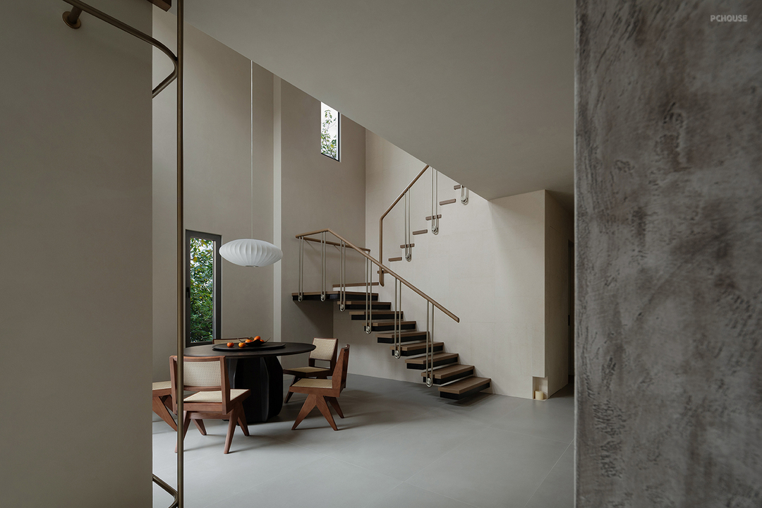 悬浮式楼梯构造勾勒出轻盈的线条,金属与木材两种触感和观感皆大相径庭的材质,在设计手法的碰撞中展现出极简主义的格调,而莱姆石材质的延续则在视觉上形成了空间的韵律感。