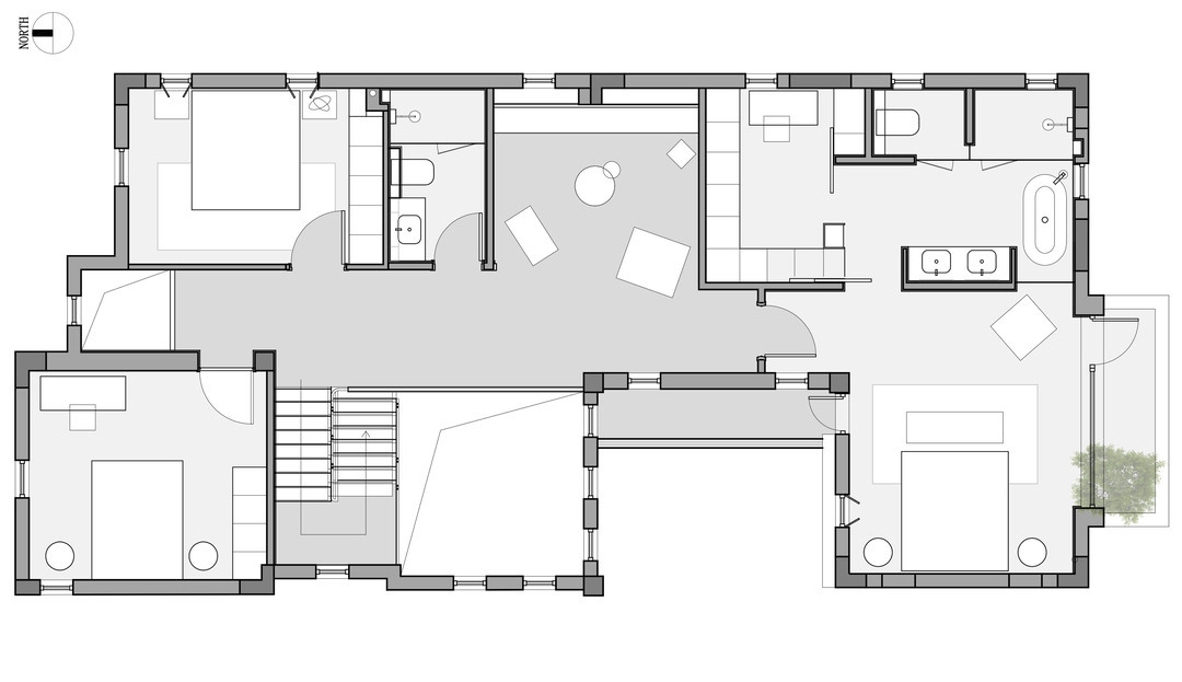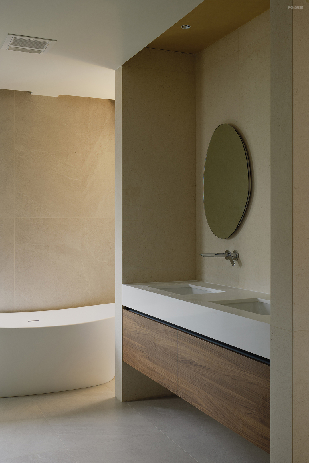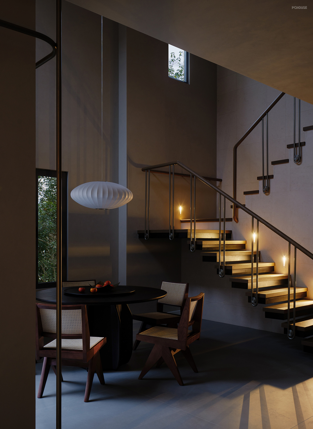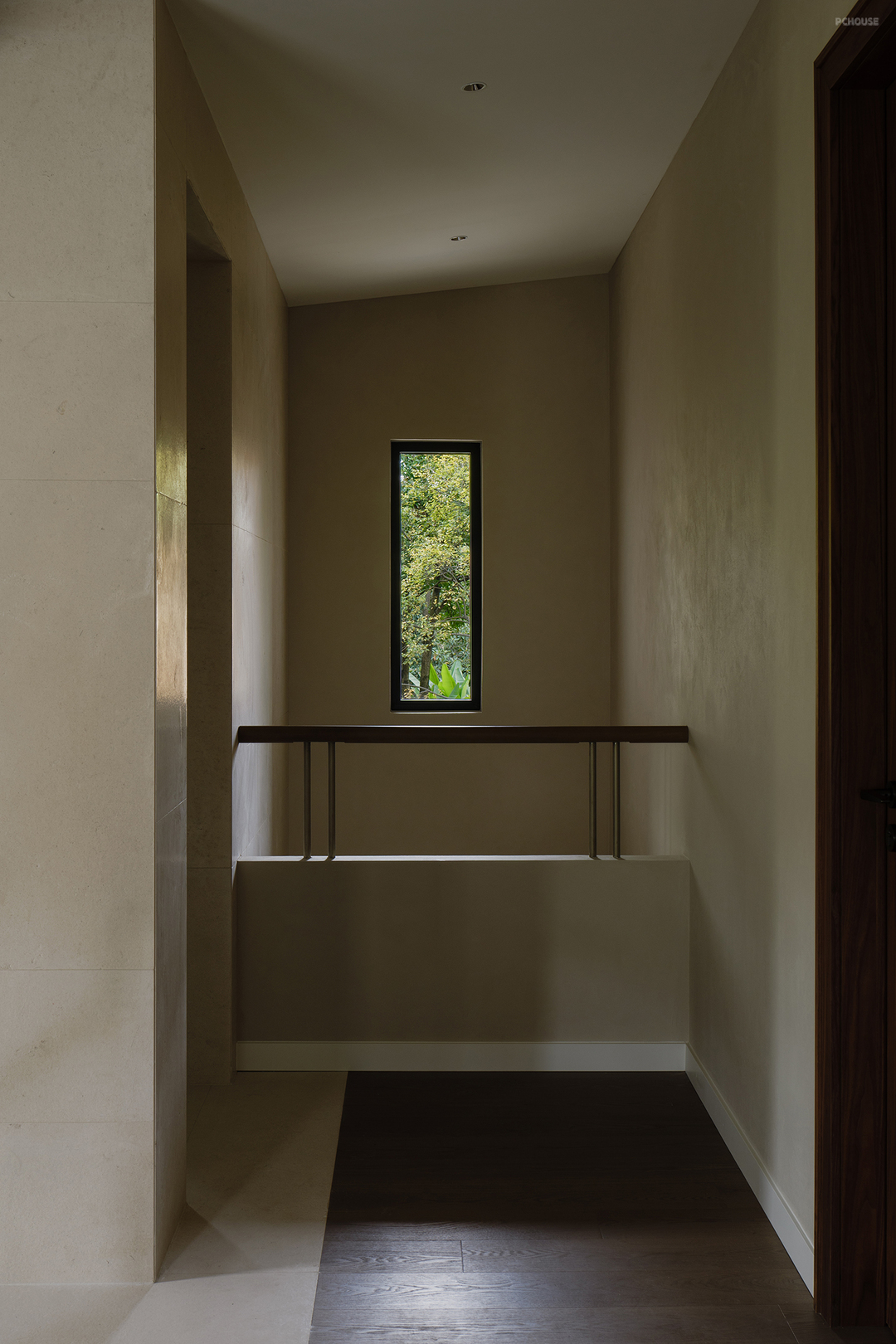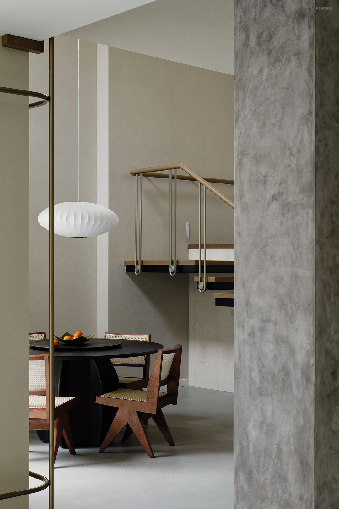 悬浮式楼梯构造勾勒出轻盈的线条,金属与木材两种触感和观感皆大相径庭的材质,在设计手法的碰撞中展现出极简主义的格调,而莱姆石材质的延续则在视觉上形成了空间的韵律感。