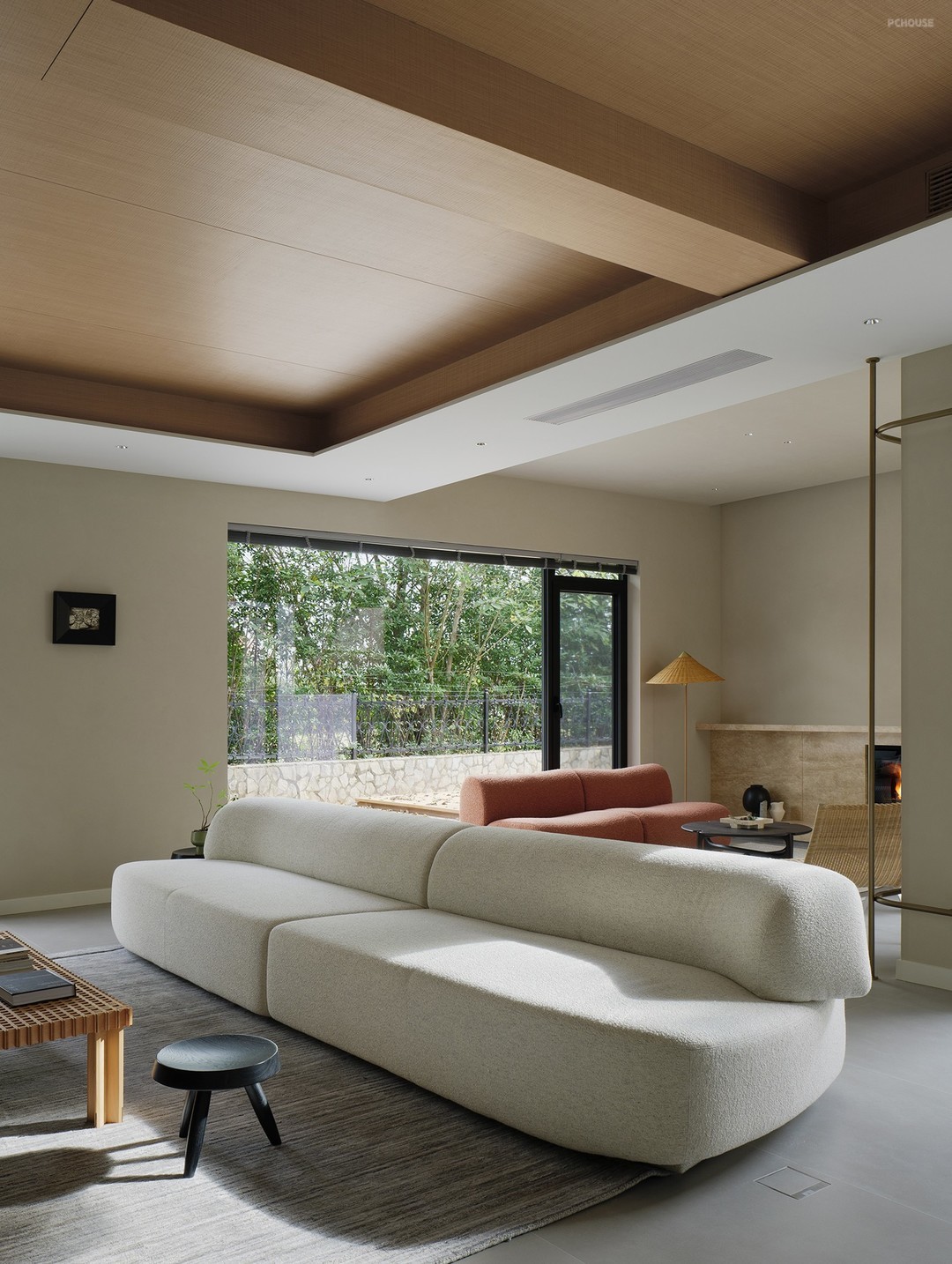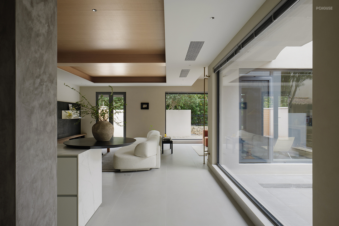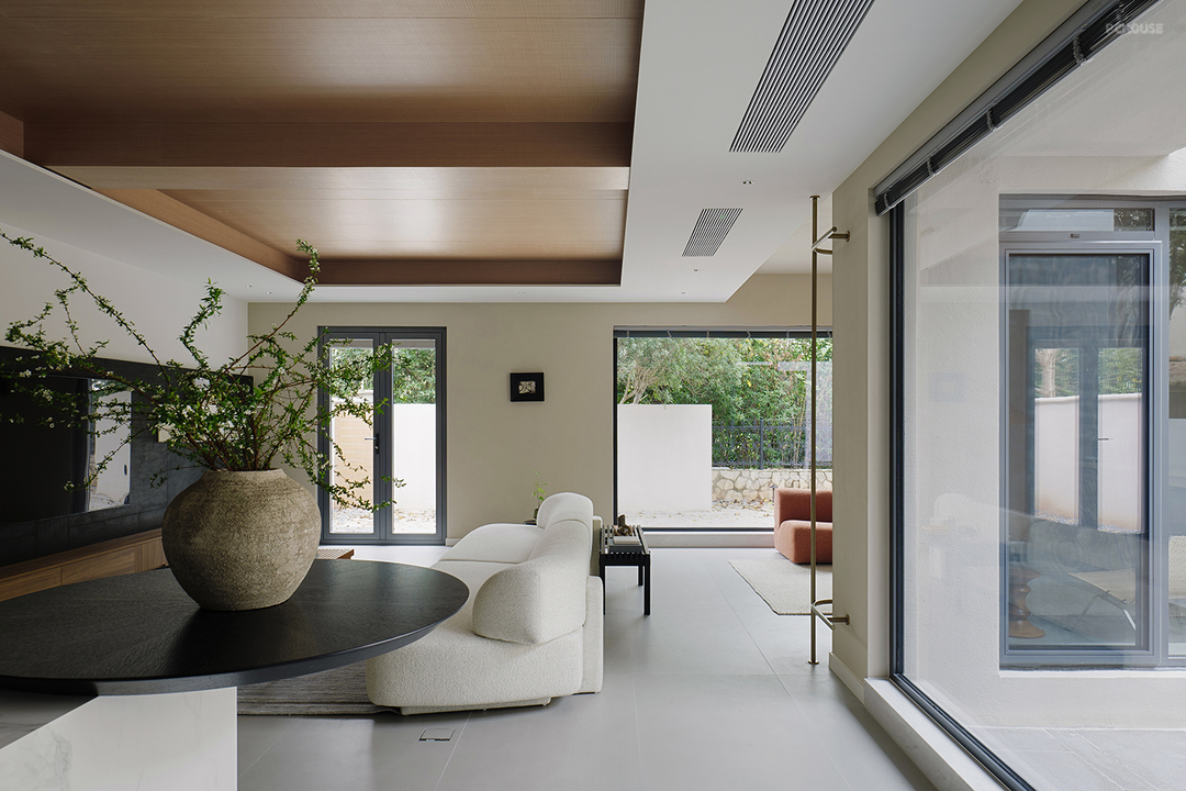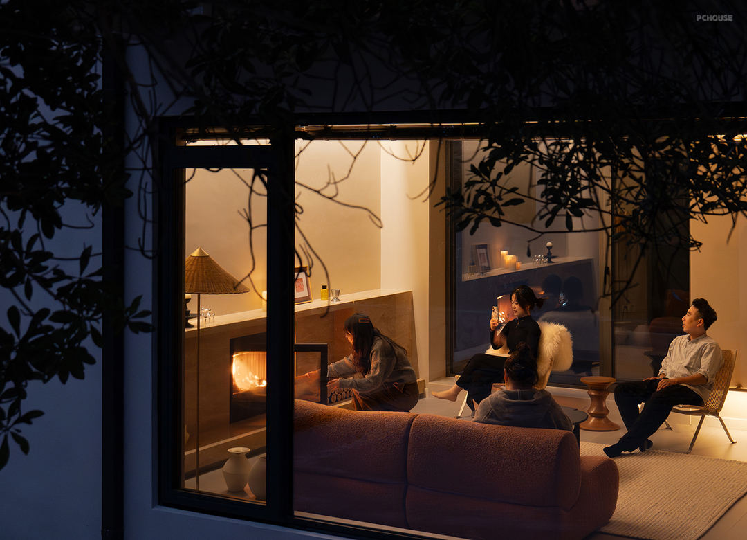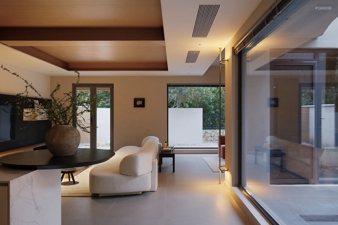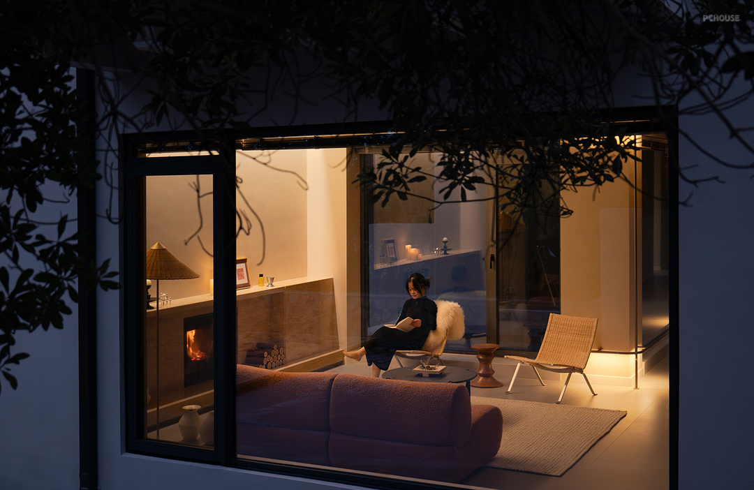 通透的落地窗户将庭院美景尽收眼底,室内外浑然一体。或观冬日飞雪纷扬,或赏夏日碧叶婆娑,将自然蓬勃的生命力揽尽。春秋更替,色彩与光影交织变幻,映照着四季的轮回,在心灵深处勾勒出期冀。