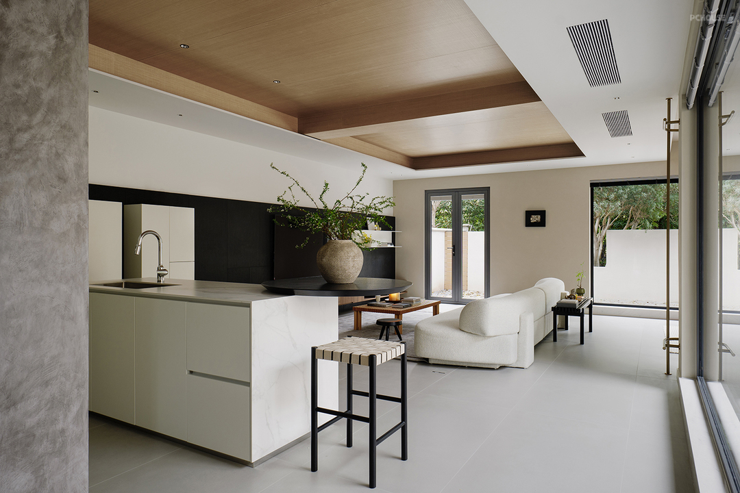 相交于古典城堡的设计,设计师更期望于简单和纯粹,西厨与客厅连接,西厨需要开放式的布局和随意的空间形式,洋溢着自由不羁,又承载着家人互动的温情。