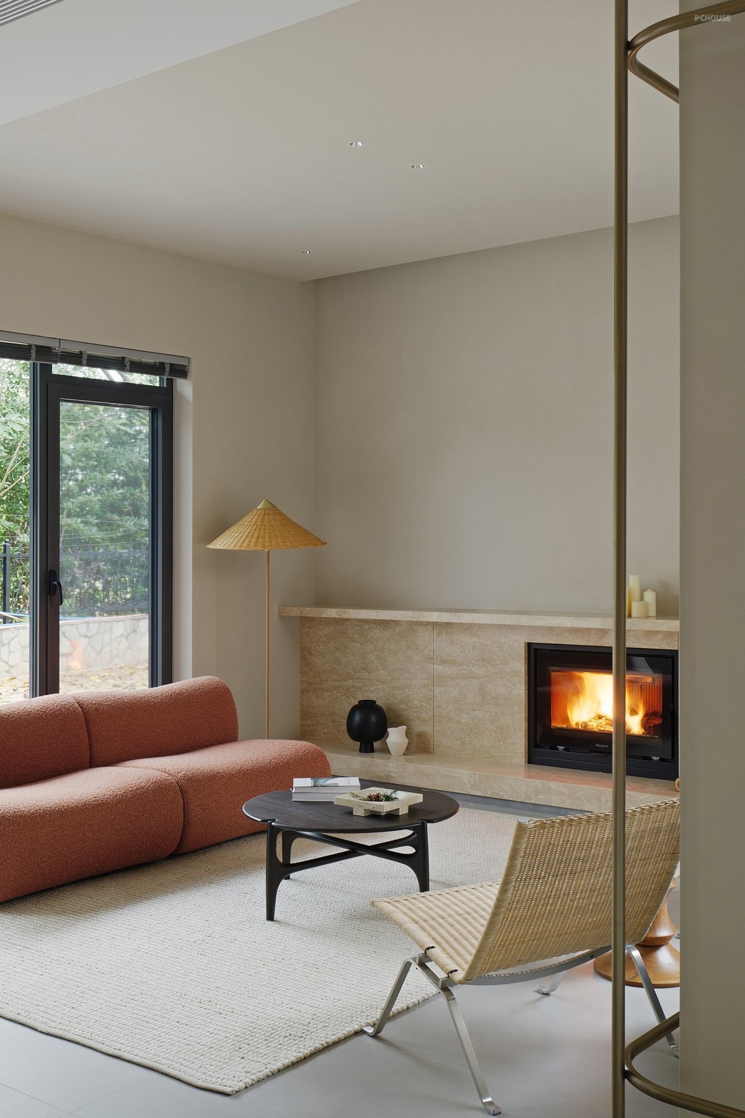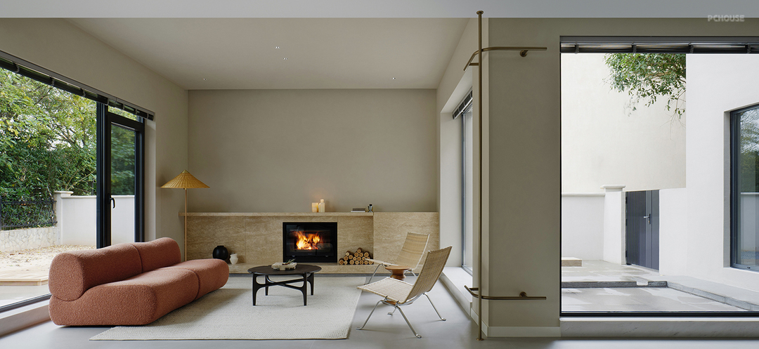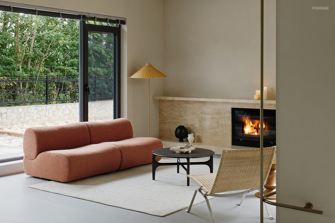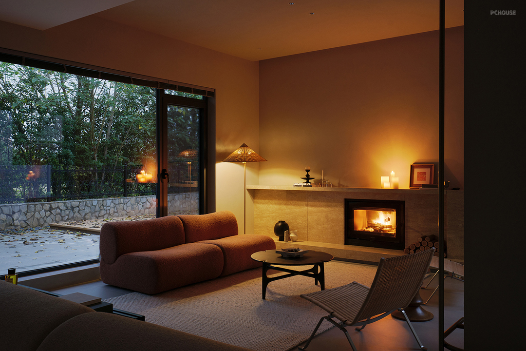 温暖的火光轻轻跳跃,映照着一室的宁静祥和。藤椅斜倚,红沙发柔,时光在此,缓缓淌过,窗外绿意隐现,窗内炉火微燃。理想的居所,不在华丽,只在心安。