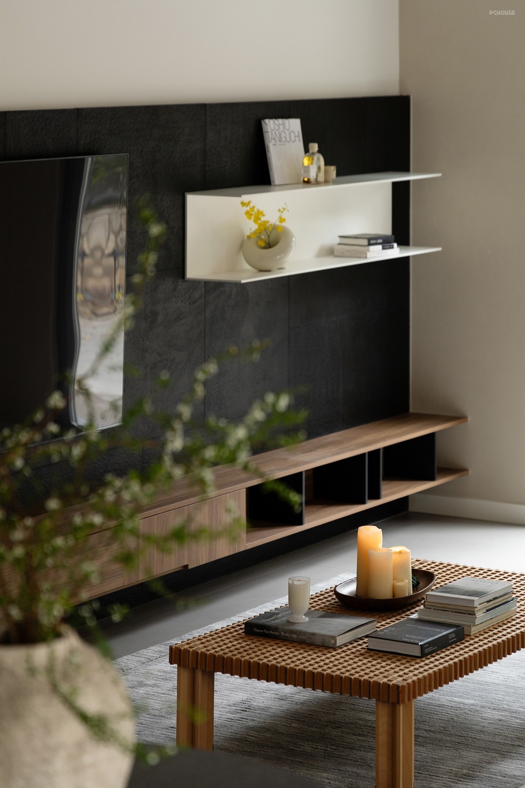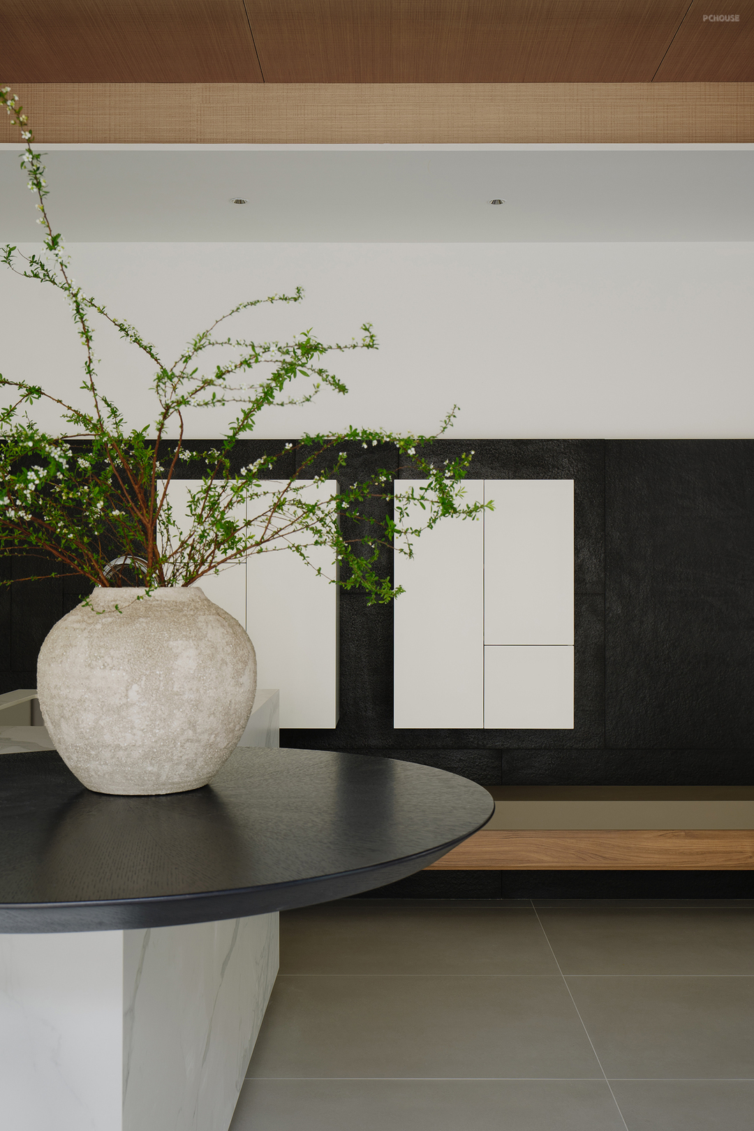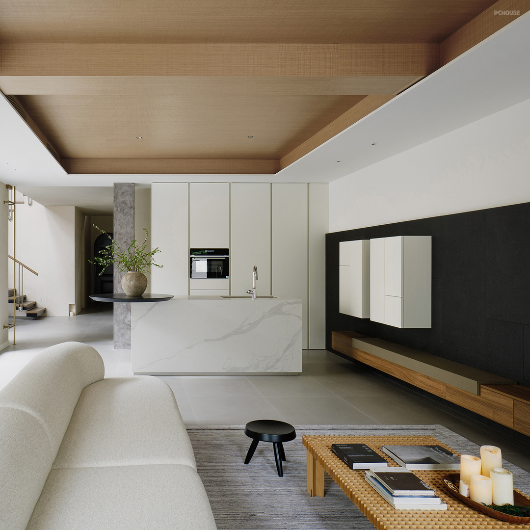 墨色天然石材从厨房延展至客厅尽头,其天然纹理与深邃质感浑然天成。舍弃繁冗的电视柜底座,还原背景墙的纯粹之美。通过不同比例的切割与拼接,石材的线条在视觉上延展开来,令空间愈显开阔。