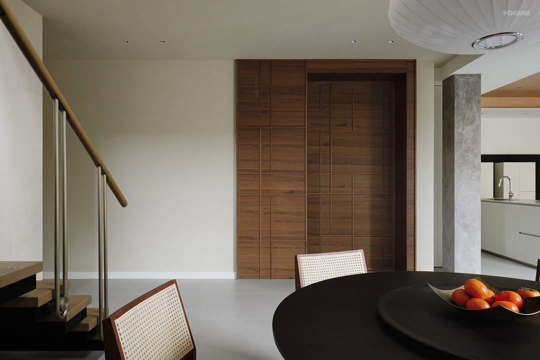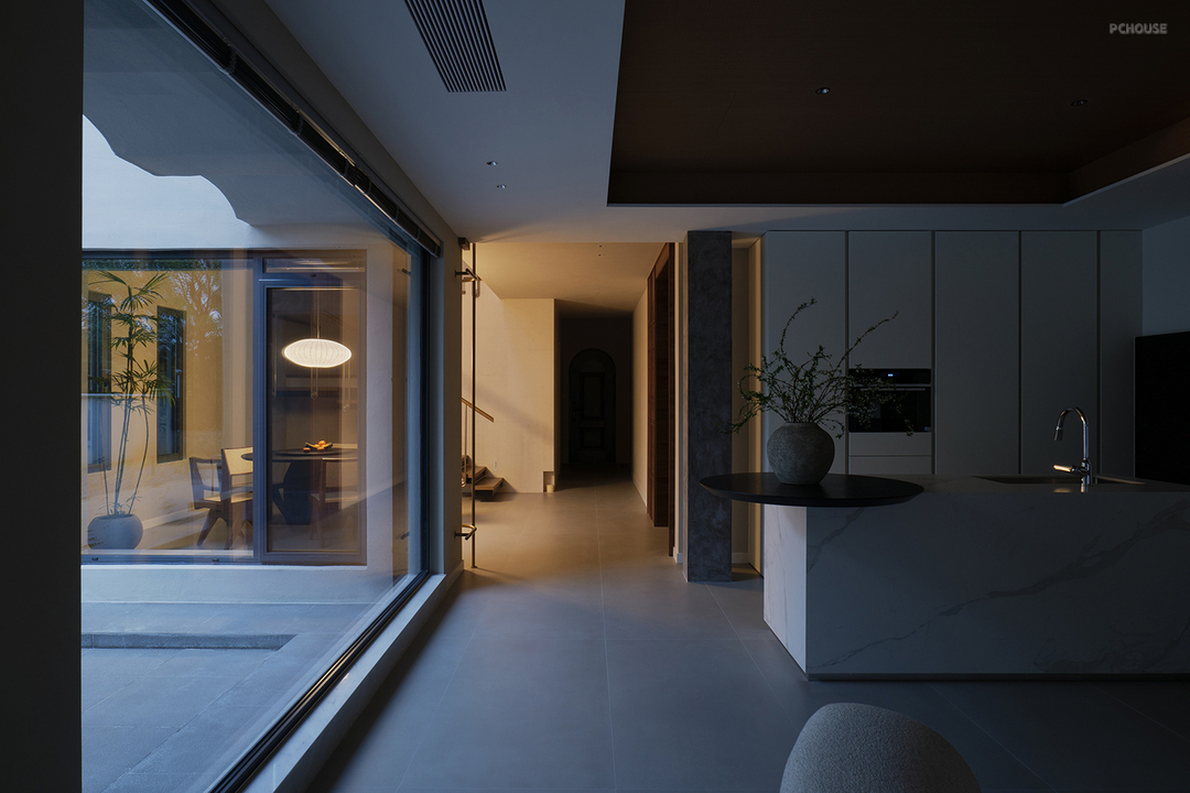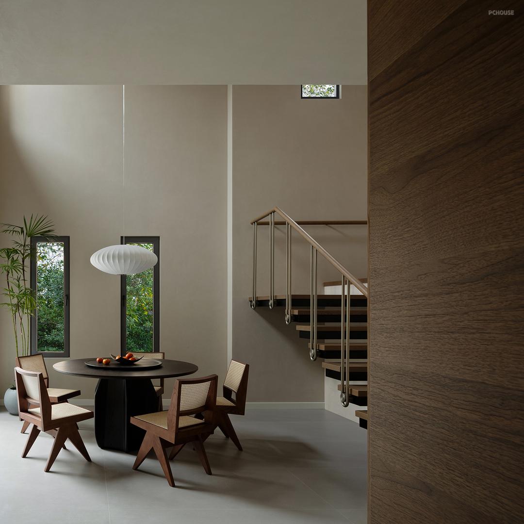 入户长廊,与二楼挑空区域相望,沿着墙壁附上的天然莱姆石,从平面和立面两个维度向着室内展开,延续至餐厅和二楼挑高区域。空间的神秘面纱由此揭秘。