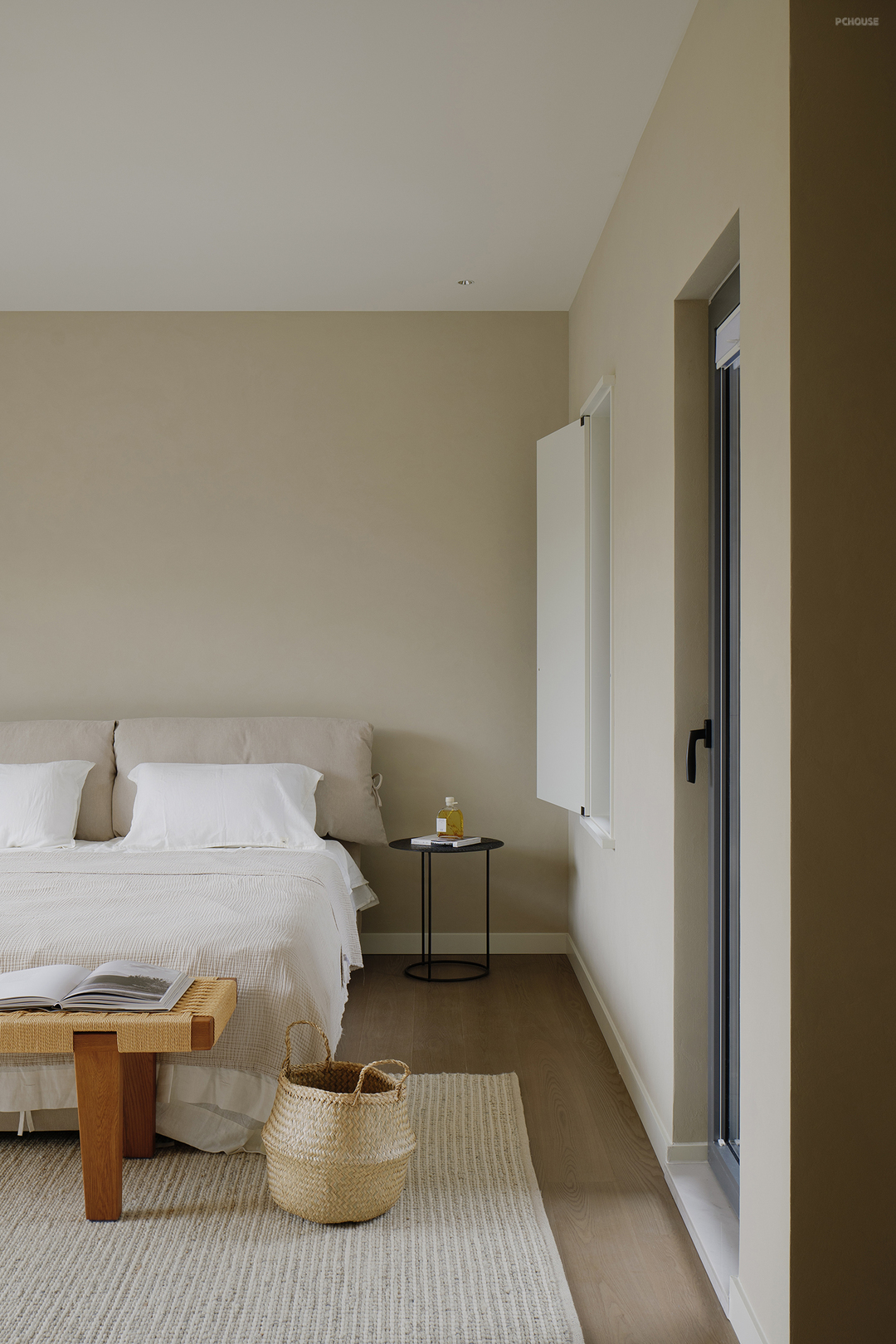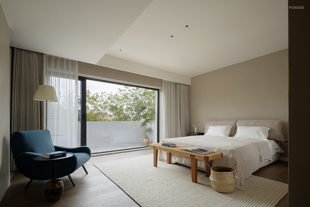 主卧空间在柔和的光线中舒展开来,落地窗外的绿意随风轻摆,从室内看望室外借景入室,风景如画,将自然的静谧引入室内。