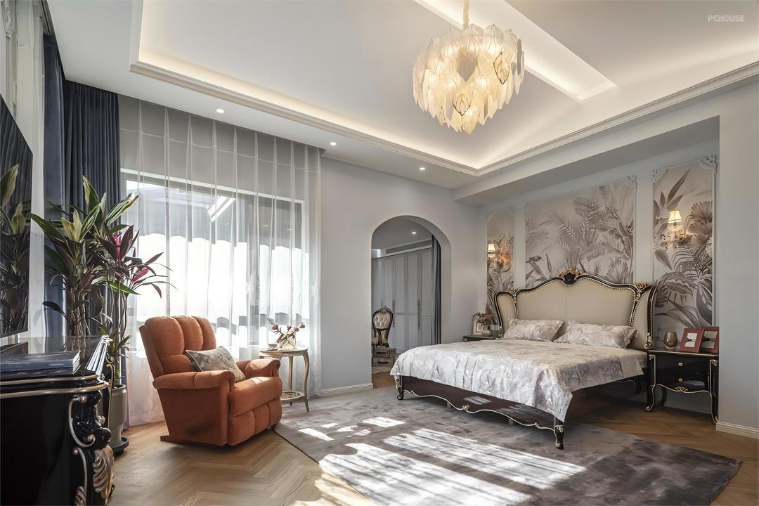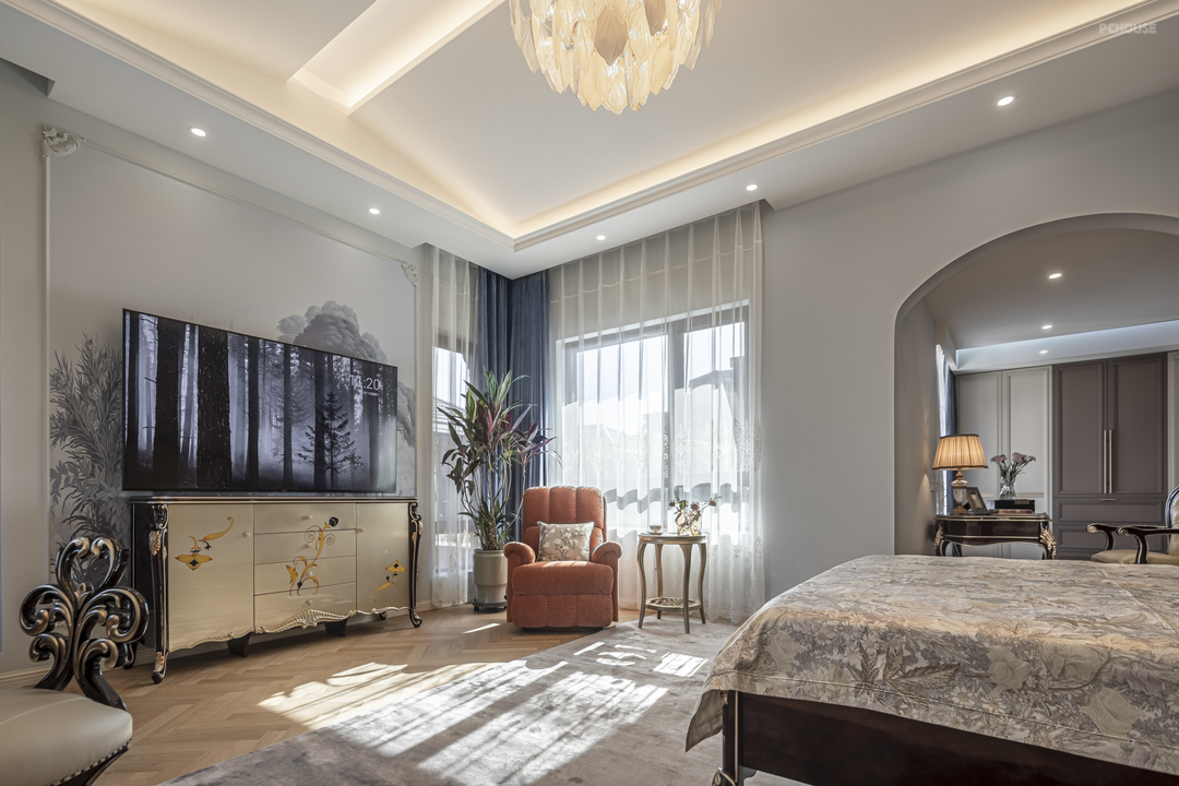 大面积的落地窗,将窗外盛景尽收眼底。整体奶油色营造出白月光般的纯洁浪漫,顶面和墙面的优雅浮雕,延续着法式的浪漫,但是线条更加简约。宽大的床背如张开的怀抱等待着抚慰疲惫的身躯,而靠窗的单人沙发和小灯更添温情。细节的设计上分别以石膏线和壁纸来协调空间的格调,浪漫精致且美好。