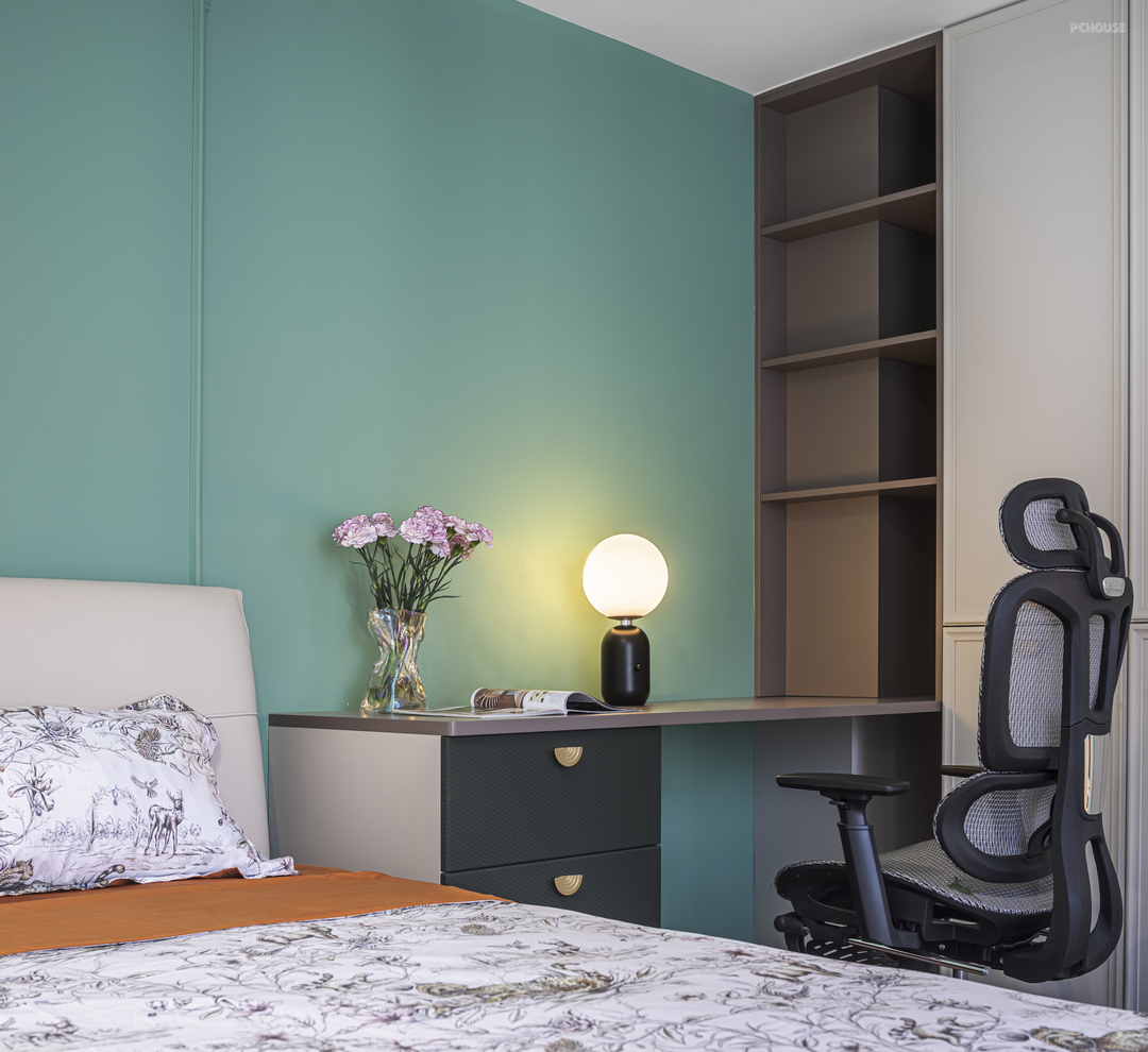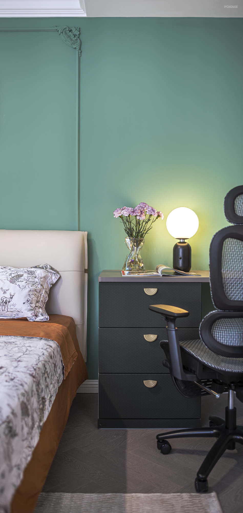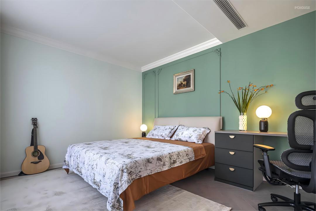 次卧奉行现代简约风格,清新的绿色,是次卧的主基调,简单的空间遇上精致古典的法式线条,在墙面的光影下涌现又退却,安睡在这片简约空间里,生活的安逸,在色彩的斑斓中,流露出美好与静谧。