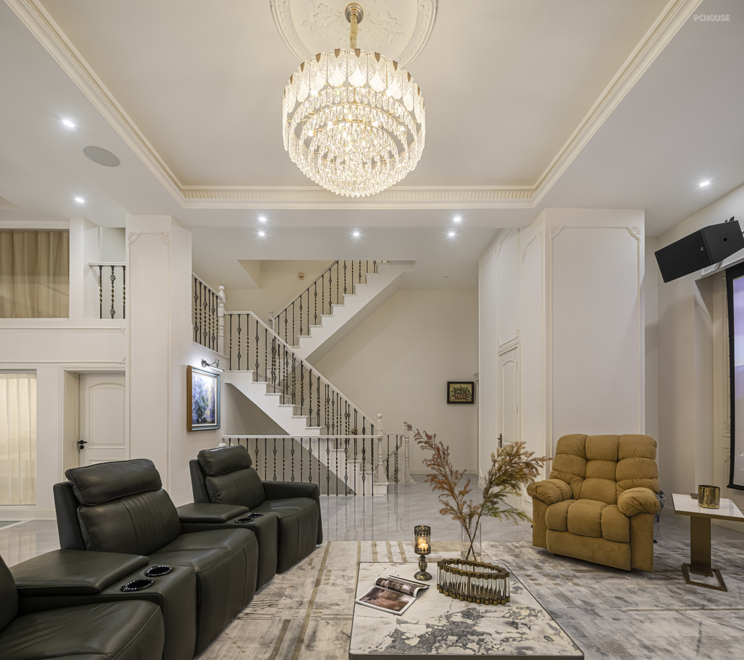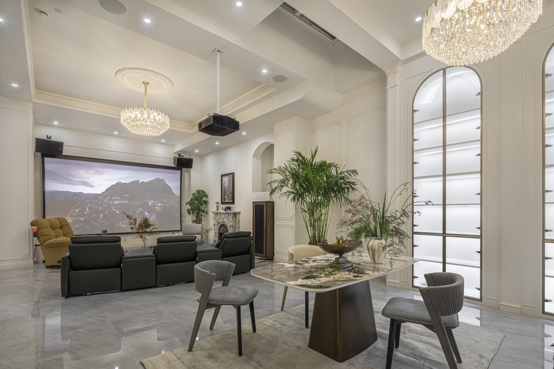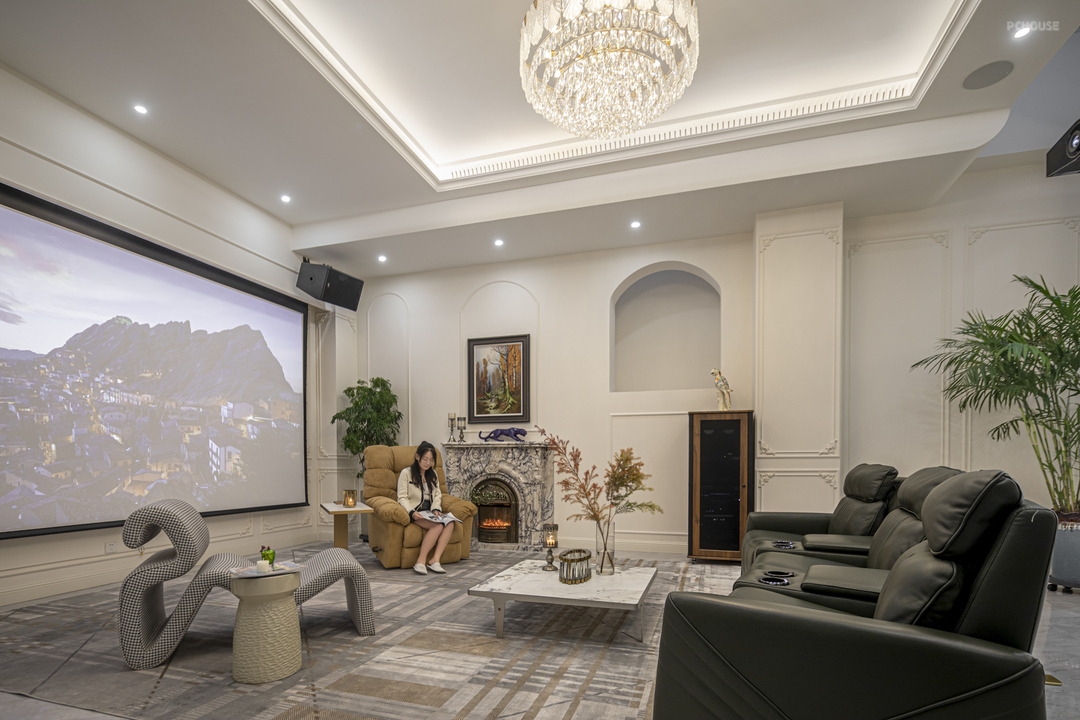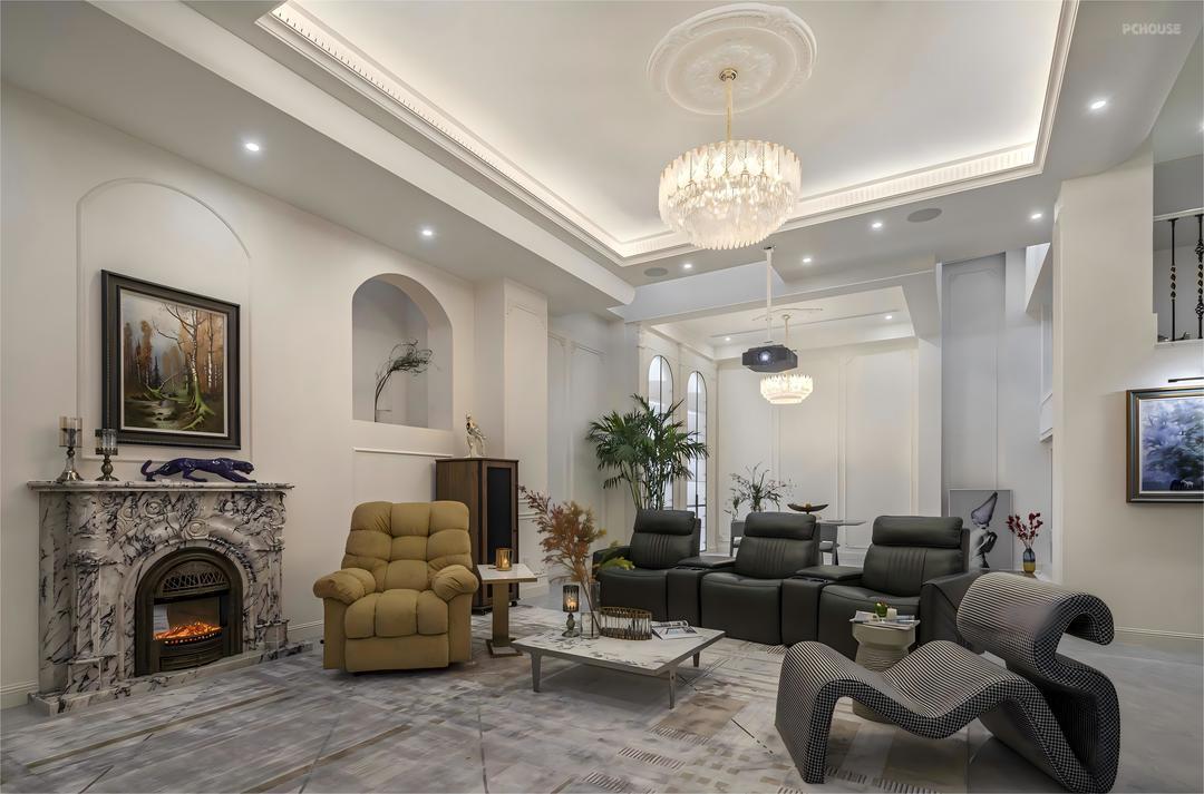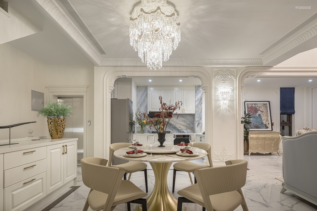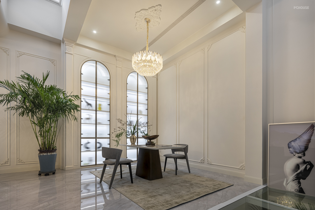 雕花石膏线精致,壁炉火光温暖,落日灯的光辉洒在墙上,一切细节构筑的氛围让人宛如置身闲适的法国庭院,清新自然而富有艺术气息,格调与仪式感都满到溢出空间。
