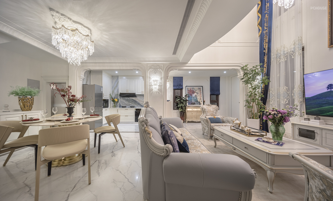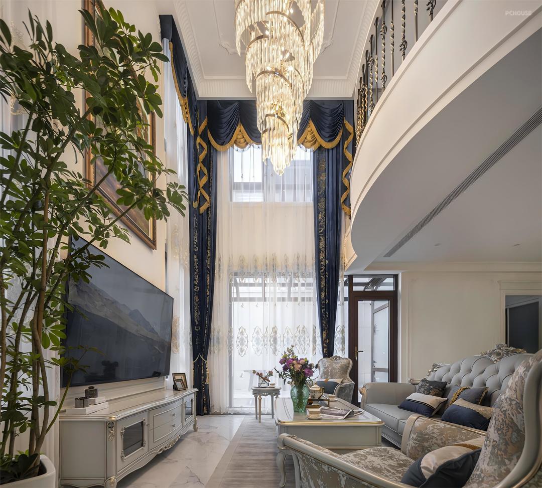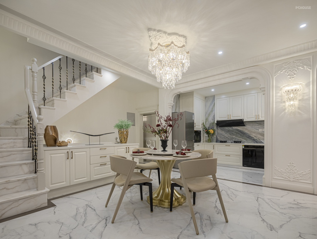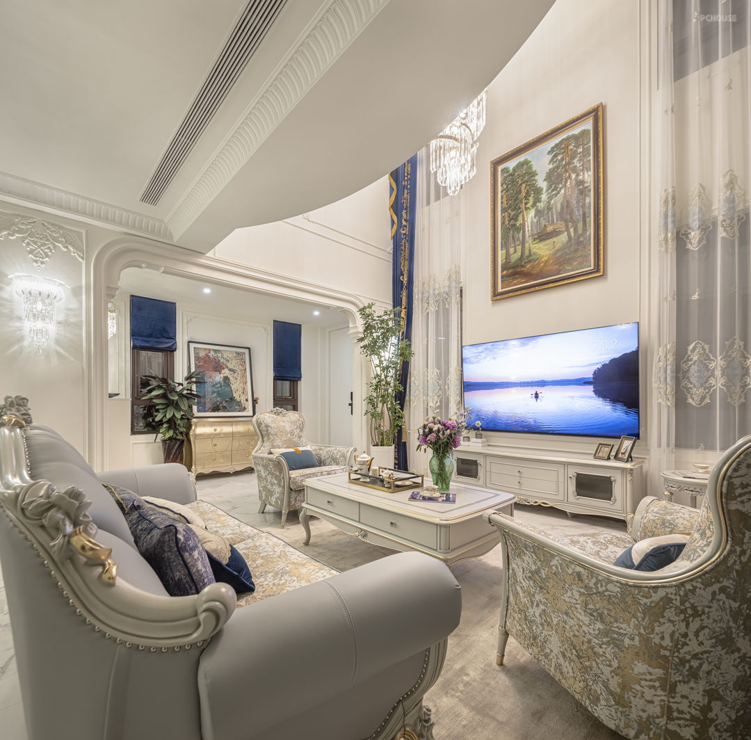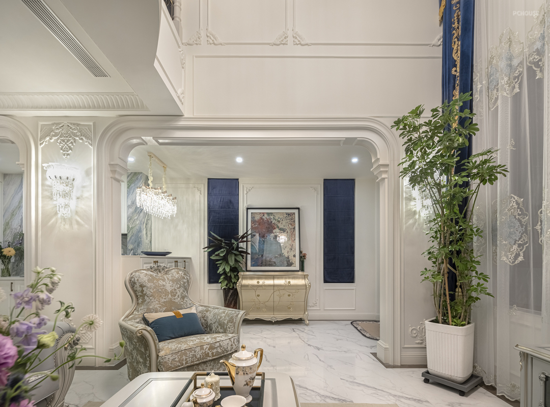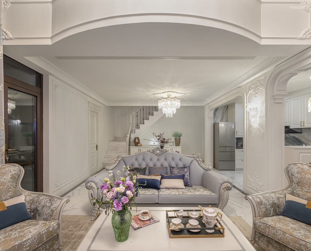 一进入客厅,就感受到空间的法式浪漫风情,整个客厅以淡奶油色为主,搭配暖白色系列家具。用经典石膏花纹装饰挑空电视背景墙,繁复的花纹塑造古典雅致。期待阳光正暖的午后,光影透过白色的纱帘穿过室内,让空间主人在艺术氛围里自在行走,享受惬意静谧、舒适的居家环境。
