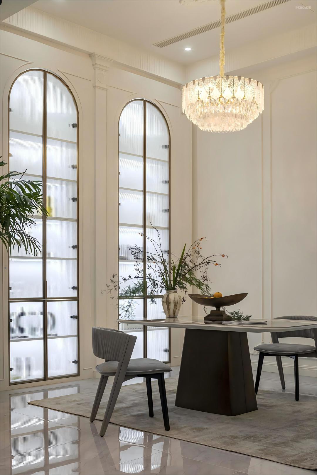 奶油裸色为空间的主色调,尽显低调的复古奢华,大理石餐桌与皮质餐椅搭配精致的器皿,在觥筹交错间诗意流淌。在这里既能感受浓厚的烟火气息,又能欣赏空间与艺术相融合的细节装饰。