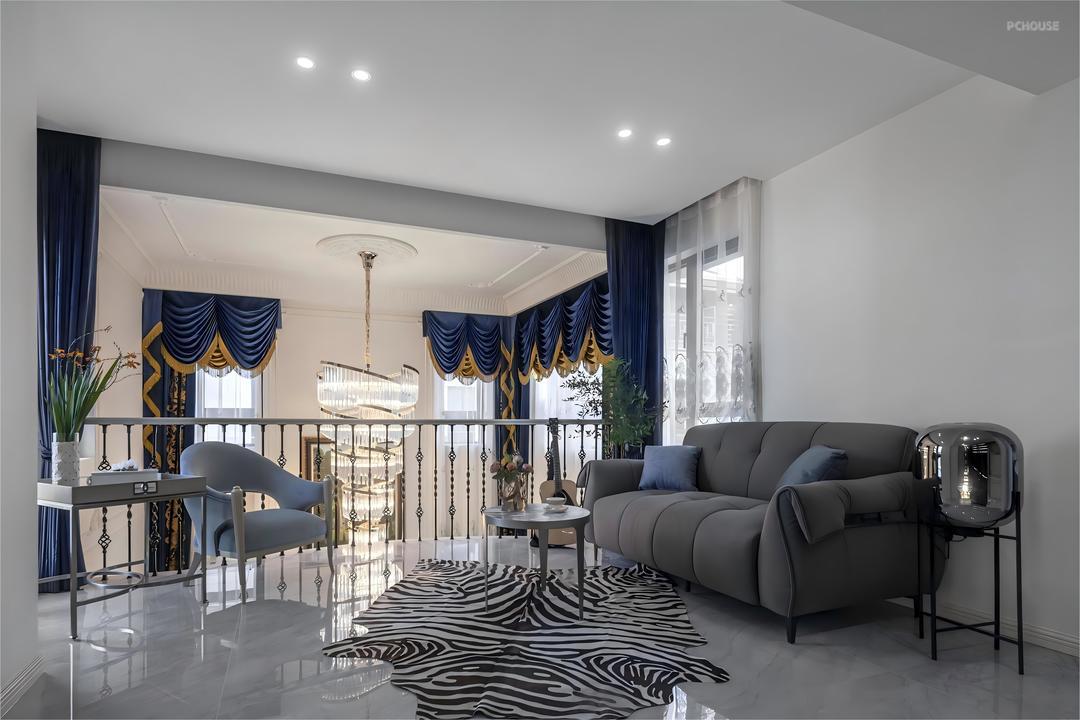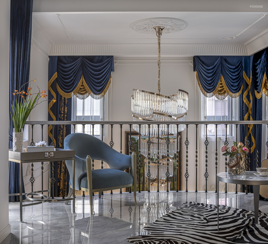 用丰富的娱乐场景,营造出愉悦的生活状态,辅以温柔的材质质感,石膏艺术装饰造型优雅而奢华。保留了经典法式的壁炉元素,通过明亮而纯粹的优雅蓝与纯净的奶油色来烘托法式的艺术空间氛围意图。