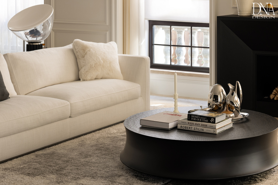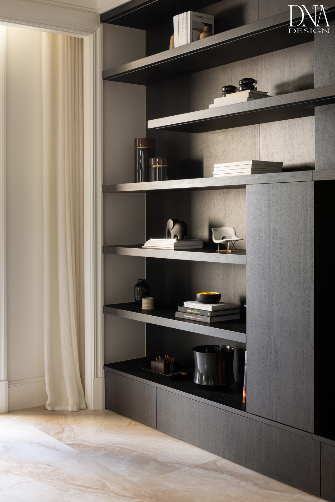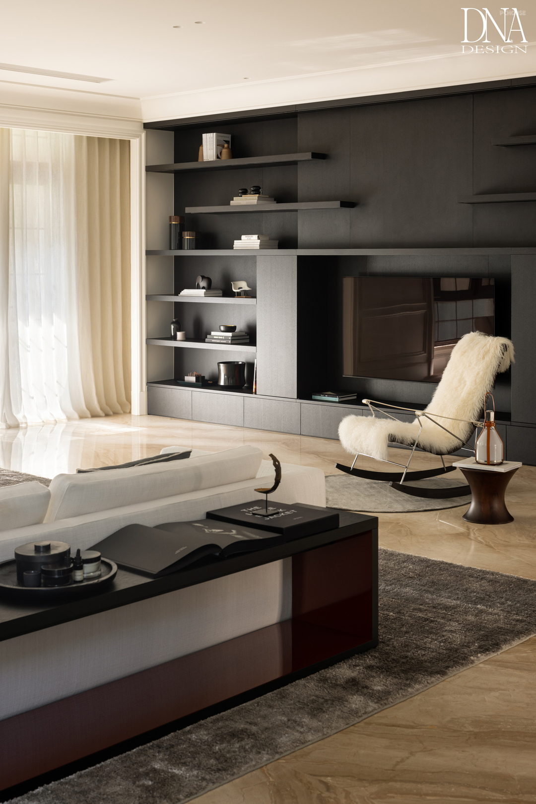 On the other side of the space, the large black display cabinet, which is symmetrical and well-proportioned. Integrating the TV function into it takes into account the dual needs of storage and decorative display.