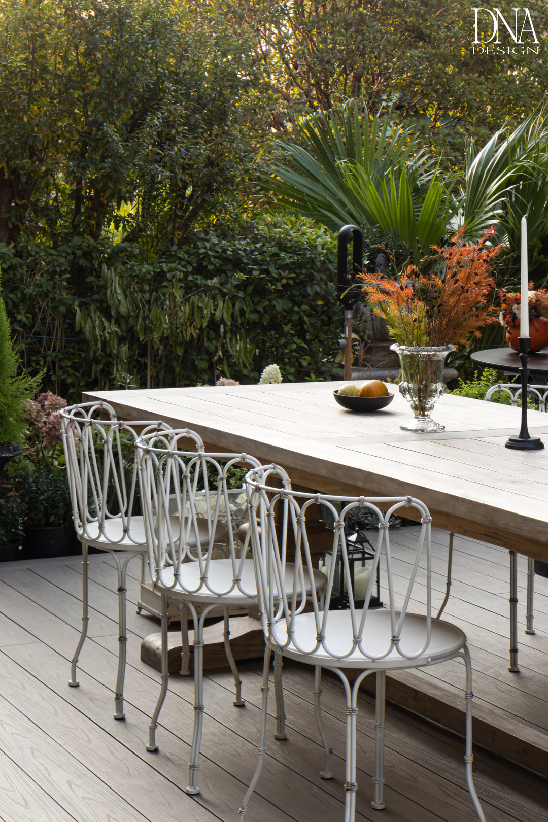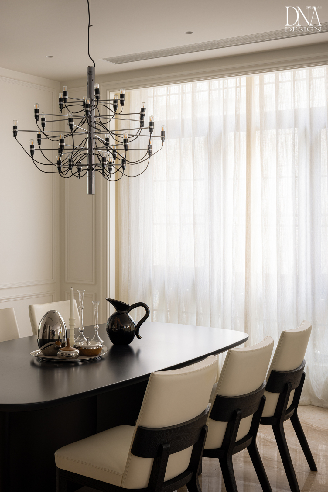 The dining chairs are from Robinson by Liaigre. Their design is inspired by ships and aims to combine the strength of sculptural wood with the elegance of refined leather. The Tobi-ishi dining table by B&B Italia is inspired by stone. Its "clumsy" sculptural feel contrasts with the delicate chandeliers and chairs. We are very good at integrating furniture brands of different styles in our design.